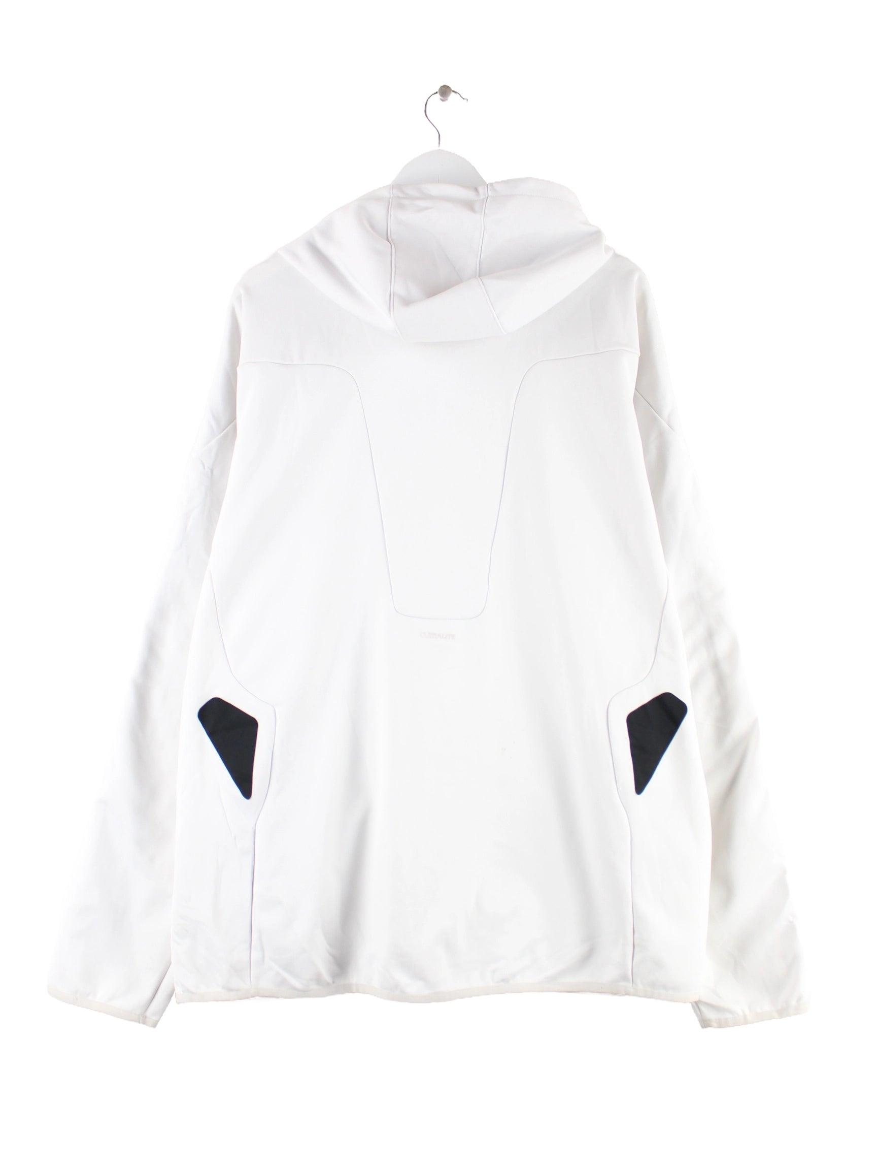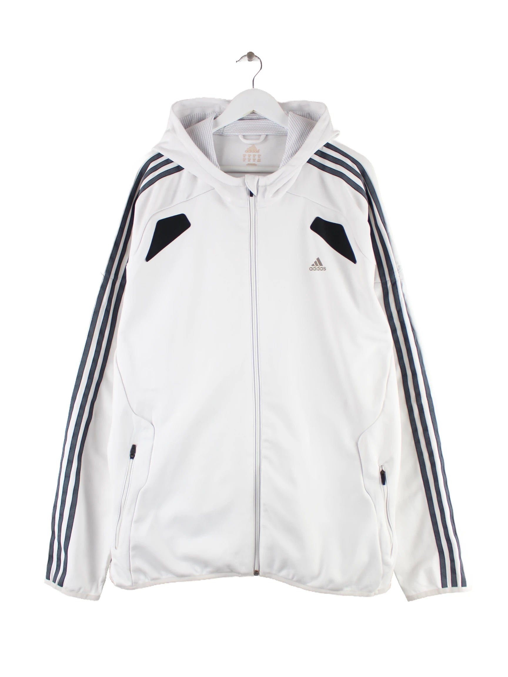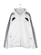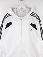 Weißer Hoodie mit Zip der Marke Adidas in Größe XXL. Er ist aus Synthetik gefertigt und in gutem Zustand bei uns zu bekommen.