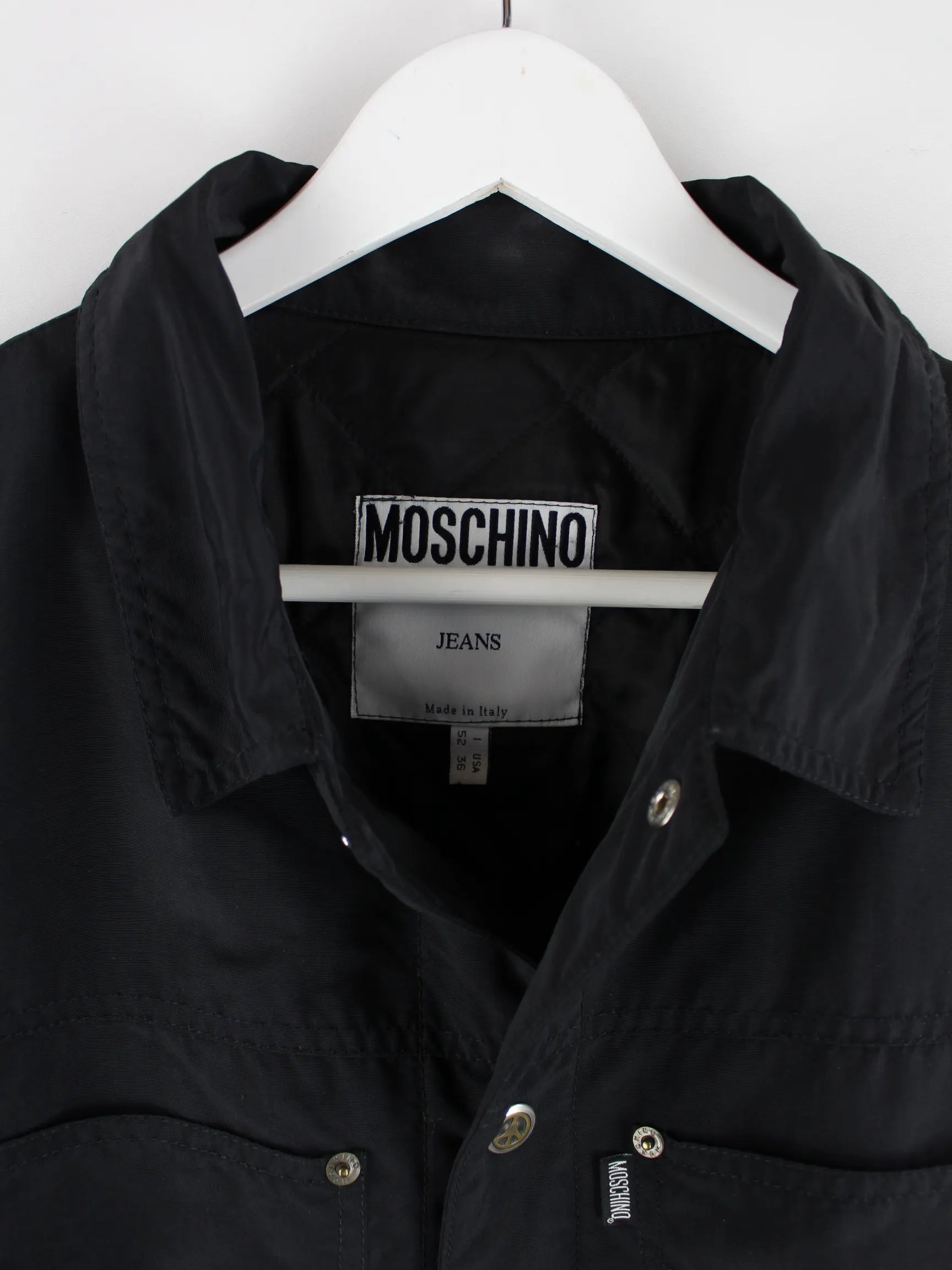 Schwarze Leichte Jacke von Moschino aus den 90'ern in Größe M. Sie ist aus Synthetik produziert und in sehr gutem Zustand zu bekommen.