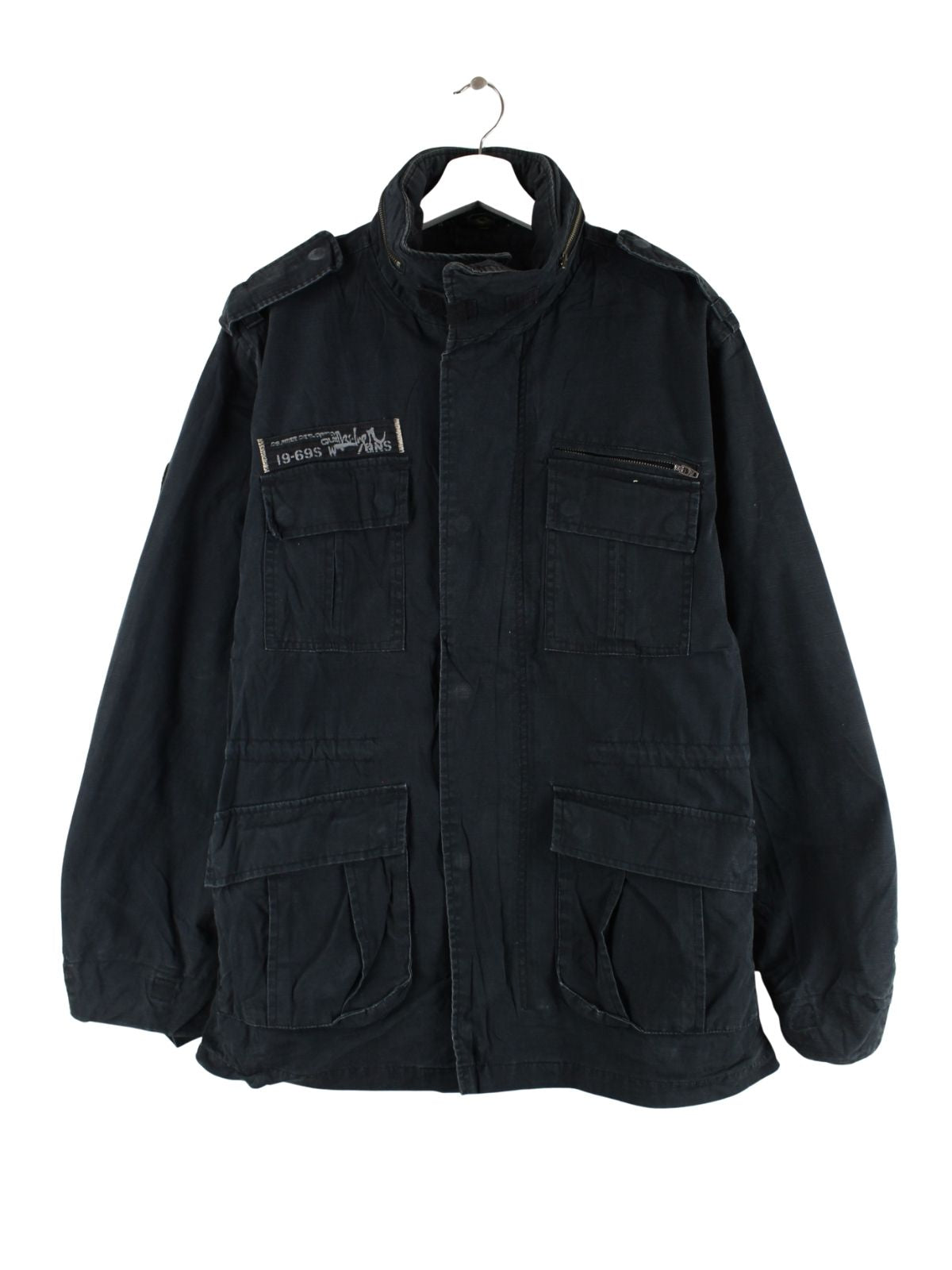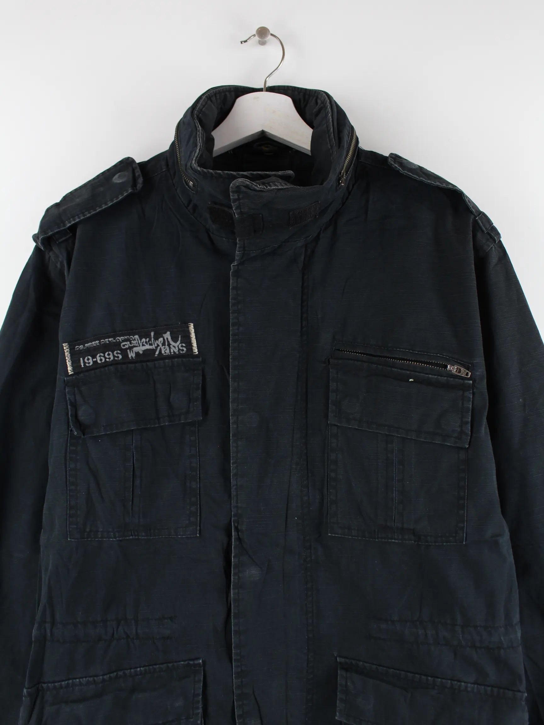 Schwarze Leichte Jacke vom Brand Quiksilver aus den 90'ern in Größe L. Sie ist aus einer Baumwollmischung gefertigt und in gutem Zustand bei uns zu bekommen.