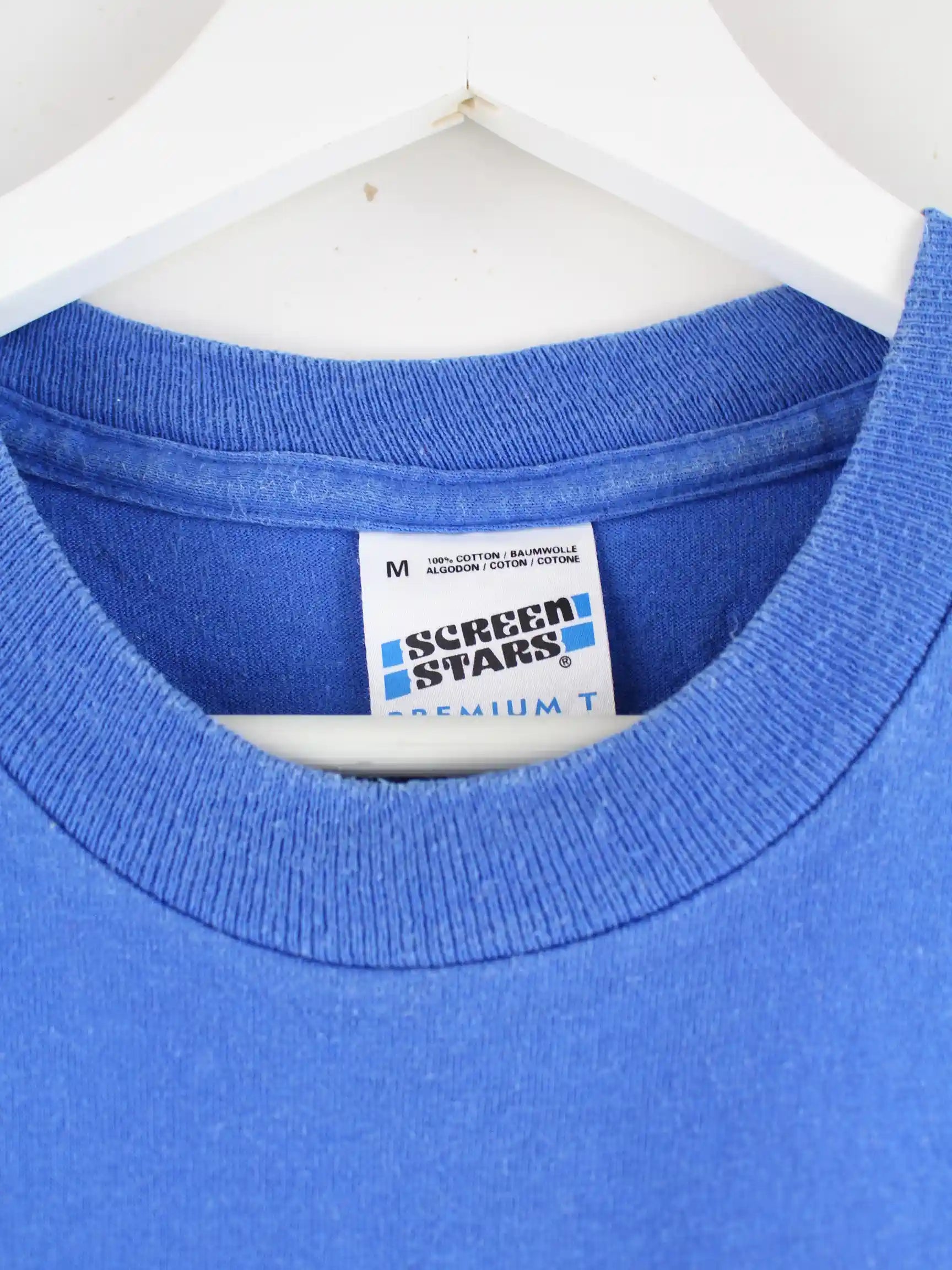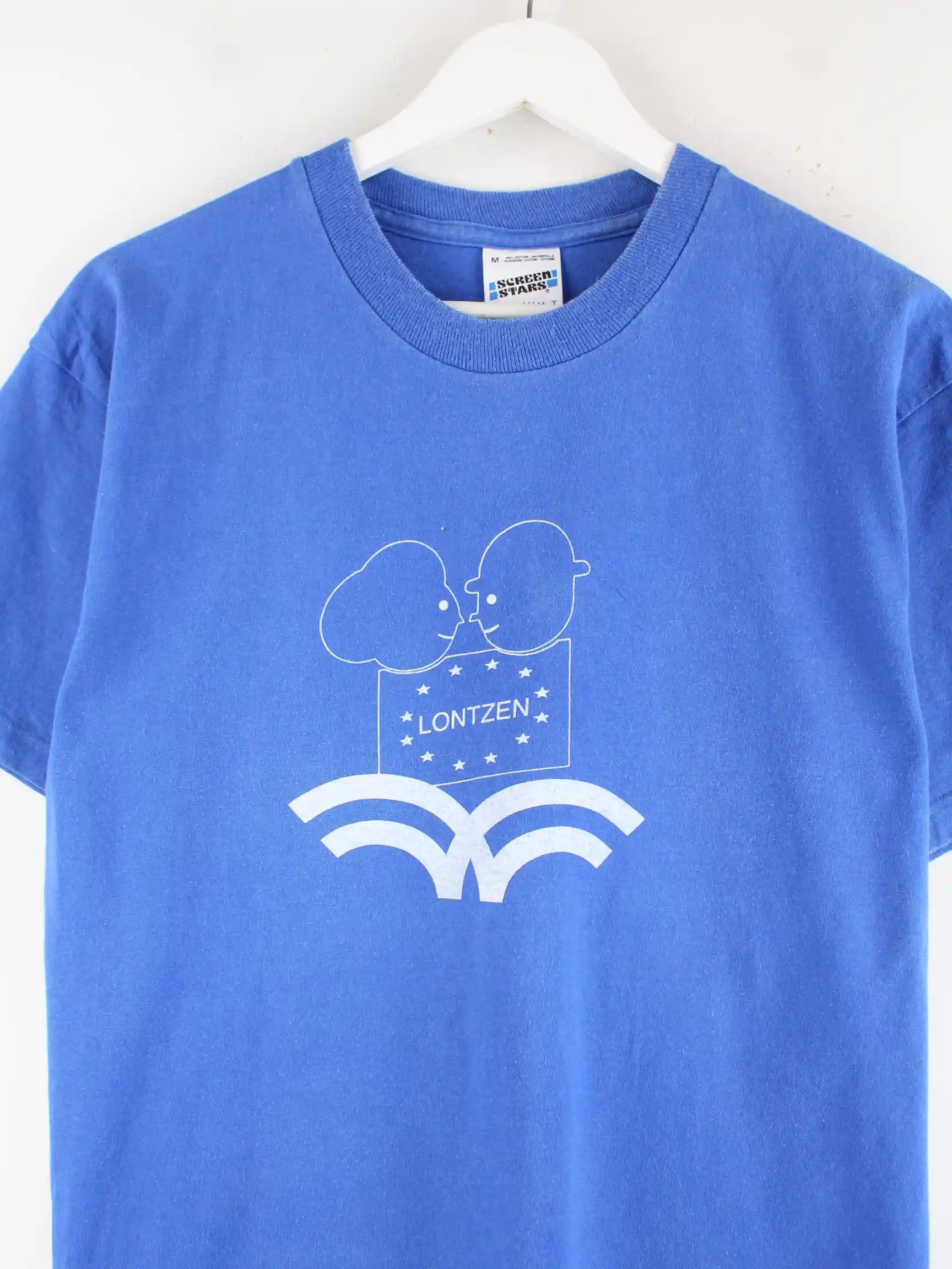 T-Shirt der Marke Screen Stars in Größe M aus den 90'ern. Es ist aus Baumwolle hergestellt und in Blau in Stock. Mit schönem Lontzen Print.