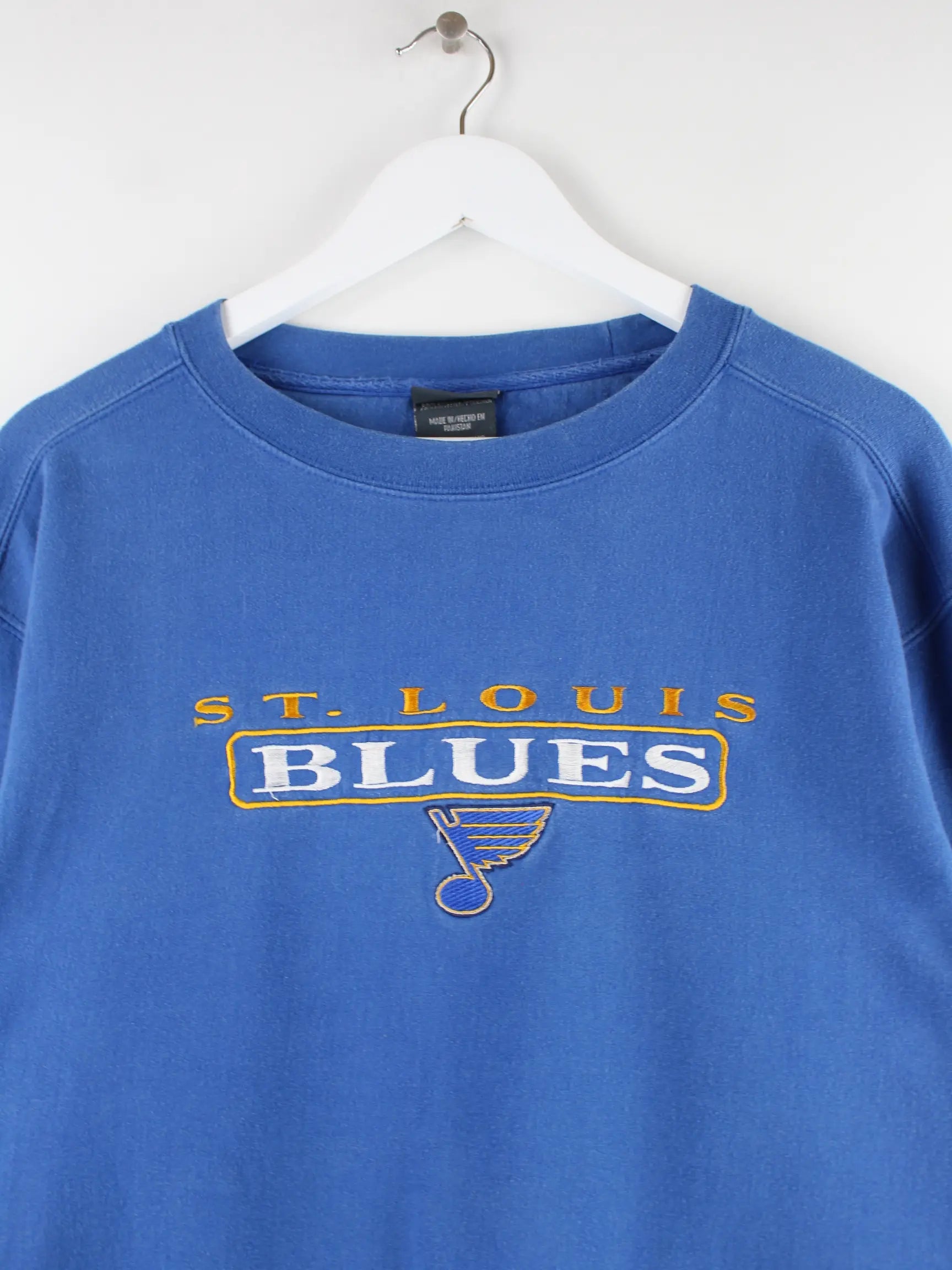 Vintage Sweater in Größe M. Er ist aus einer Baumwollmischung gemacht und in Blau zu haben.