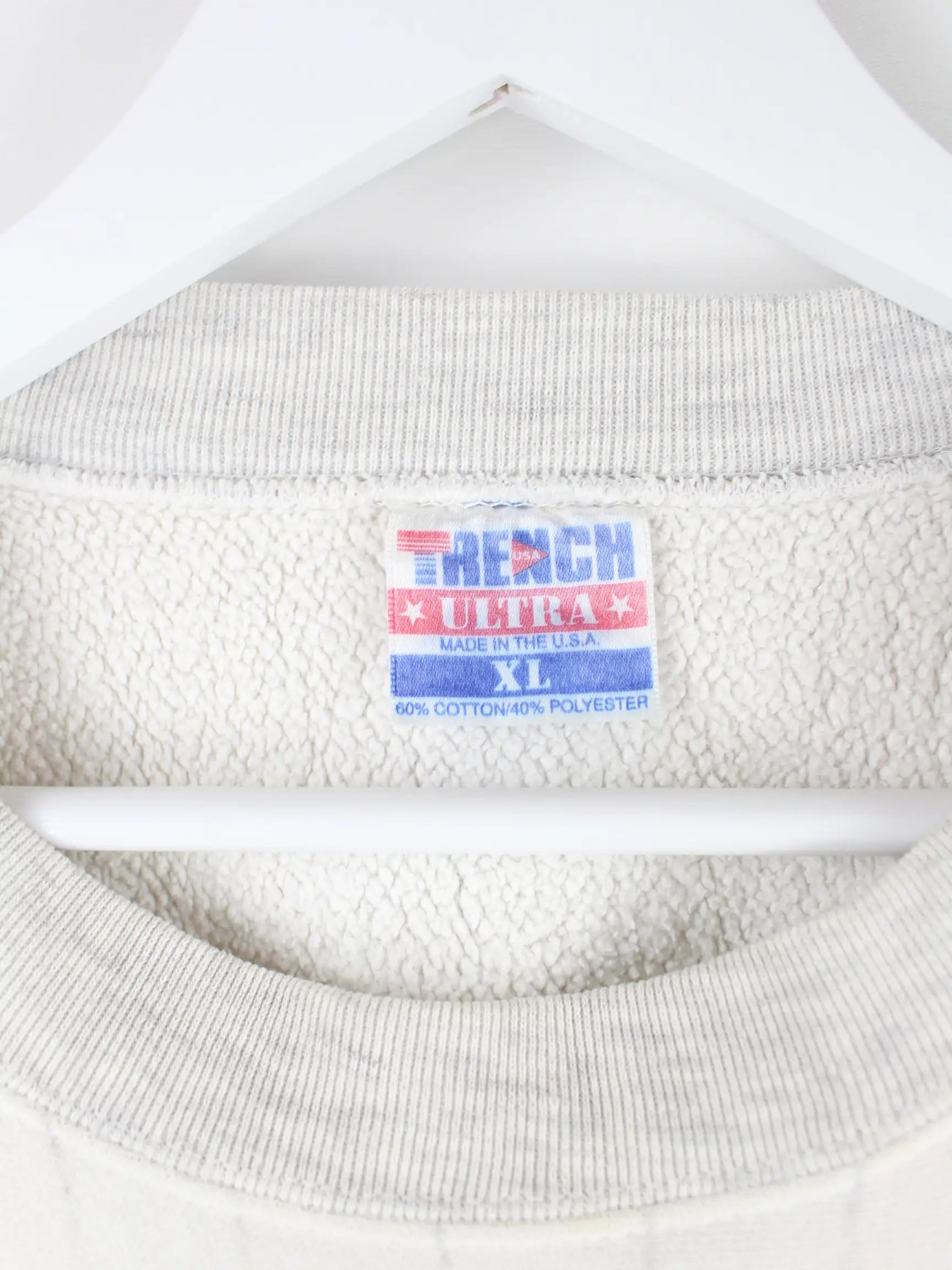 Grauer Vintage Sweater in Größe XL. Er ist aus einer Baumwollmischung gefertigt. Den Zustand würden wir als 'In Ordnung' bezeichnen (vergl. Bilder).Mit schickem Champions Print.