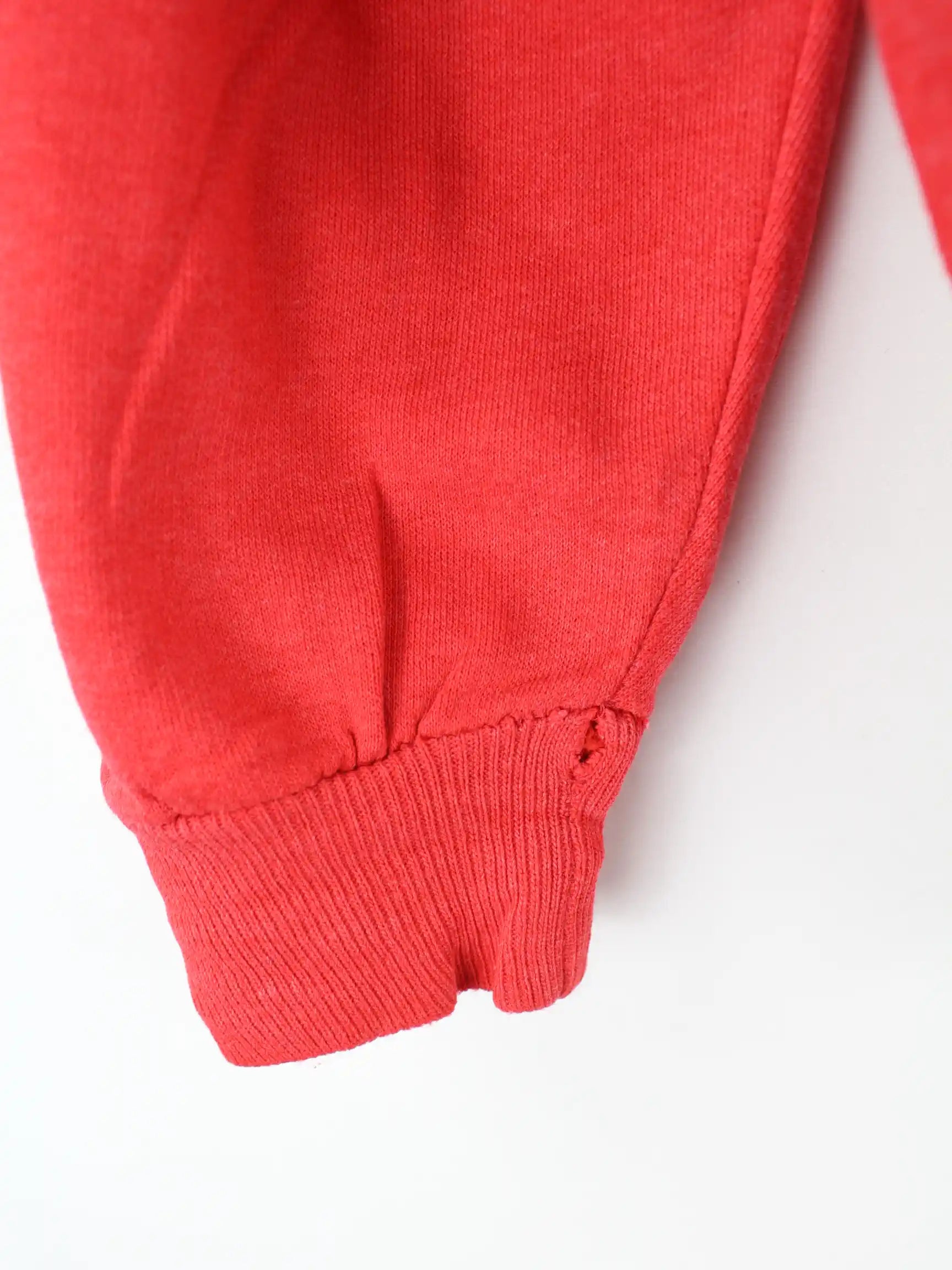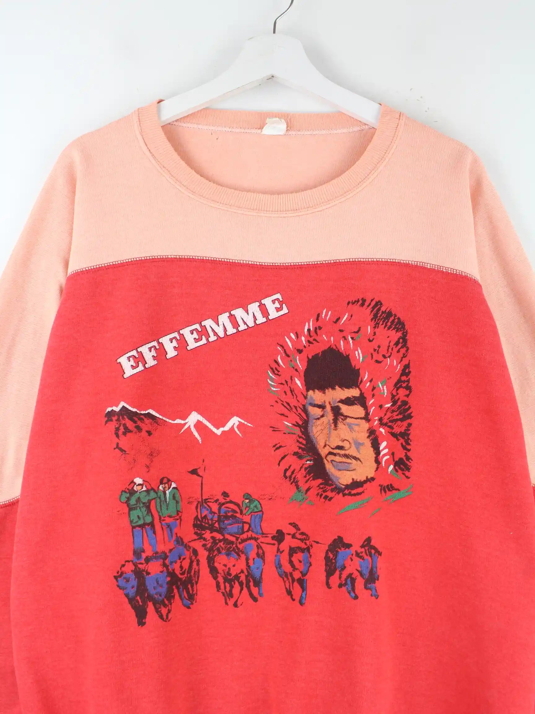 Roter Vintage Sweater aus den 80'ern in Größe L. Er ist aus einer Baumwollmischung produziert und in gutem Zustand auf Lager. Mit seltenem Inuit Print.