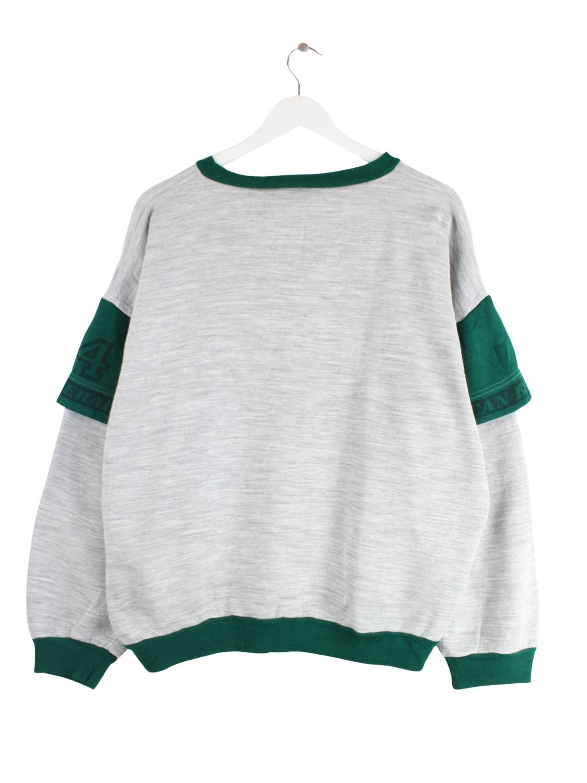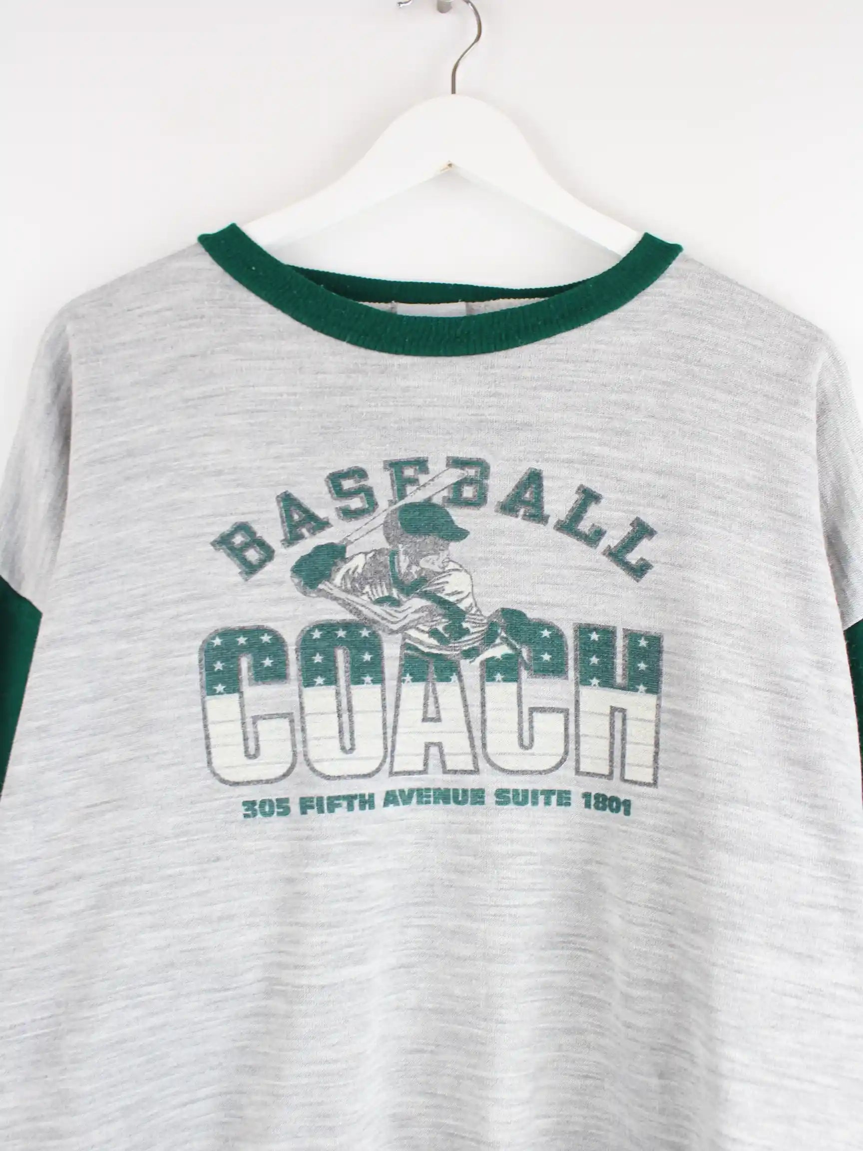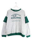 Vintage Sweater in Größe S aus den 90'ern. Er ist aus einer Baumwollmischung gefertigt und in Grau im Bestand. Mit schönem Baseball Print.