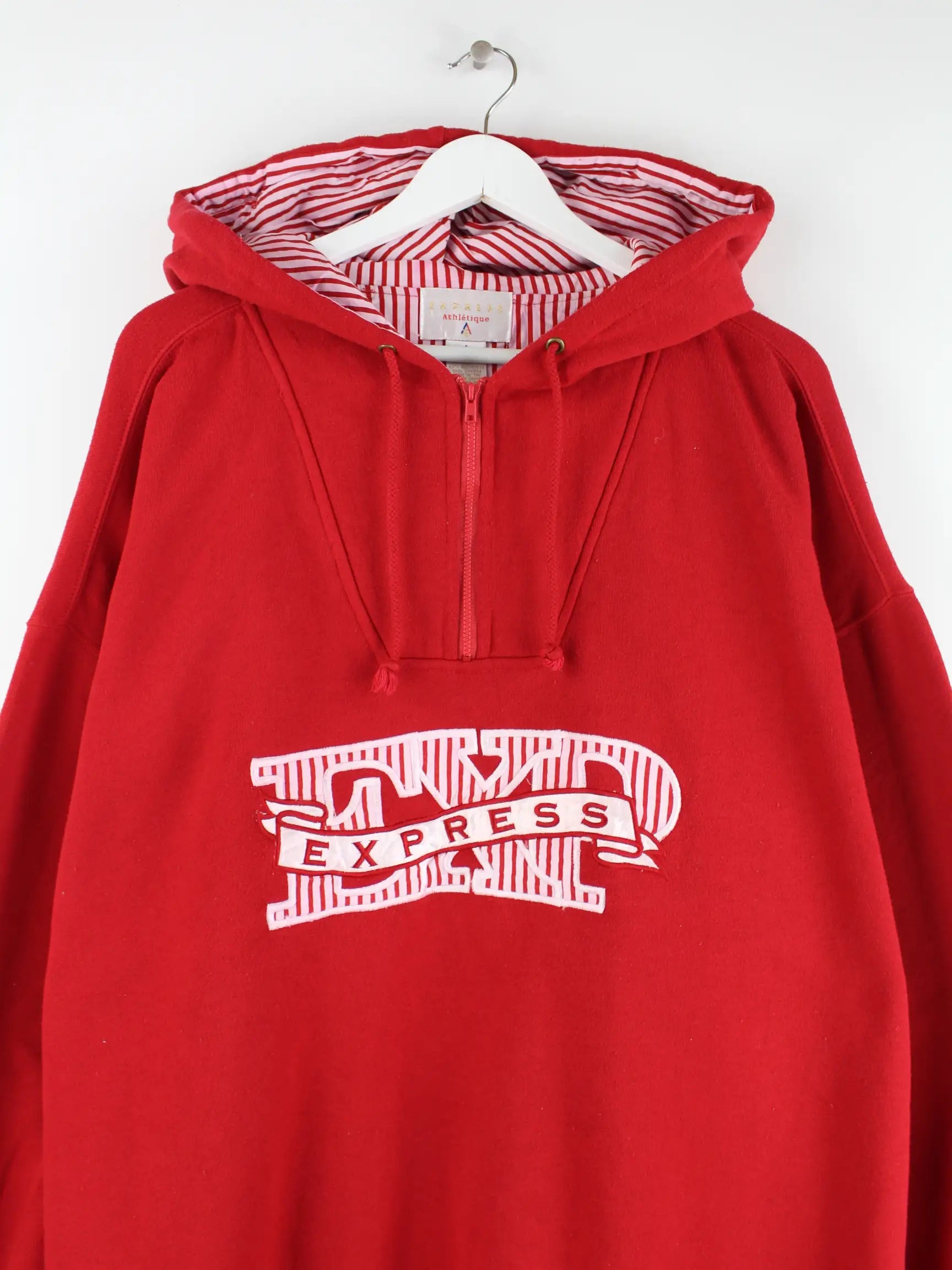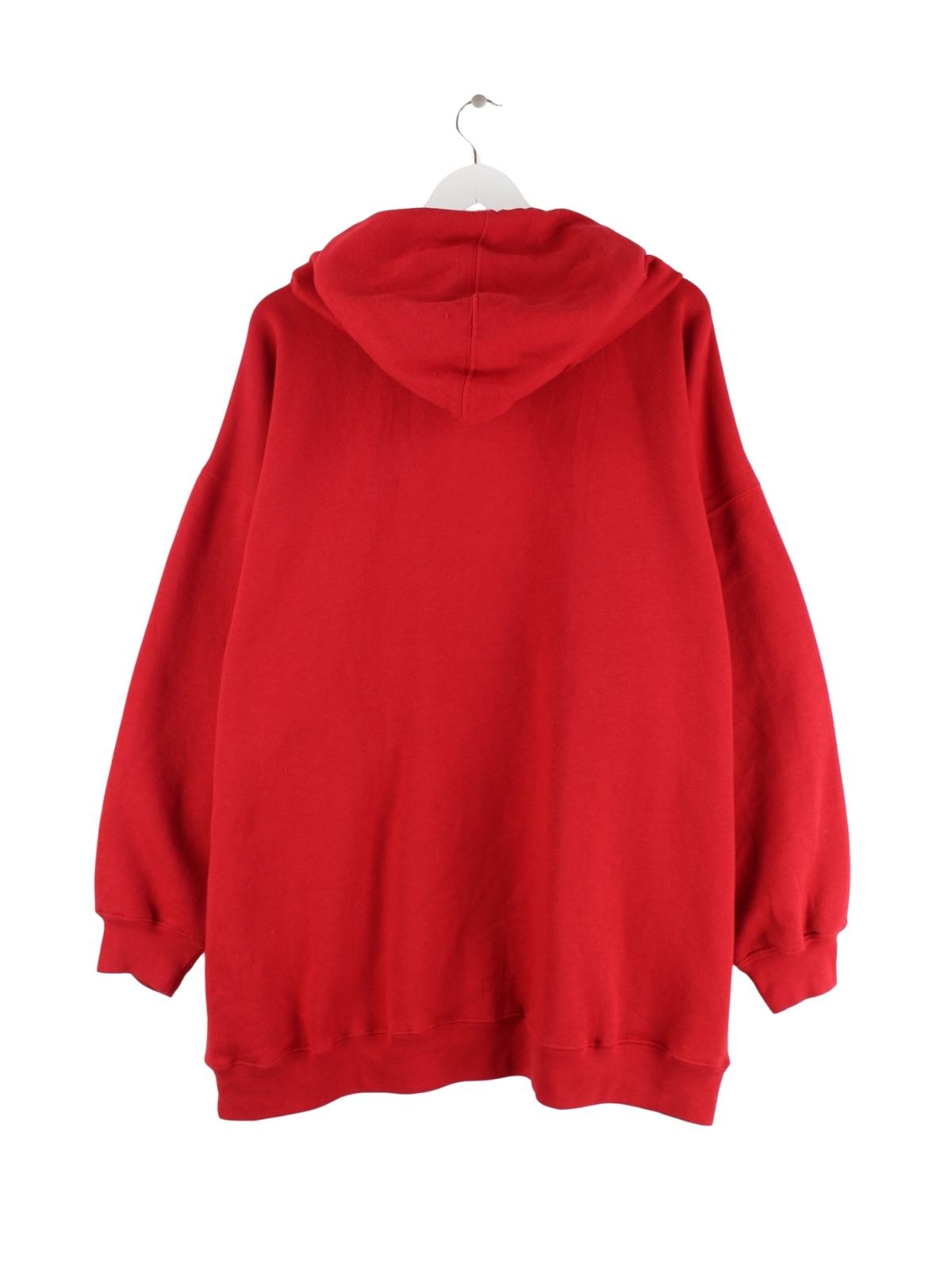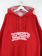 Roter Vintage Hoodie mit half Zip aus den 90'ern in Größe 3XL. Er ist aus einer Baumwollmischung gemacht und in sehr gutem Zustand bei uns zu bekommen.
