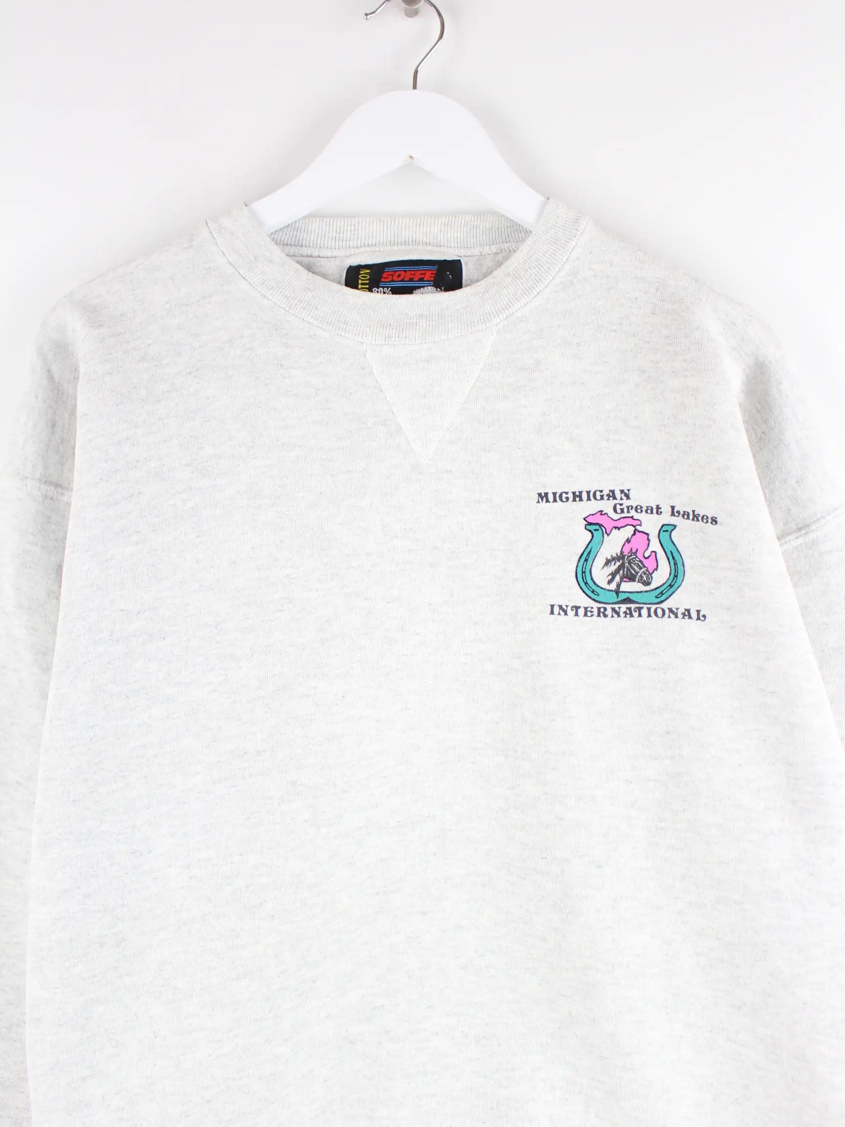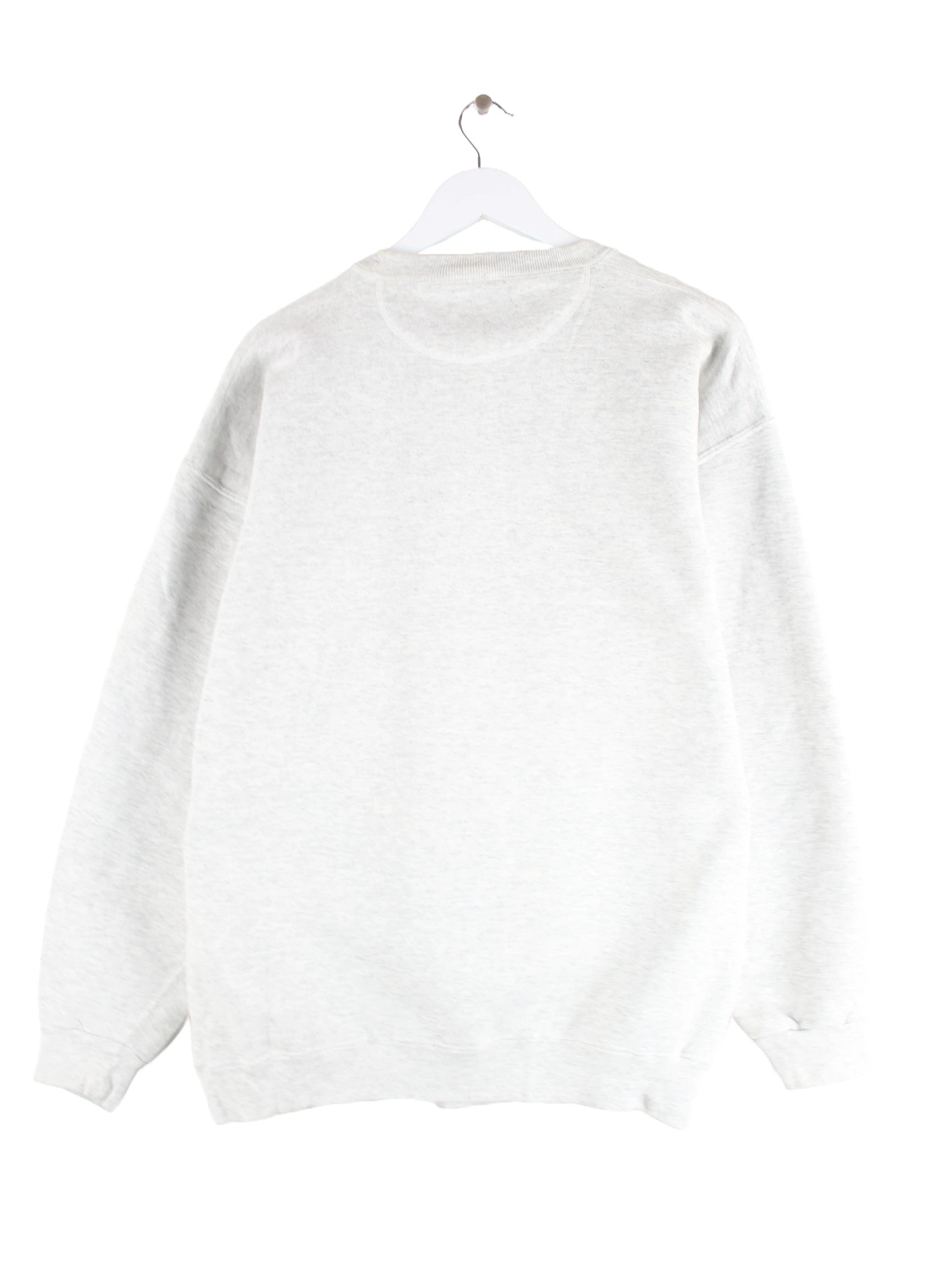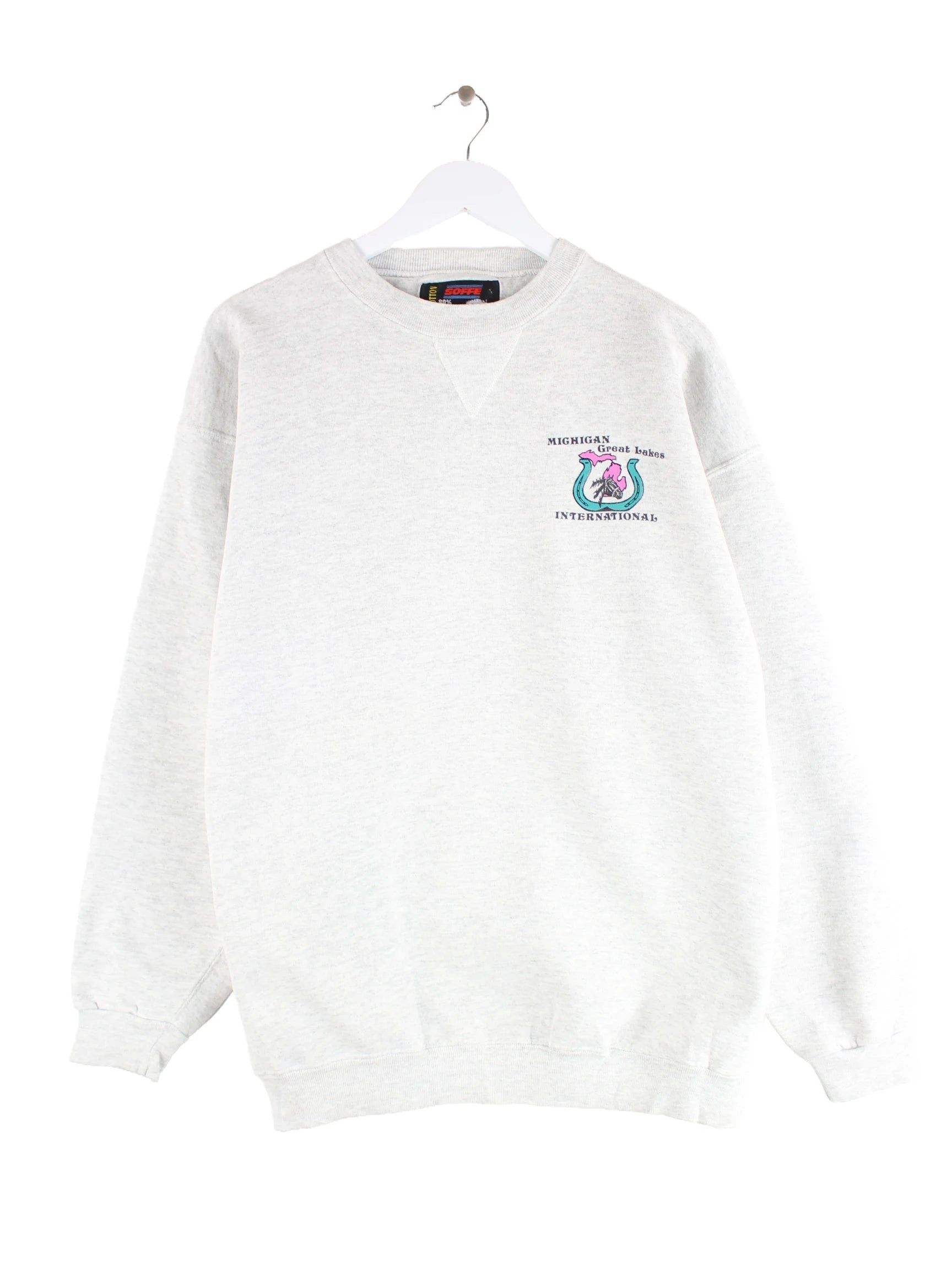 Grauer Vintage Sweater aus den 90'ern in Größe XL. Er ist aus einer Baumwollmischung produziert und in sehr gutem Zustand im Angebot. Mit tollem Michigan Print.
