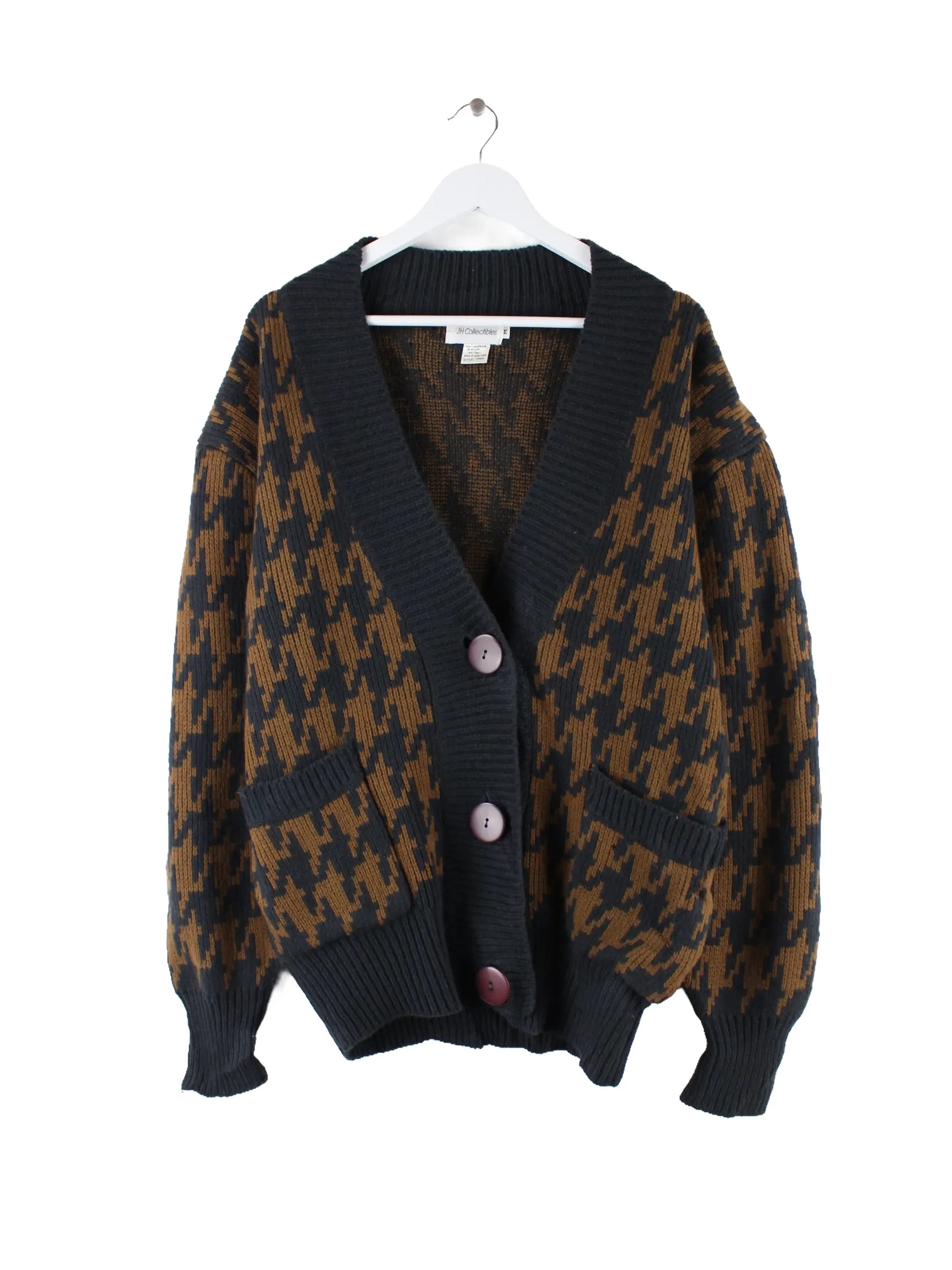 Vintage Strickjacke in Größe XXL aus den 90'ern. Sie ist aus einer Wollmischung angefertigt und in Braun vorrätig.