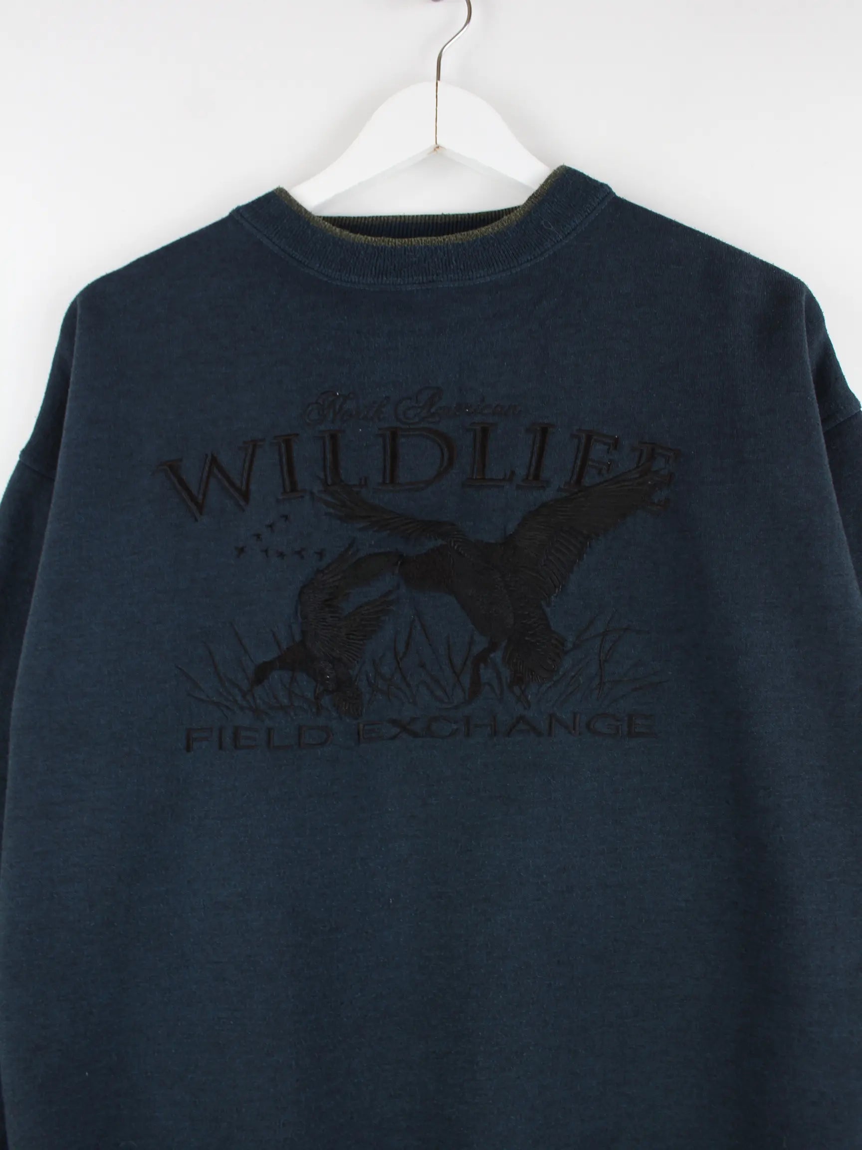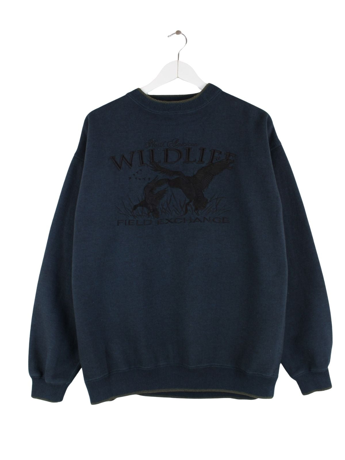 Vintage Sweater in Größe L aus den 90'ern. Er ist aus einer Baumwollmischung gefertigt und in Blau in Stock.