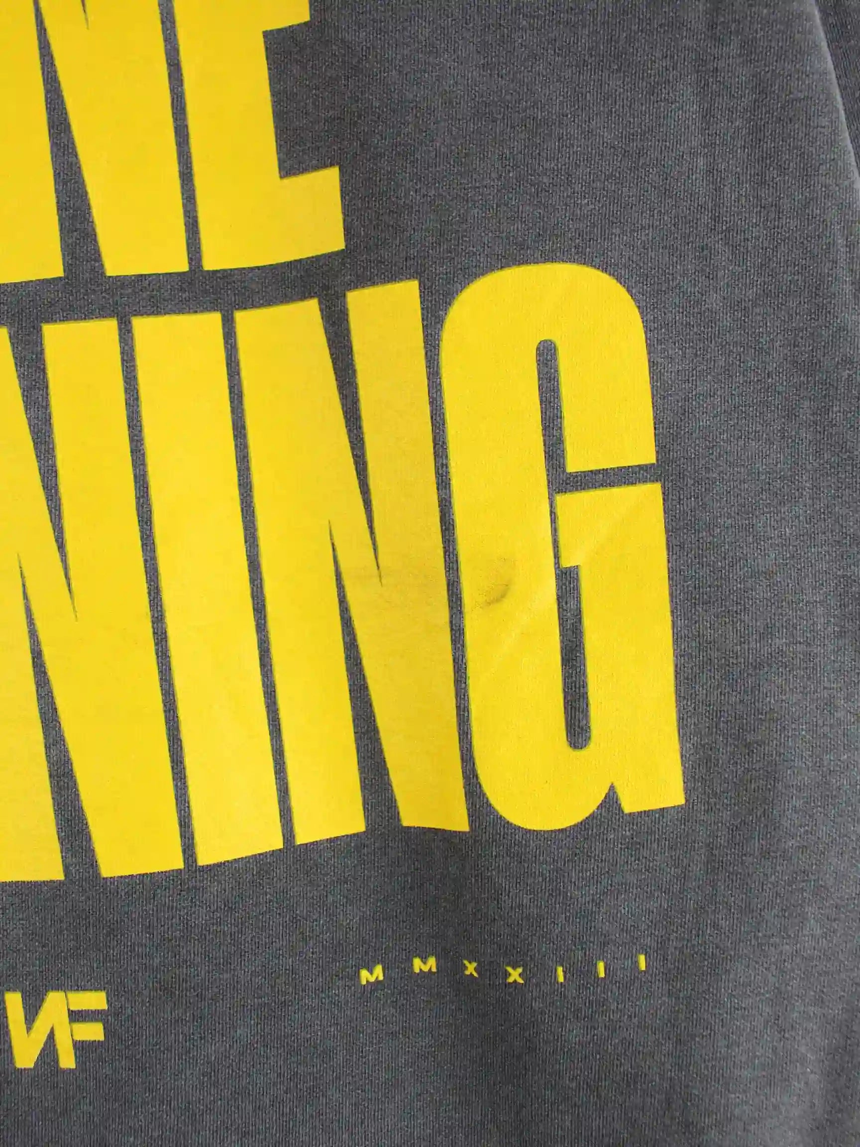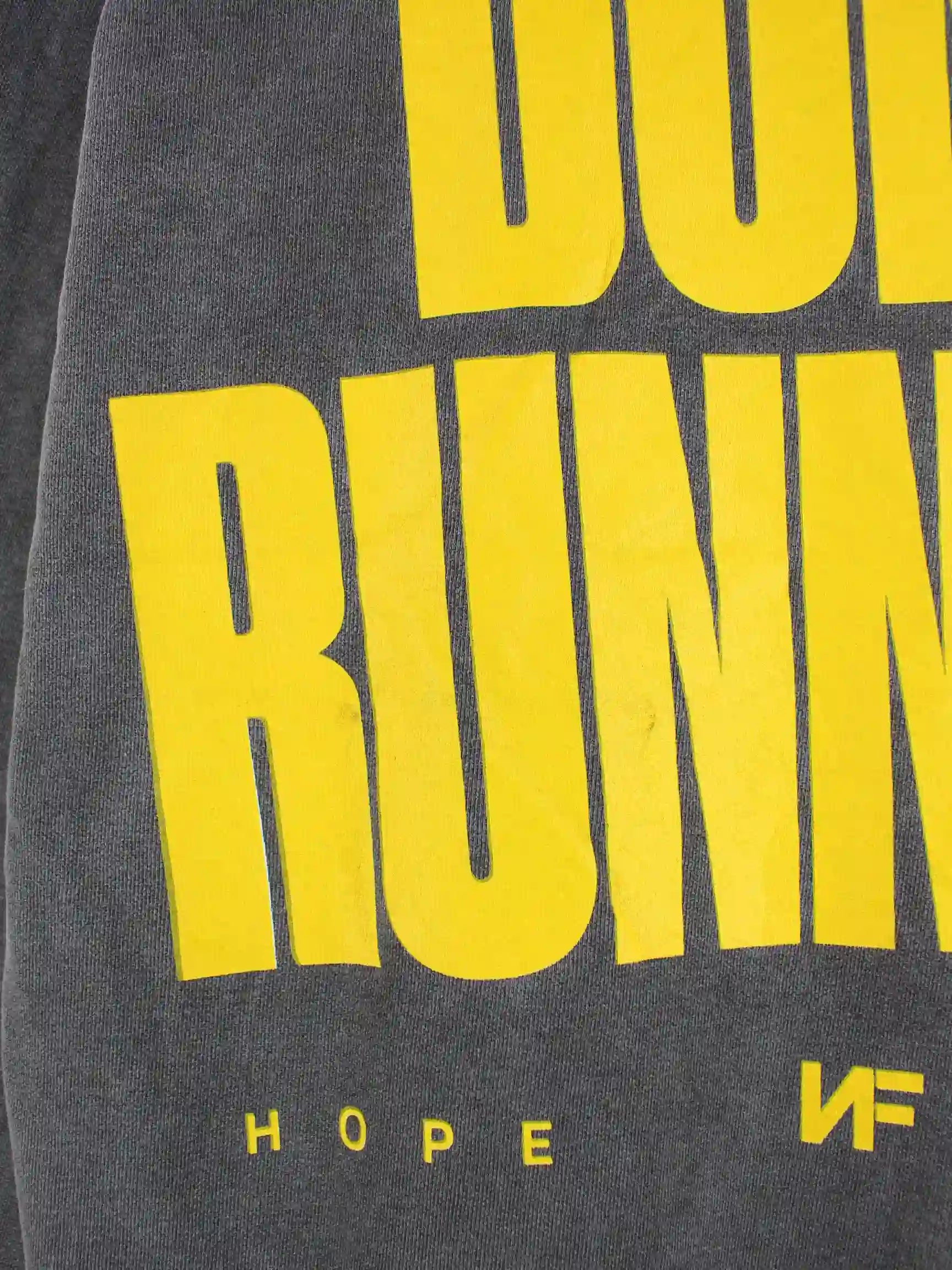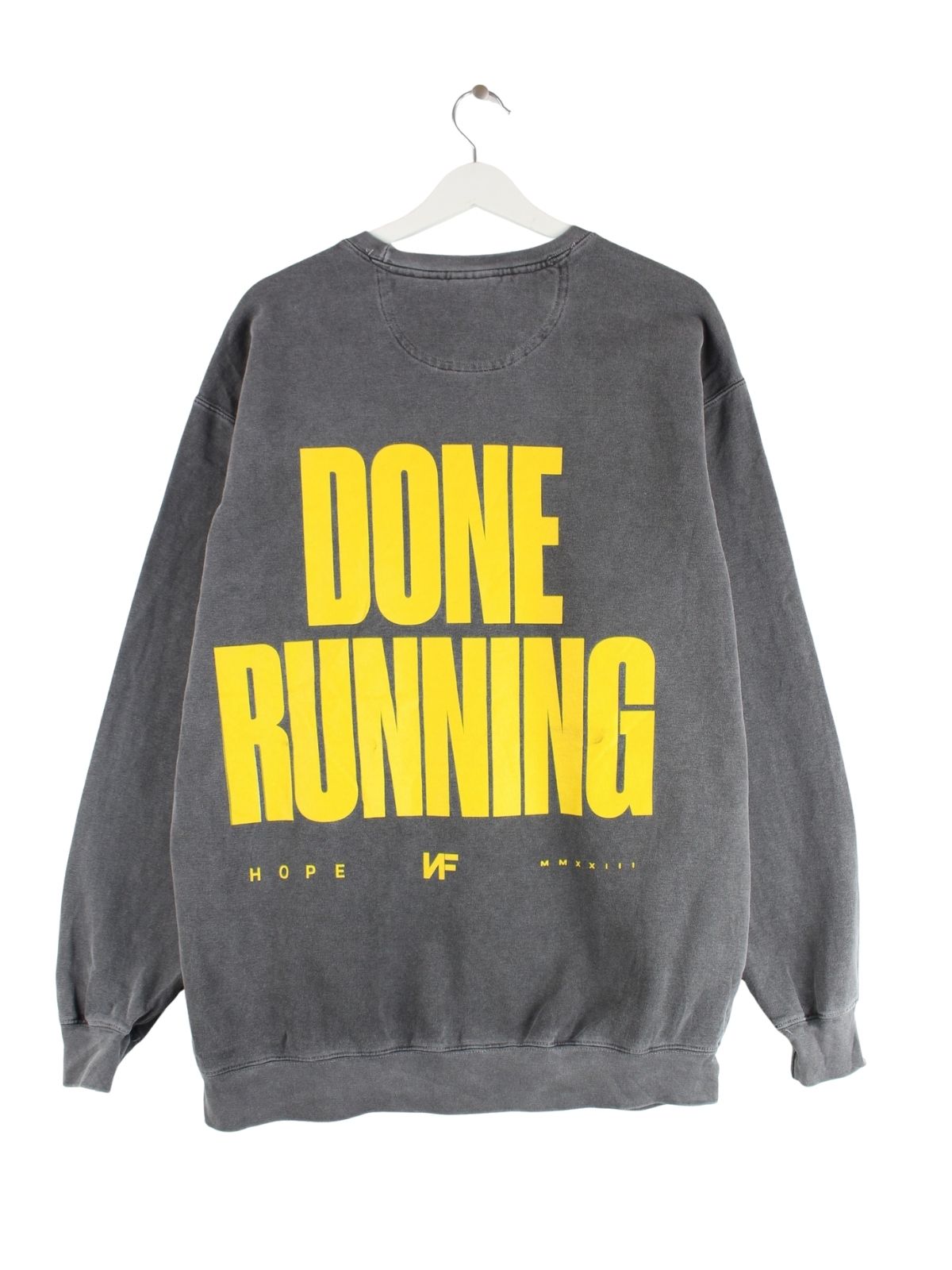 Vintage Sweater in Größe L. Er ist aus einer Baumwollmischung und in Grau lieferbar. Mit tollem Running Print.