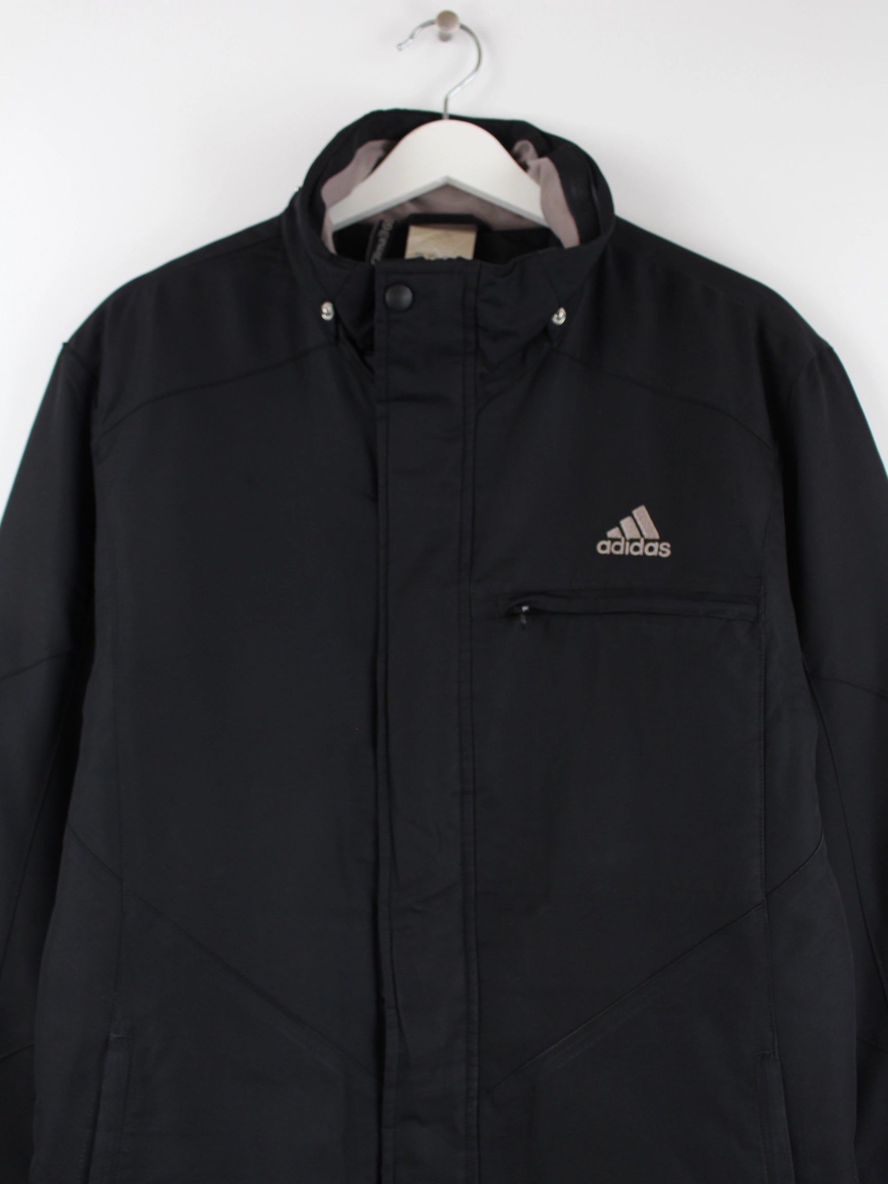 Schwarze Jacke der Brand Adidas in Größe L. Sie ist aus Synthetik produziert und in sehr gutem Zustand lieferbar.