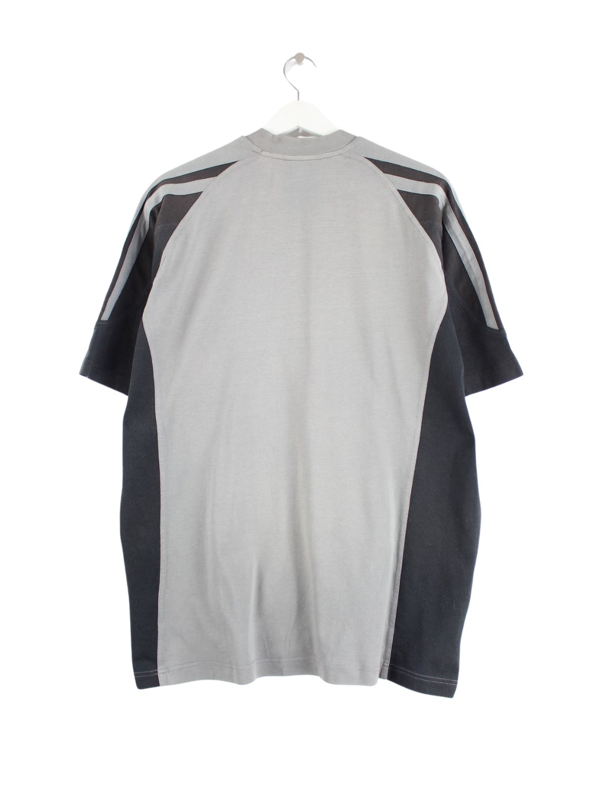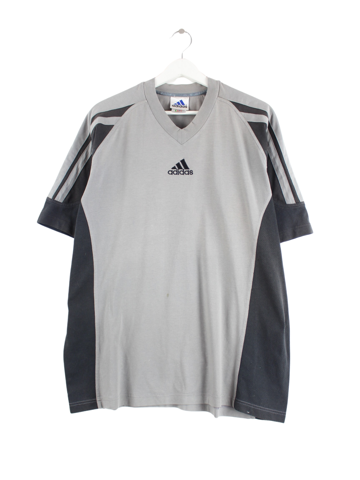 Grey T-shirt with embroidered logo from the Adidas label from the 90's in size XL. It is made of mixed fabric and is in stock in good condition.