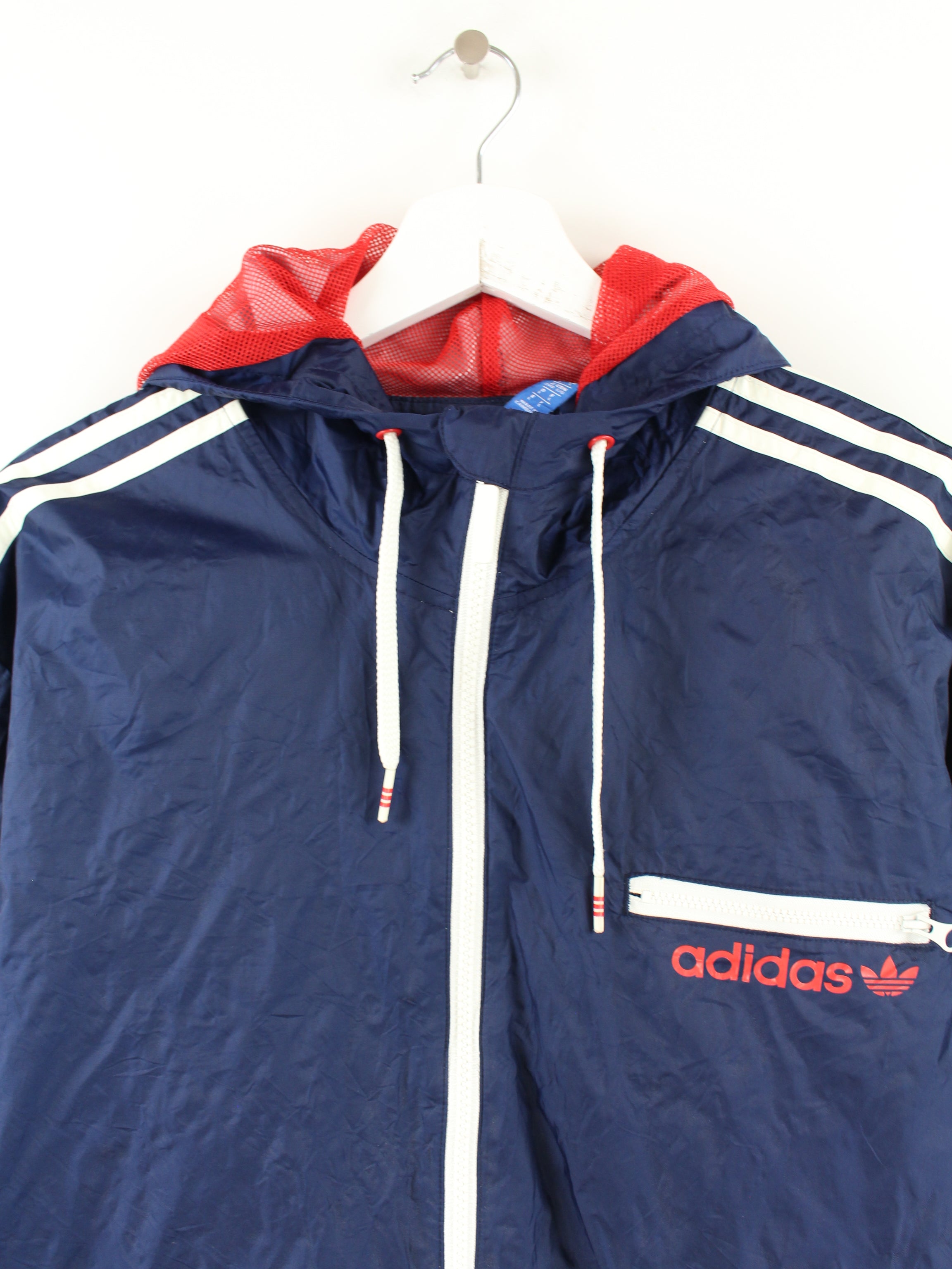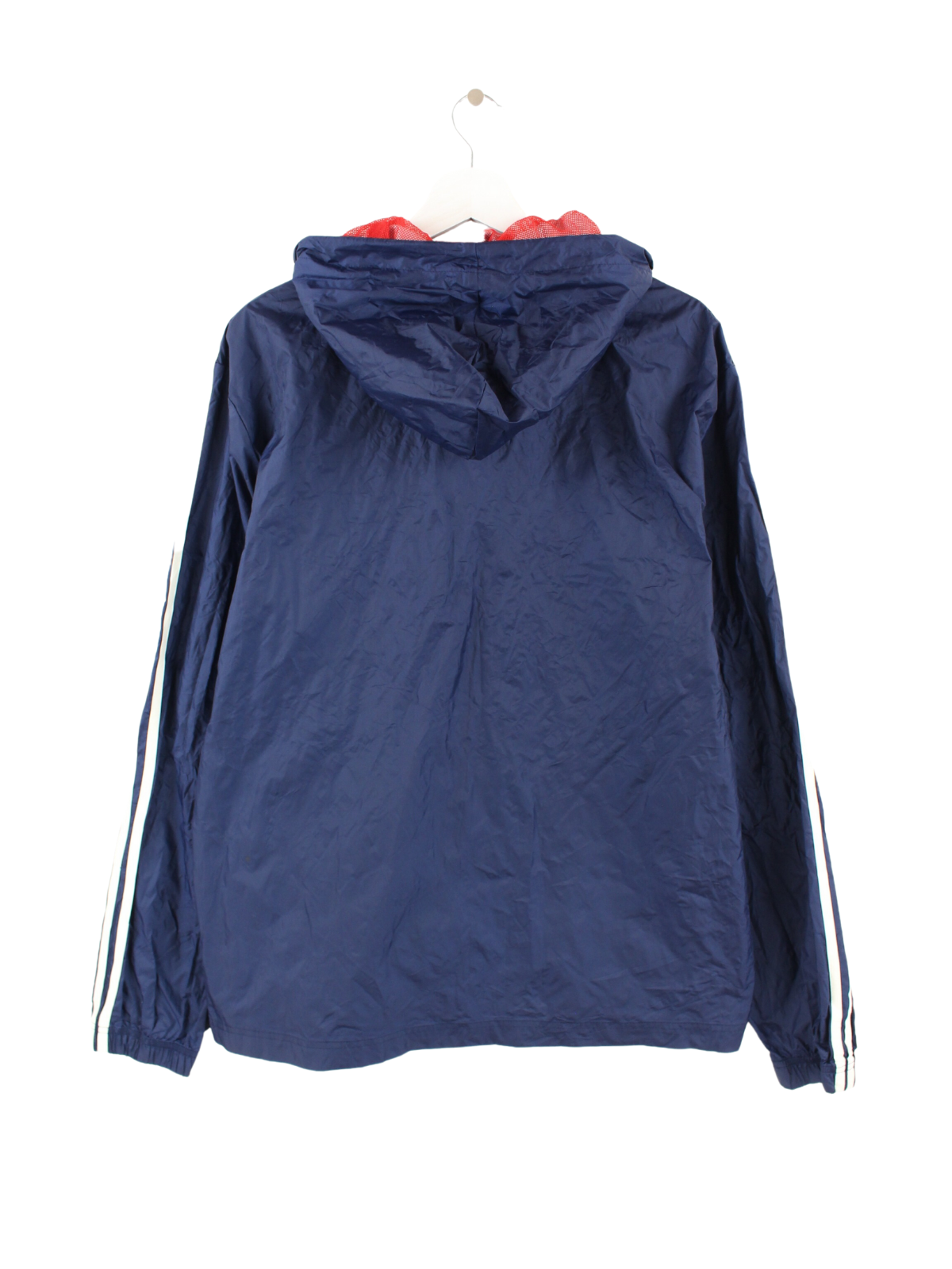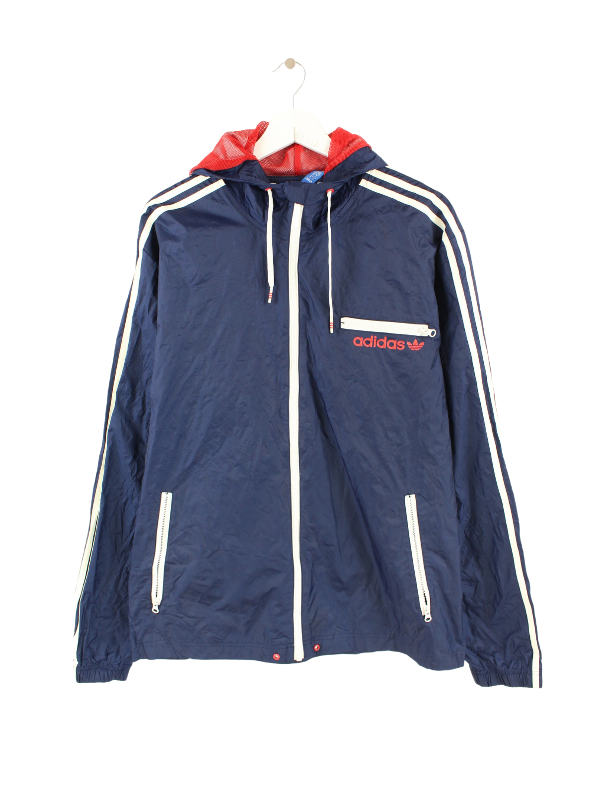 Blue wind jacket from Adidas with the typical three stripes on the sleeves.
