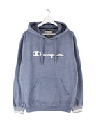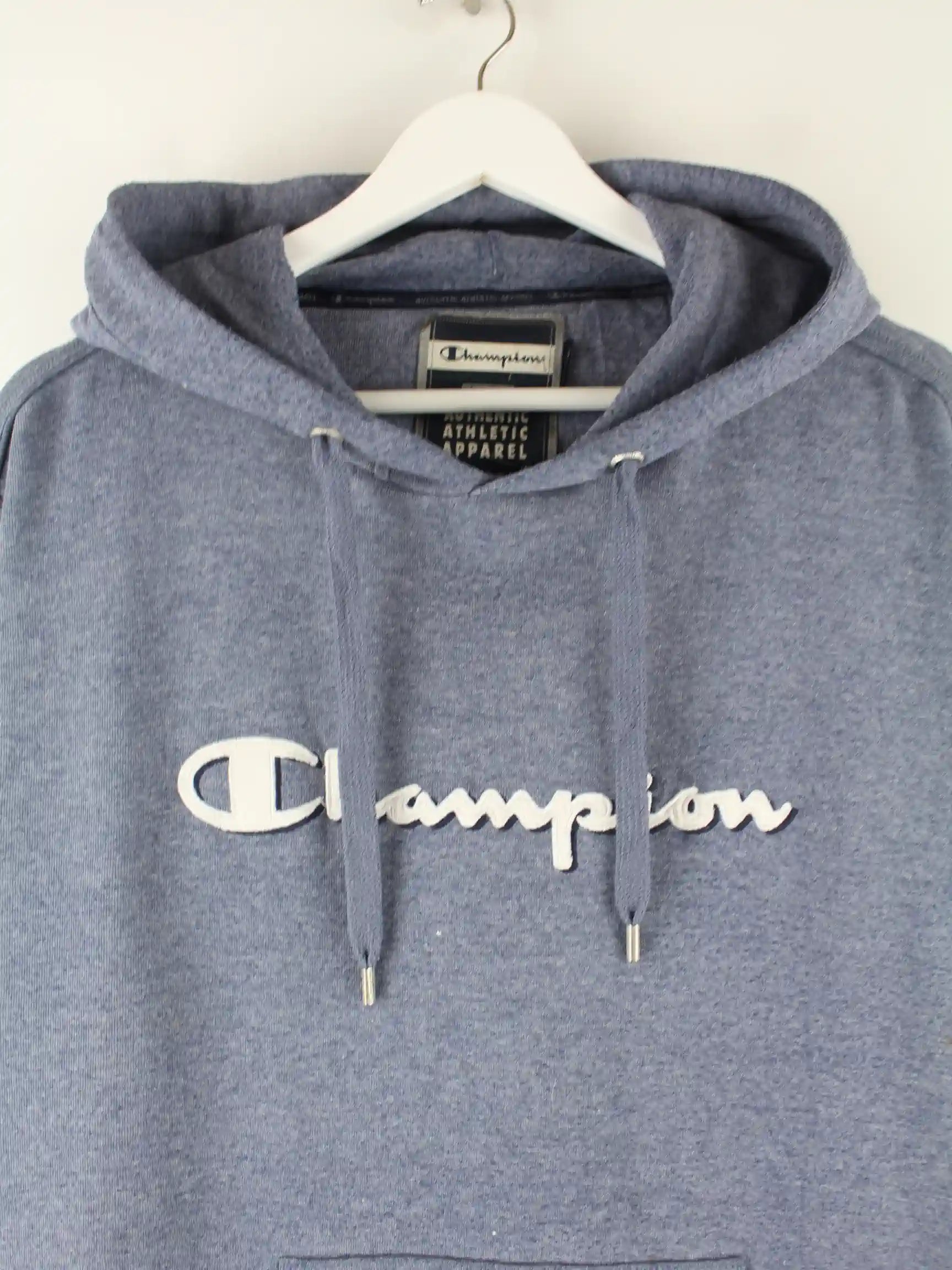 Blauer Hoodie mit gesticktem Logo vom Label Champion in Größe XL. Er ist aus einer Baumwollmischung hergestellt und in gutem Zustand zu bekommen.