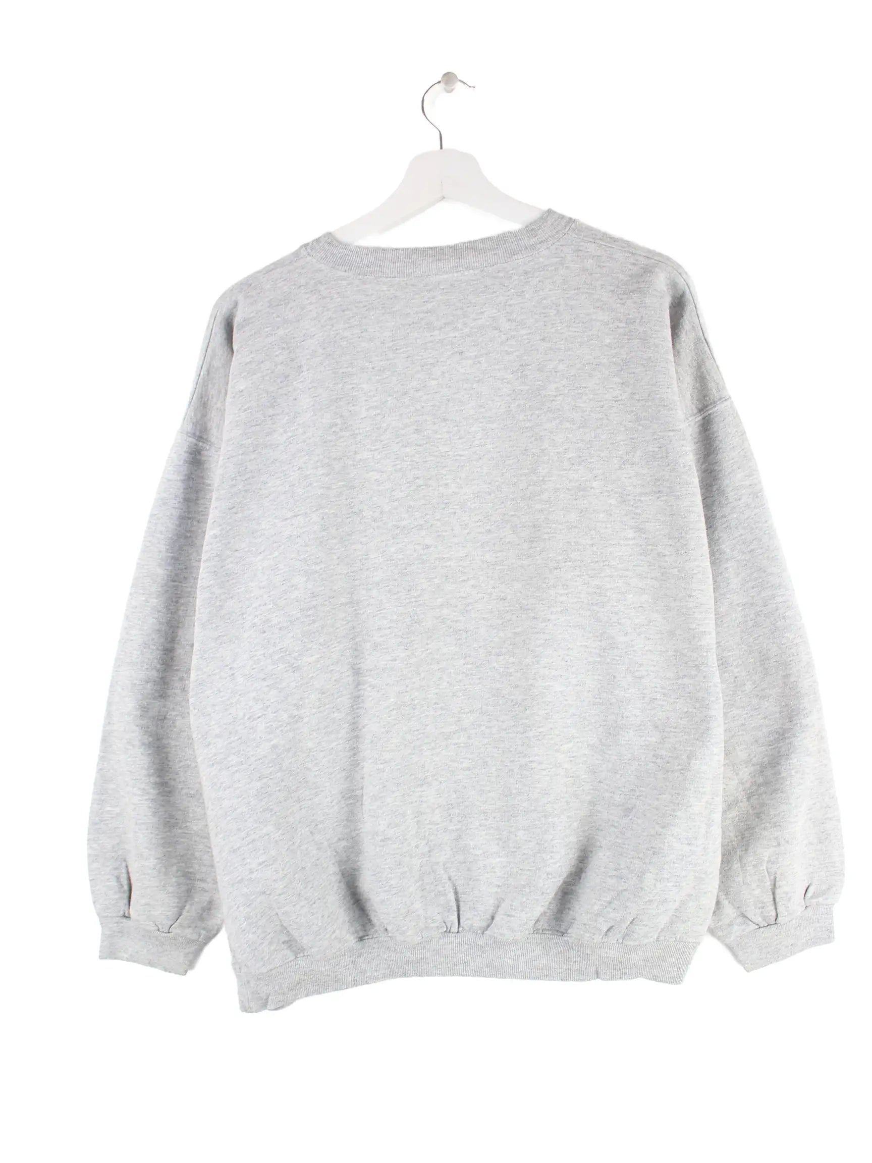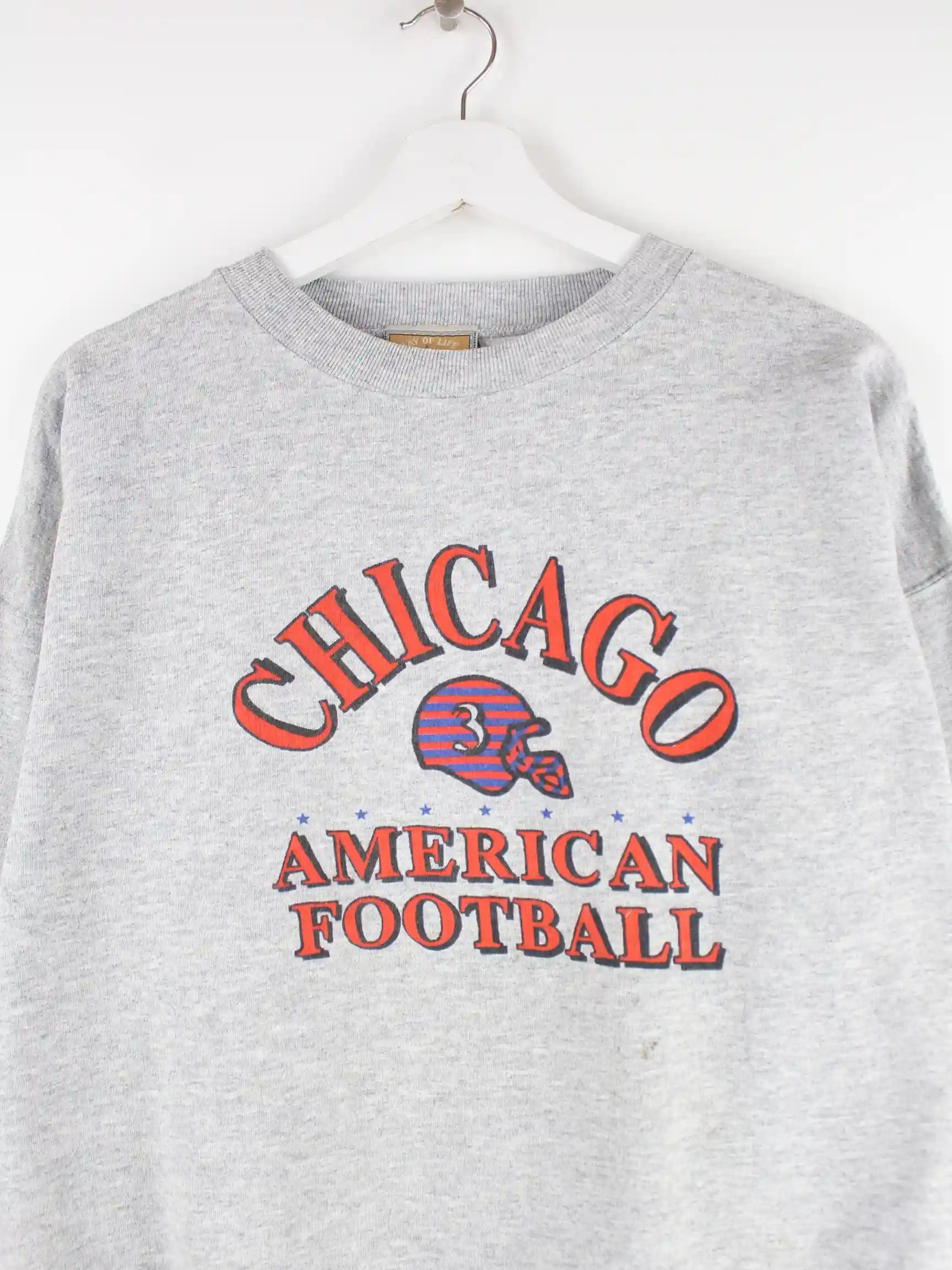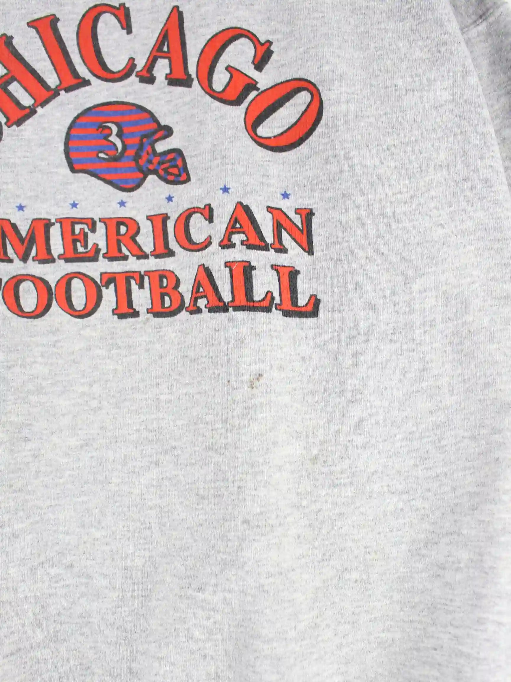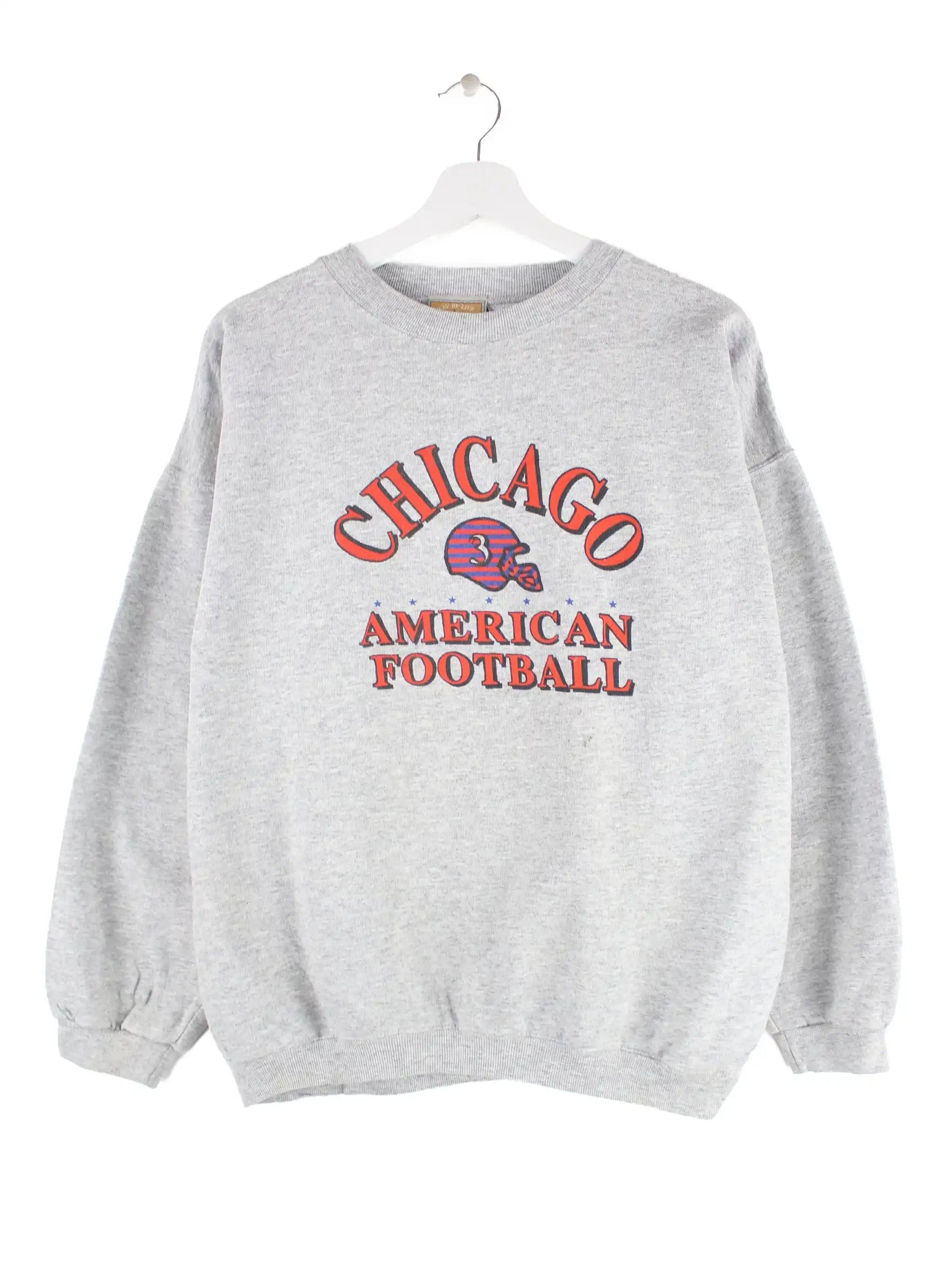 Grauer Vintage Sweater aus den 90'ern in Größe S. Er ist aus einer Baumwollmischung angefertigt und in gutem Zustand lieferbar. Mit chiquem Football Print.