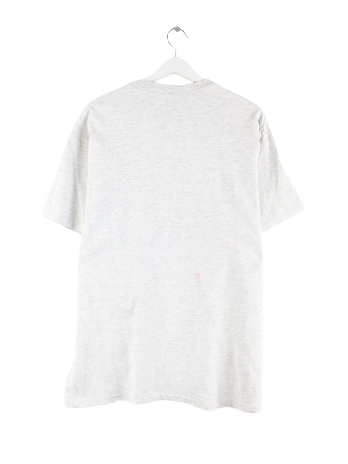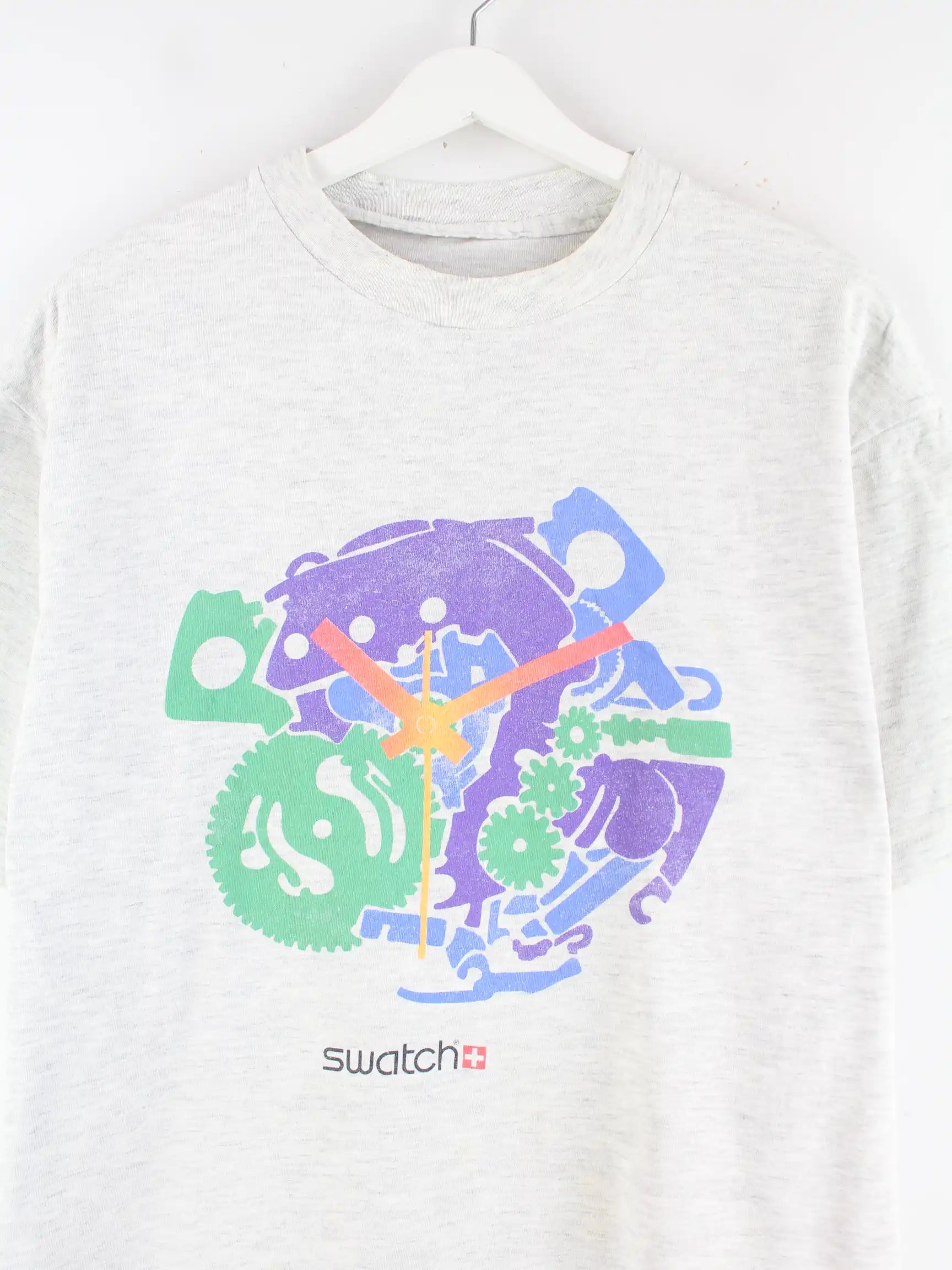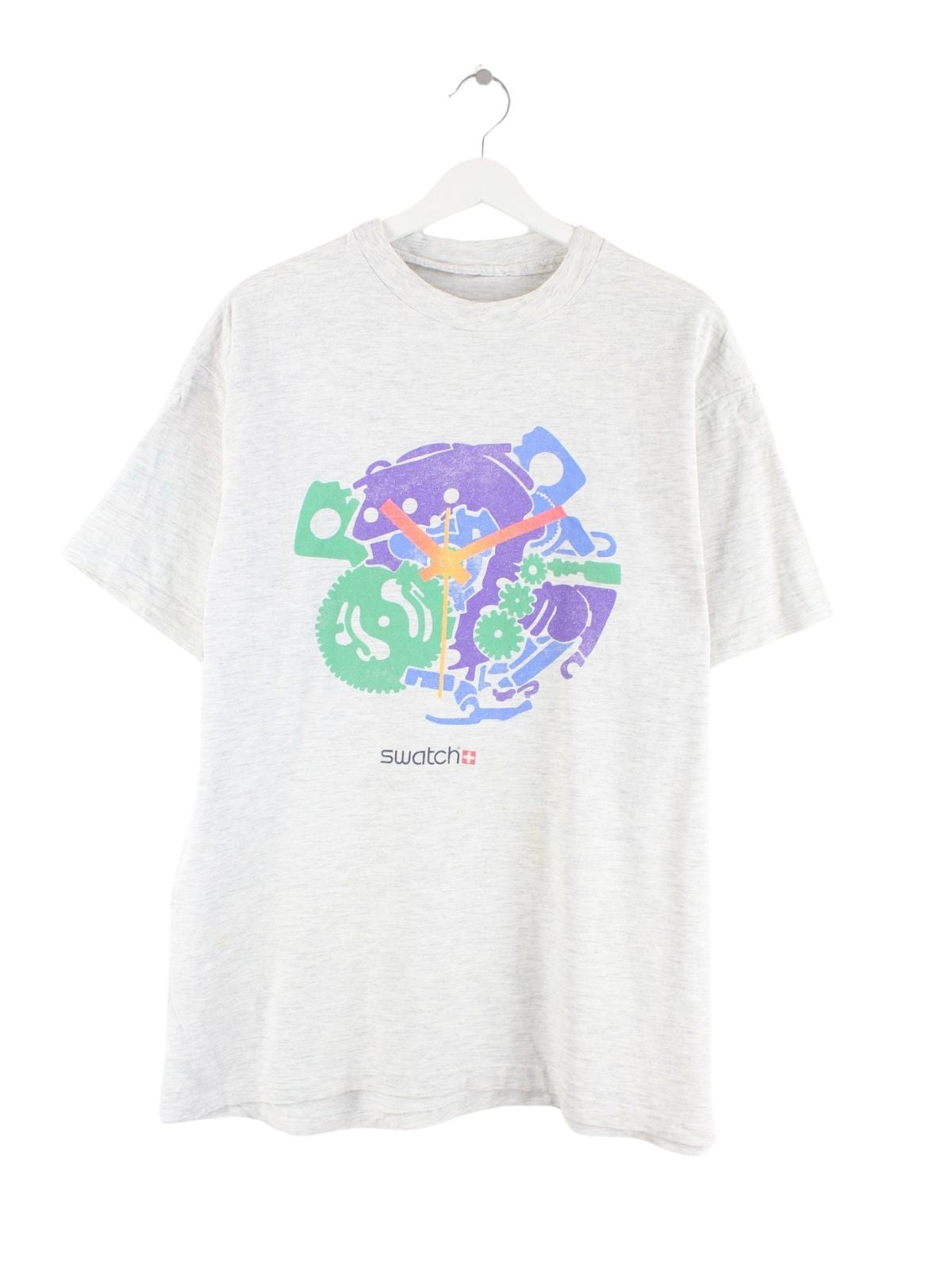 Vintage T-Shirt in Größe L aus den 90'ern. Es ist aus Baumwolle produziert und in Grau im Angebot. Mit chiquem Swatch Print.