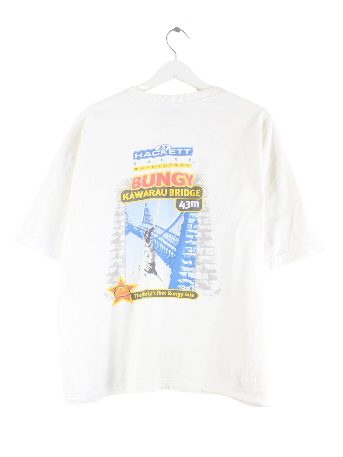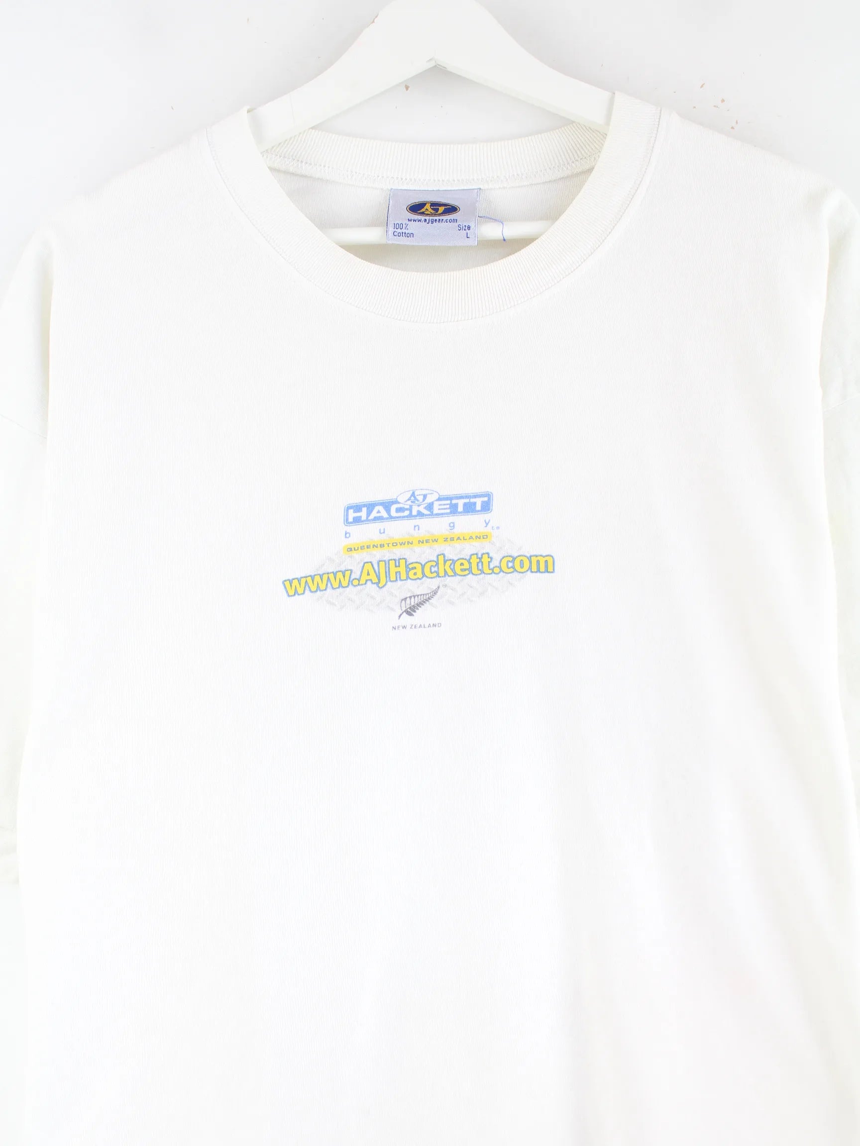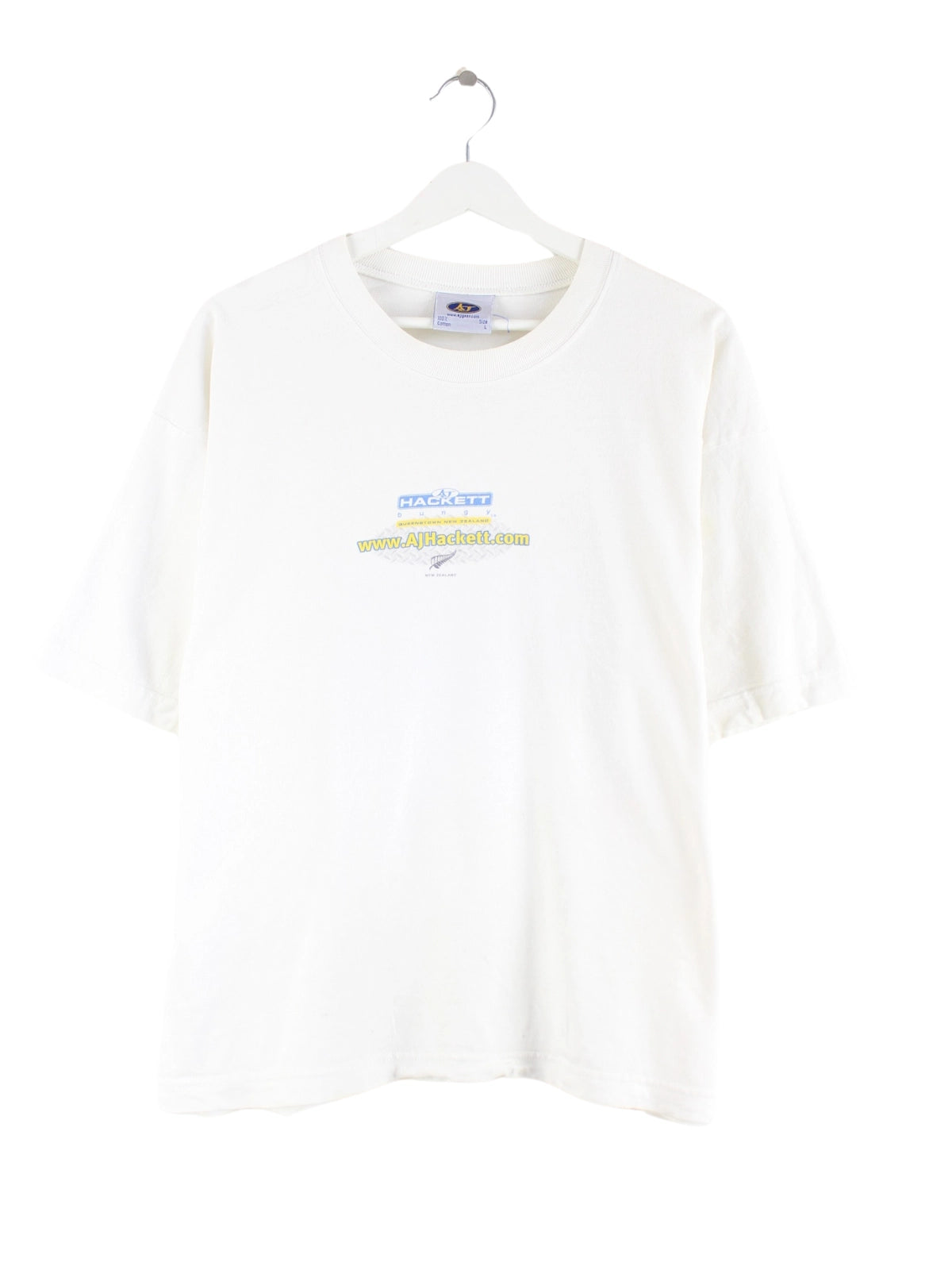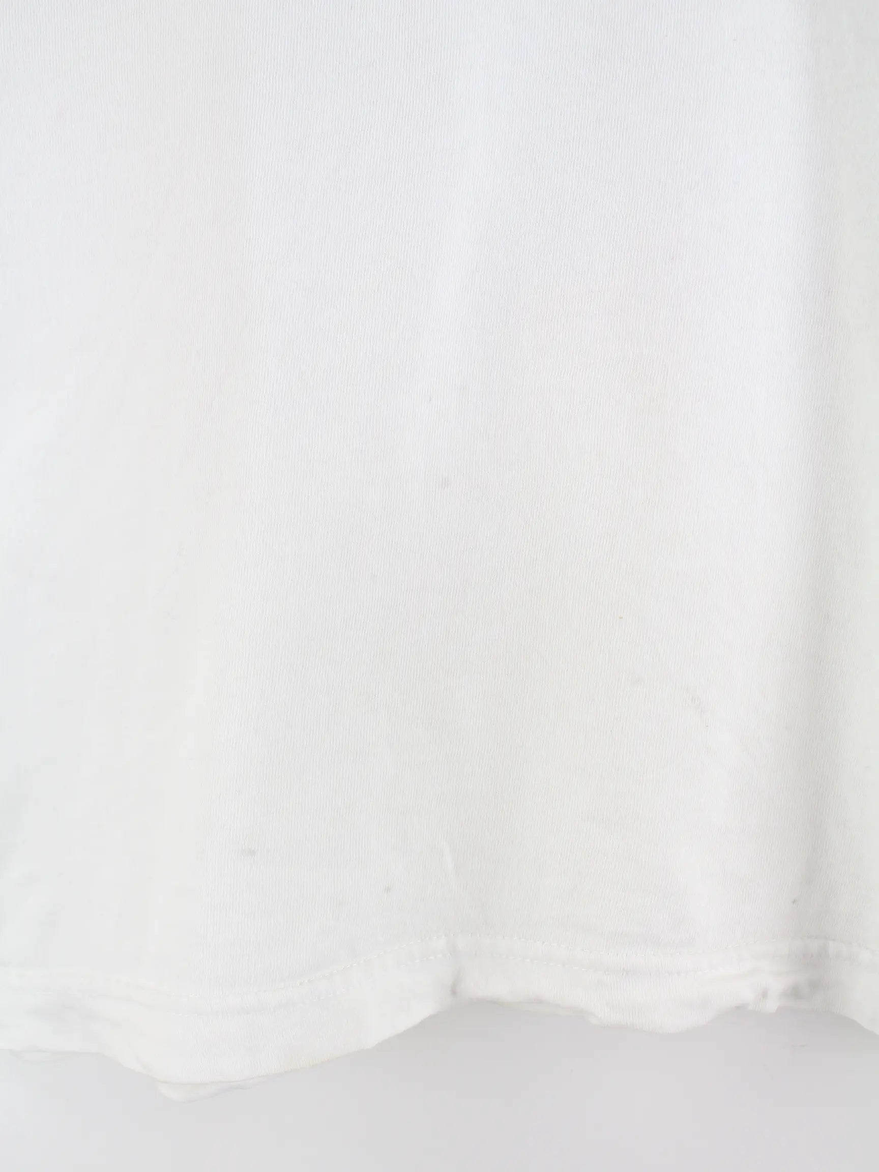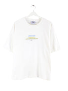 Vintage T-Shirt in Größe L. Es ist aus Baumwolle angefertigt und in Weiß im Bestand. Mit seltenem Print.