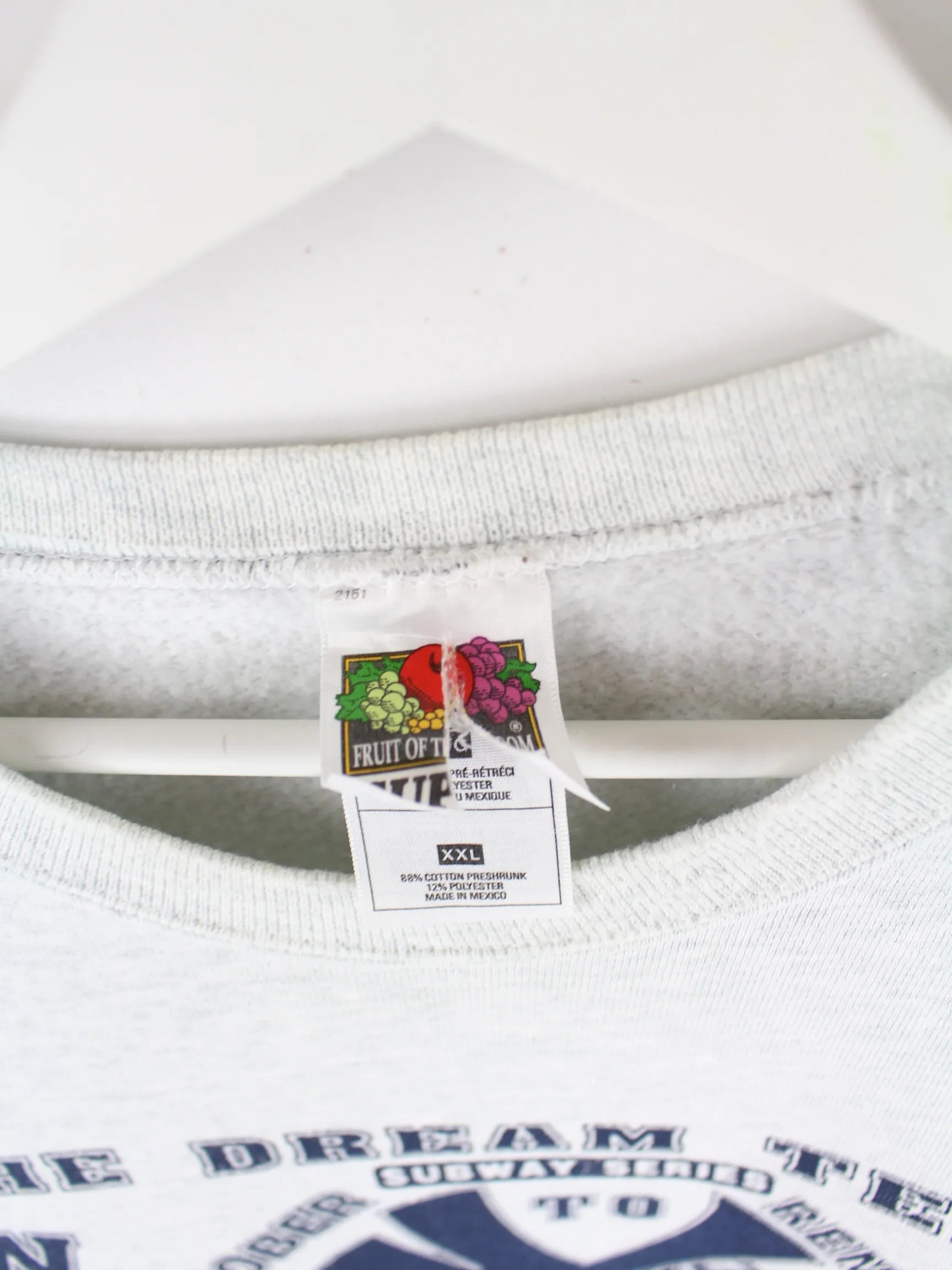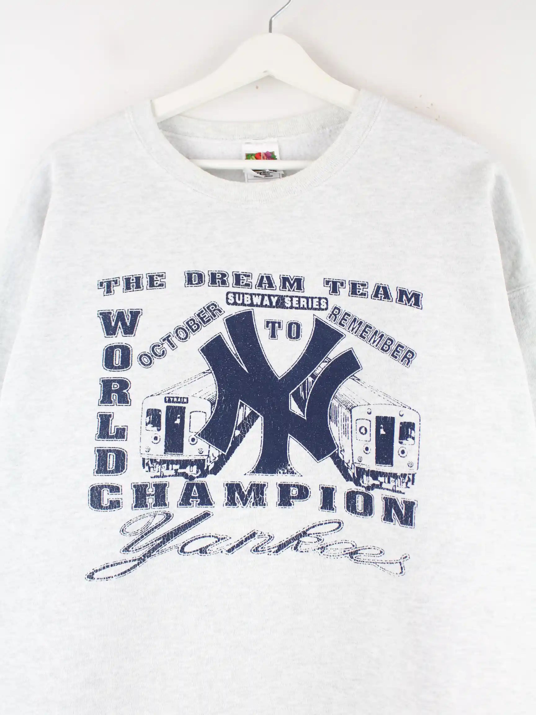 Grauer Sweater vom Brand Fruit of the Loom aus den 90'ern in Größe XXL. Er ist aus einer Baumwollmischung angefertigt und in gutem Zustand im Bestand. Mit schickem Yankees Print.