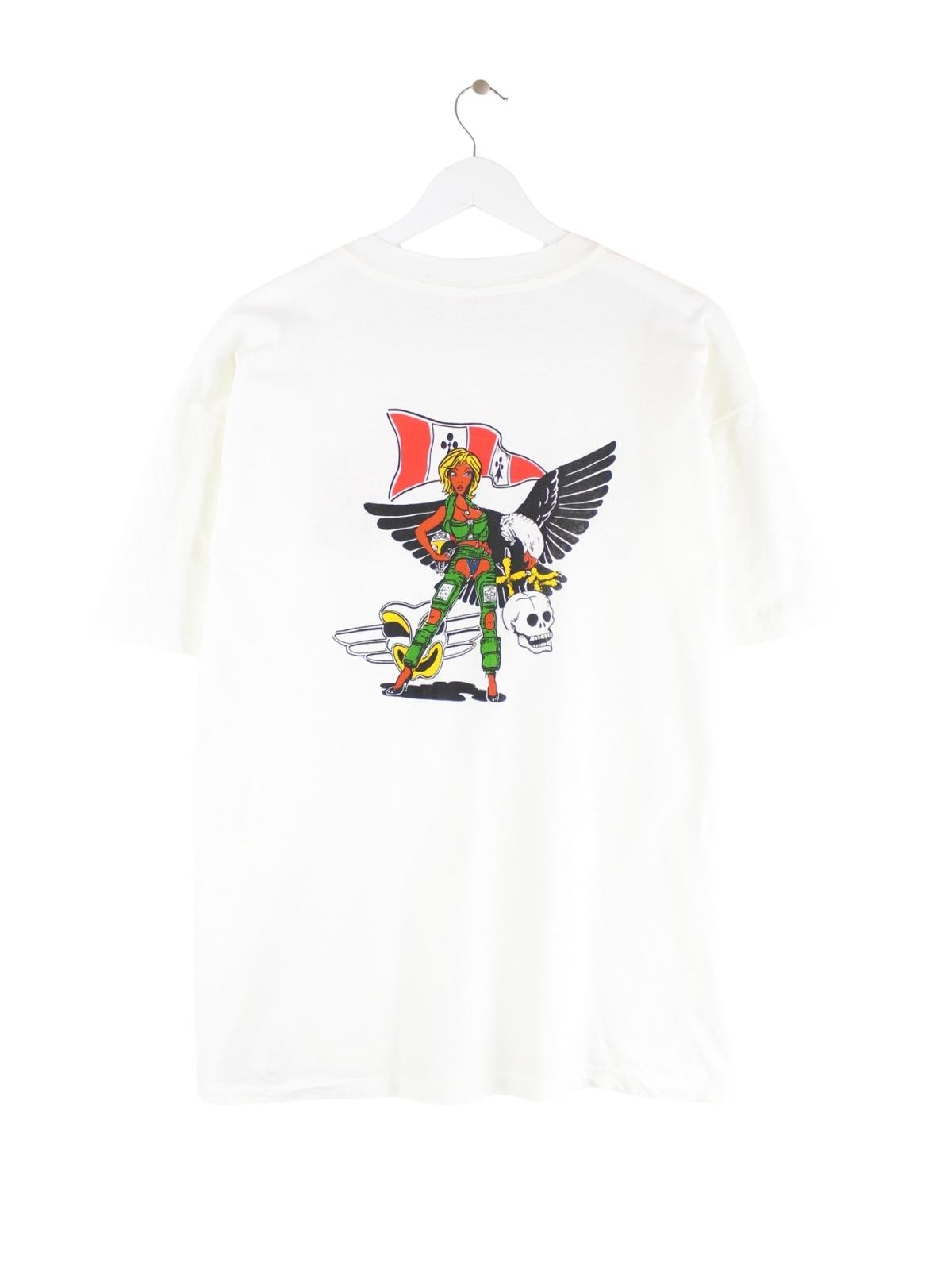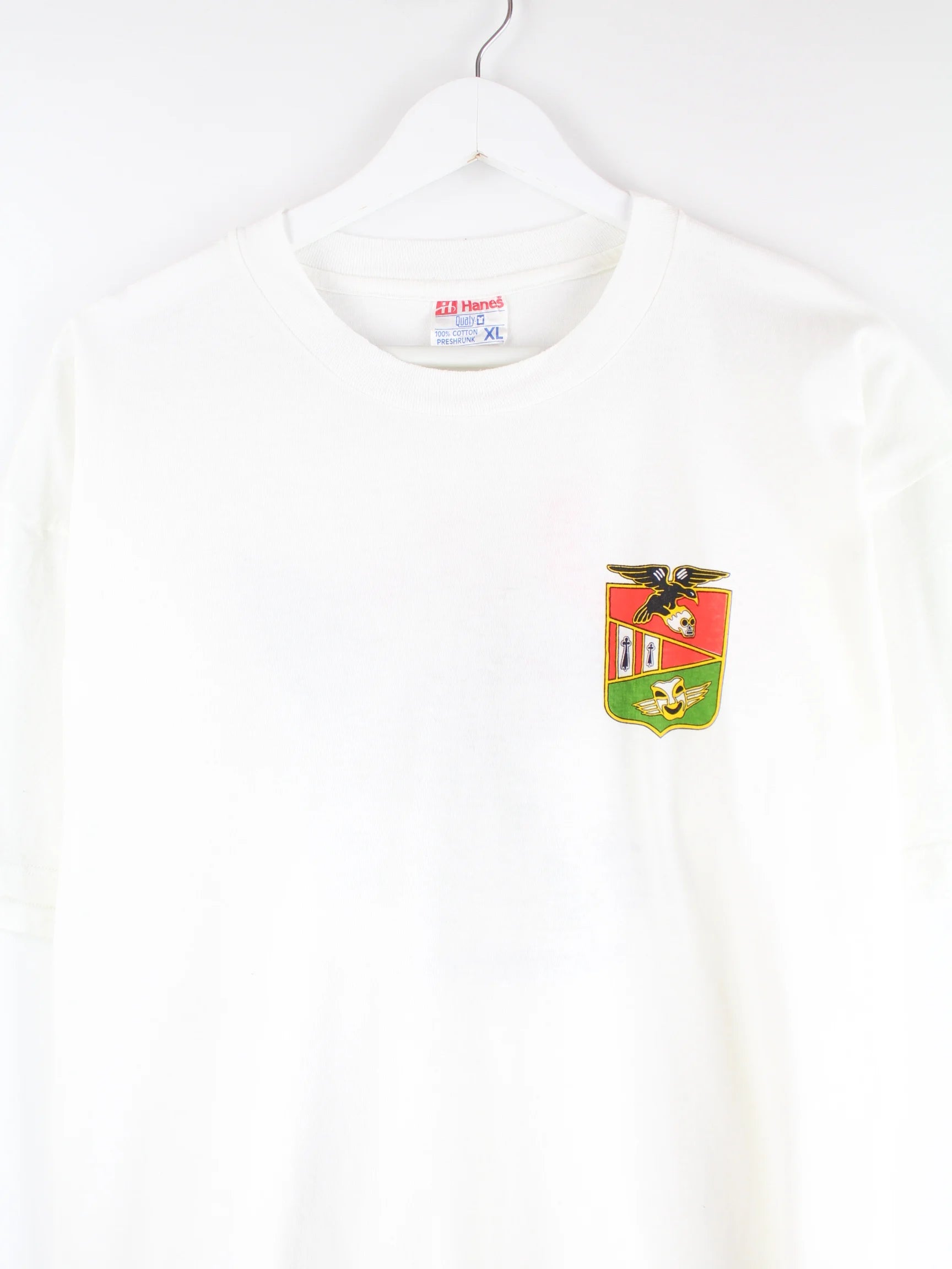 Vintage T-Shirt von Hanes in Größe XL aus den 90ern mit großem Backprint. Es ist aus Baumwolle gemacht und in Weiß im Angebot.