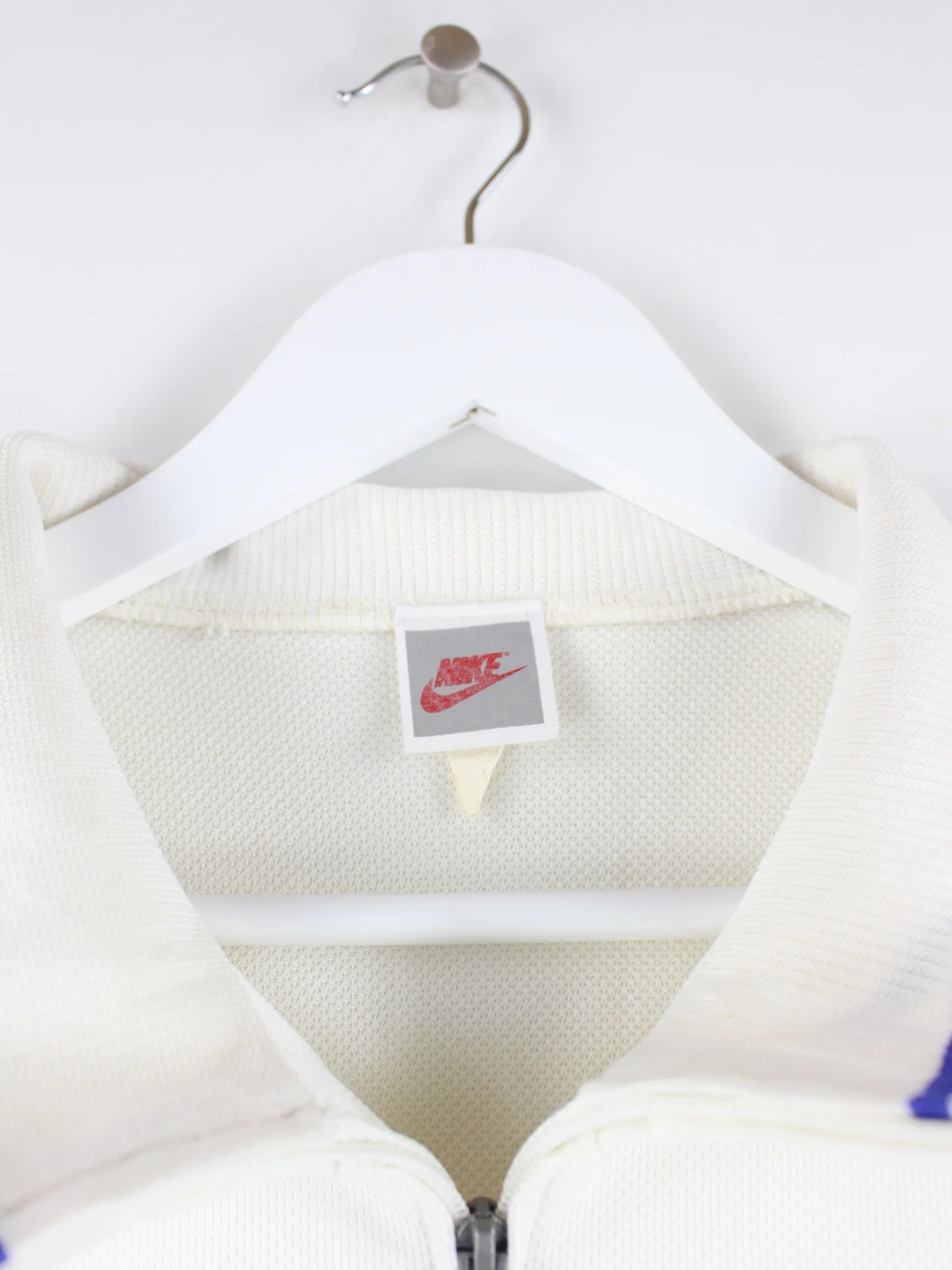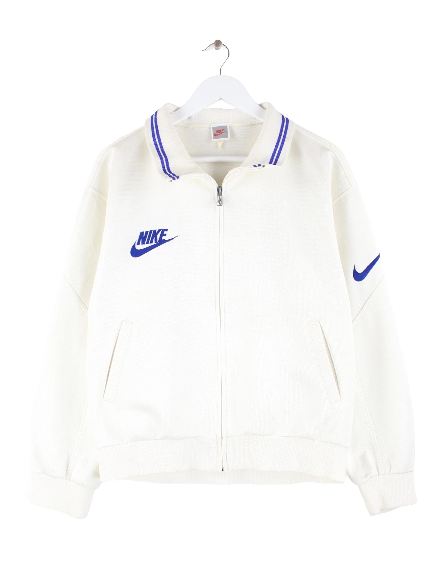 Weiße Trainingsjacke vom Label Nike aus den 90'ern in Größe M. Sie ist aus Synthetik angefertigt und in gutem Zustand bei uns vorrätig.