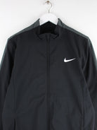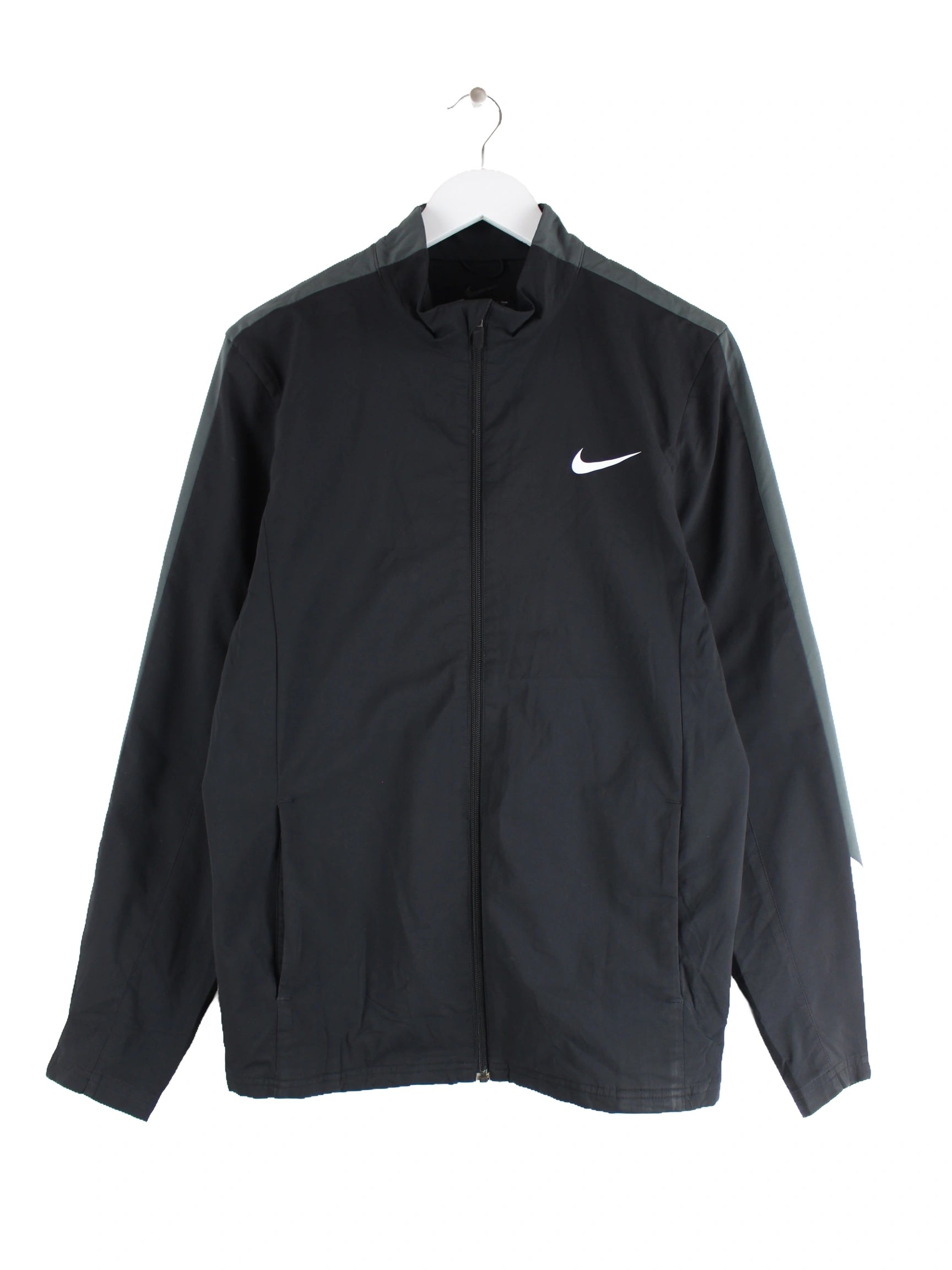 Leichte Jacke der Marke Nike in Größe M. Sie ist aus Synthetik gemacht und in Schwarz bei uns zu bekommen. Mit schickem Swoosh Print.