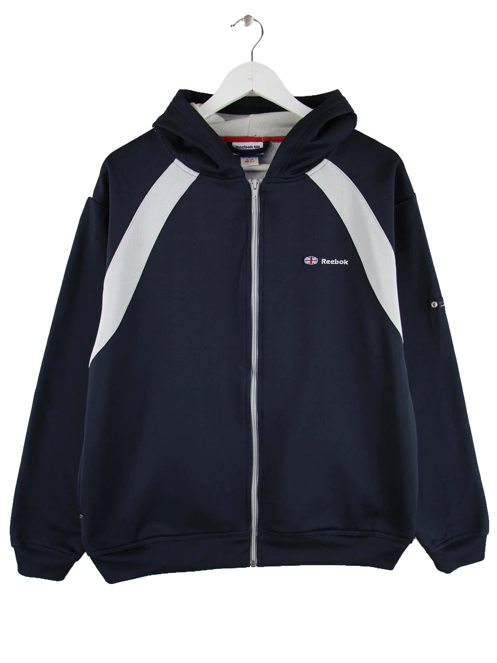 Blaue Trainingsjacke aus dem Hause Reebok in Größe M. Sie ist aus Synthetik angefertigt und in gutem Zustand bei uns zu bekommen.