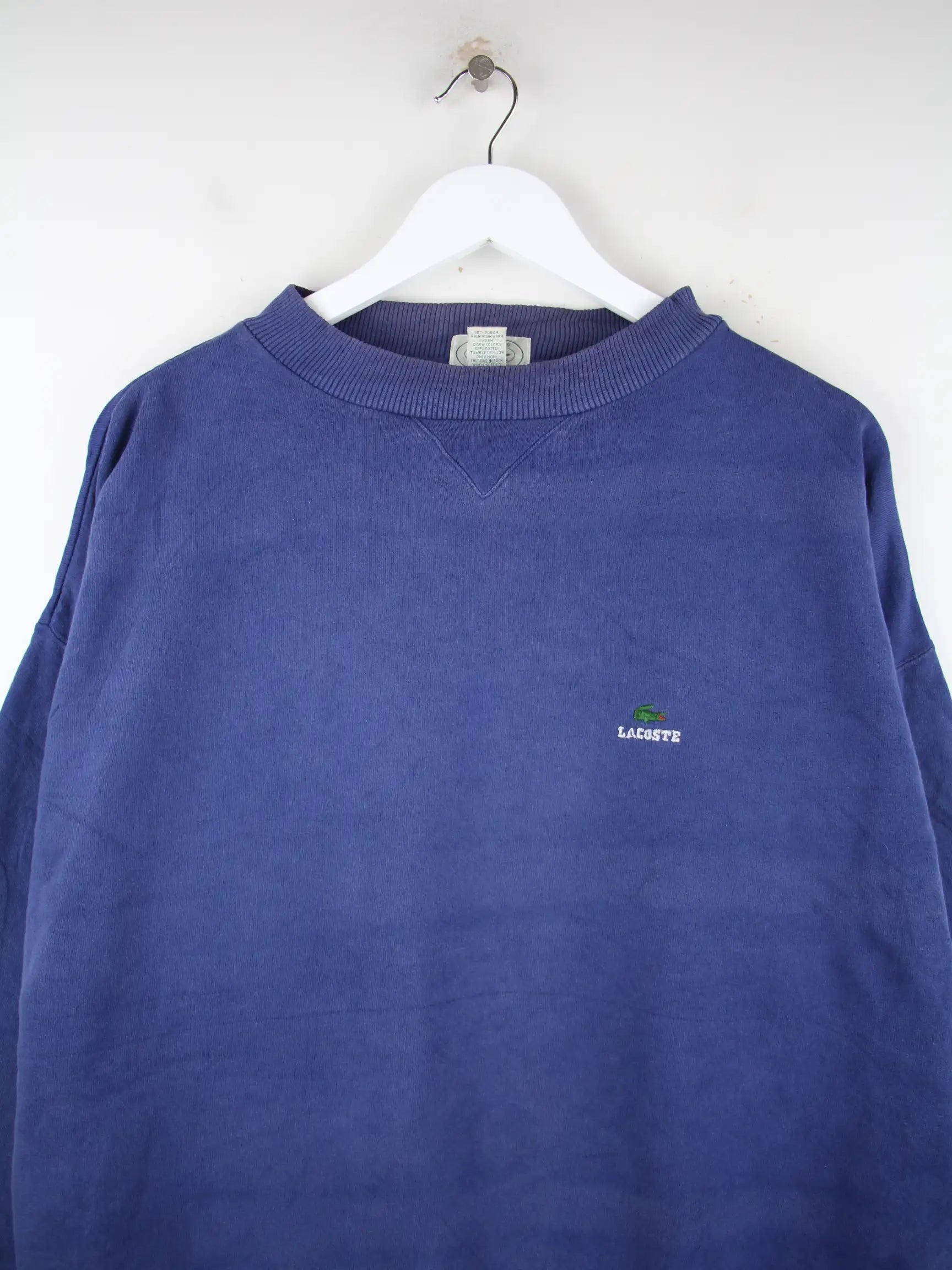 Blauer Sweater der Marke Lacoste aus den 80'ern in Größe XL. Er ist aus einer Baumwollmischung angefertigt. Den Zustand würden wir als 'In Ordnung' bezeichnen (vergl. Bilder).