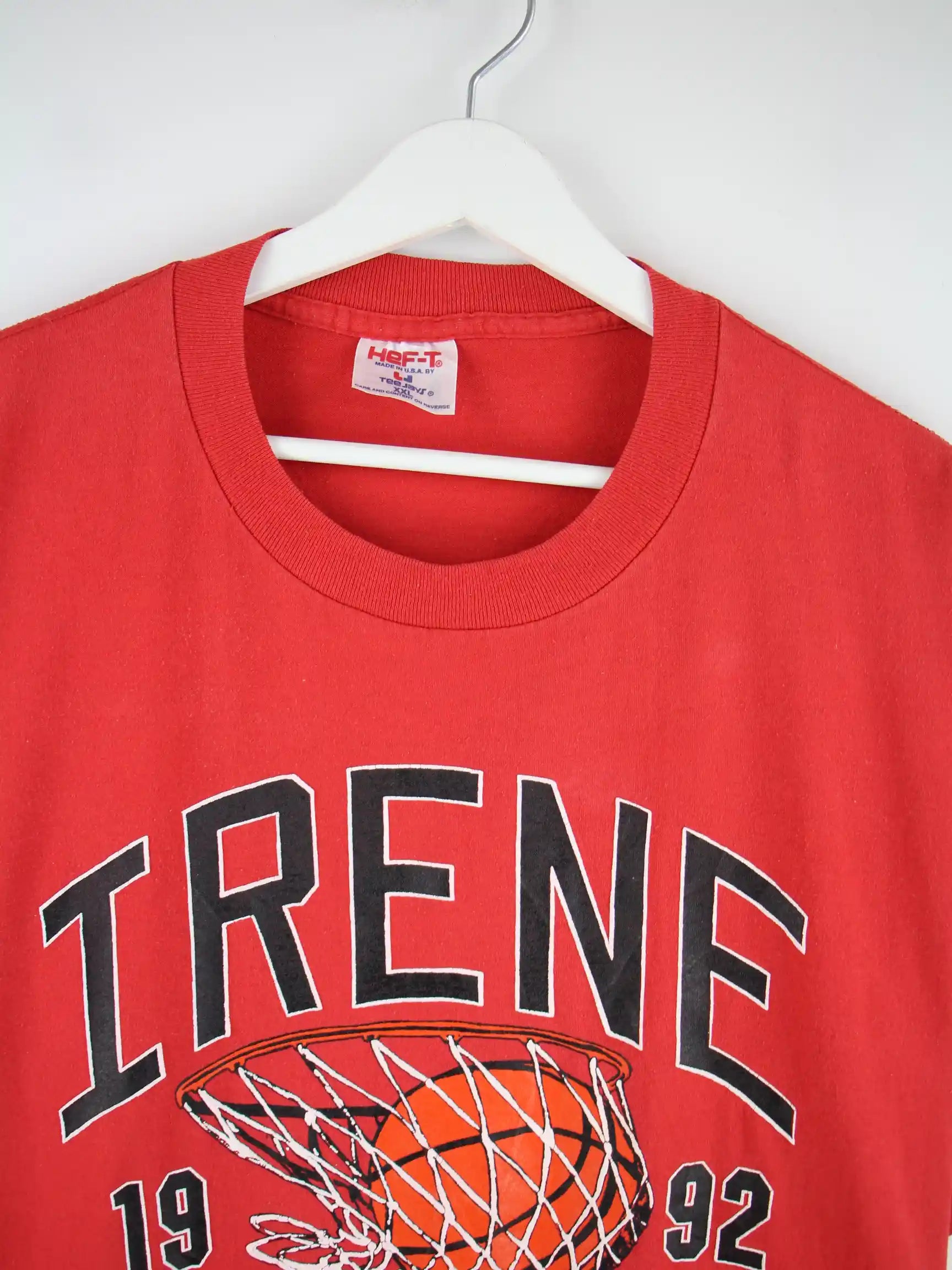 Rotes Vintage T-Shirt in Größe XXL. Es ist aus Baumwolle . Den Zustand würden wir als 'In Ordnung' bezeichnen (vergl. Bilder).Mit schönem Basketball Print.