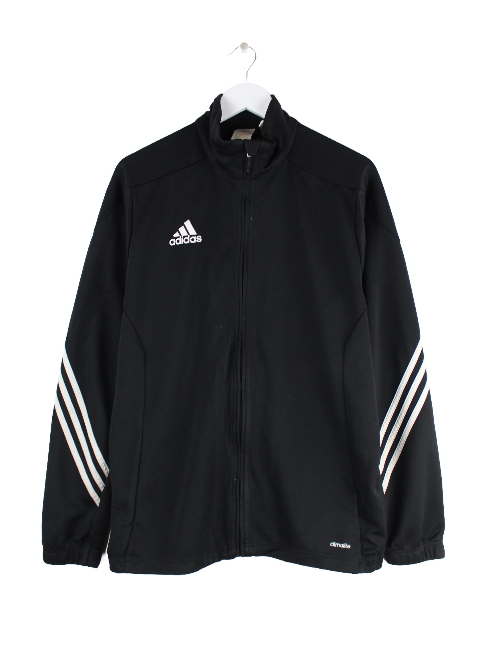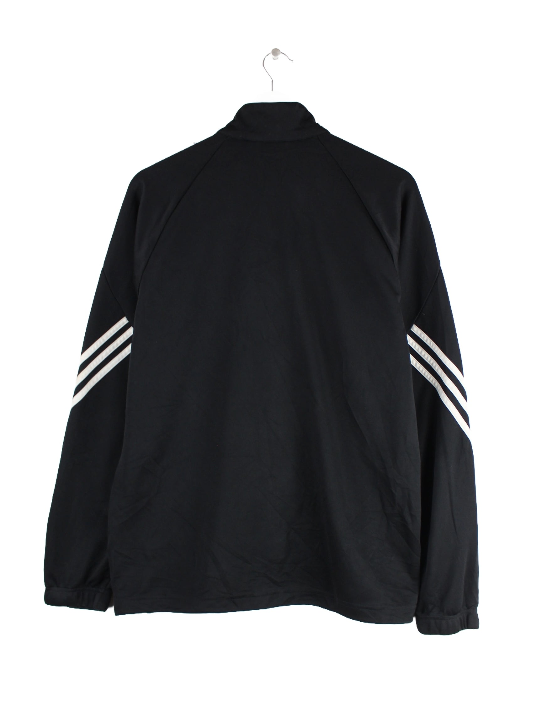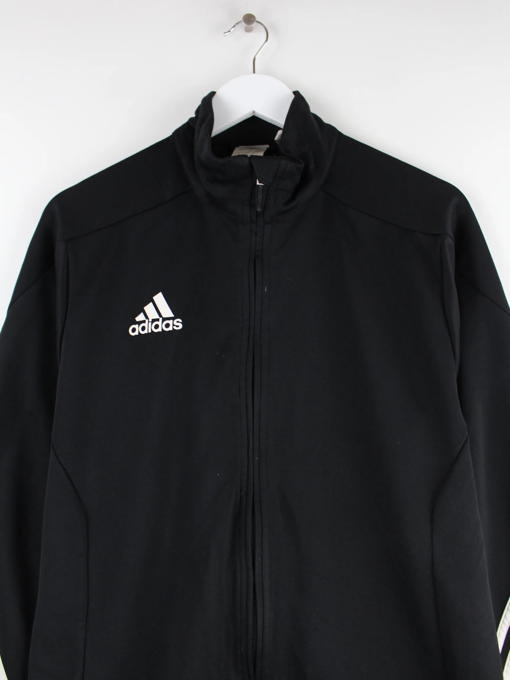 Trainingsjacke des Labels Adidas in Größe L. Sie ist aus Synthetik angefertigt und in Schwarz im Bestand.