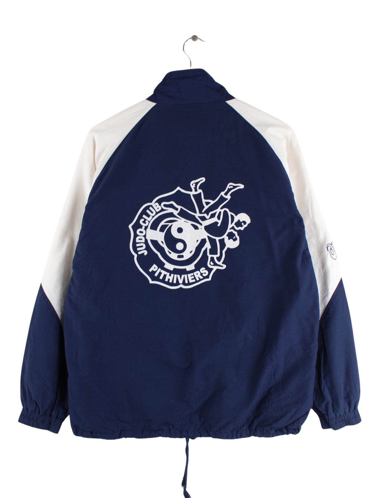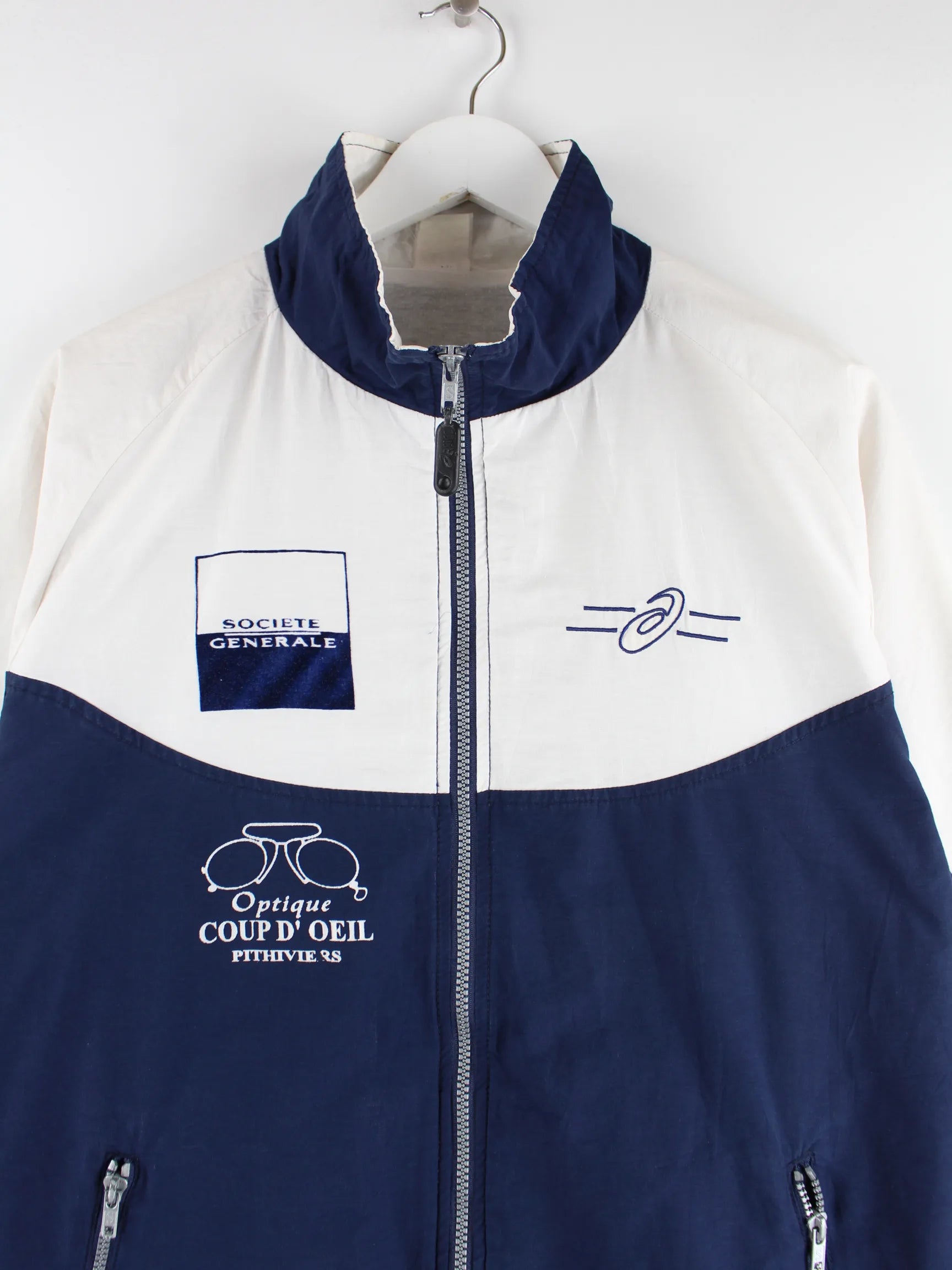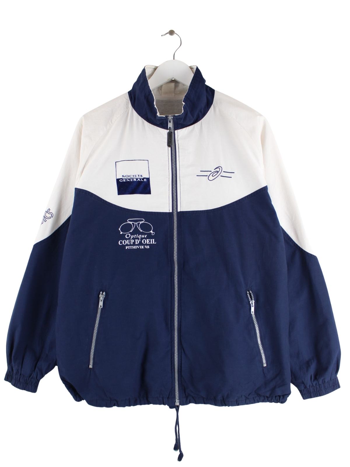 Trainingsjacke vom Brand Asics in Größe L aus den 90'ern. Sie ist aus Synthetik gemacht und in Blau zu haben. Mit seltenem Vintage Print.