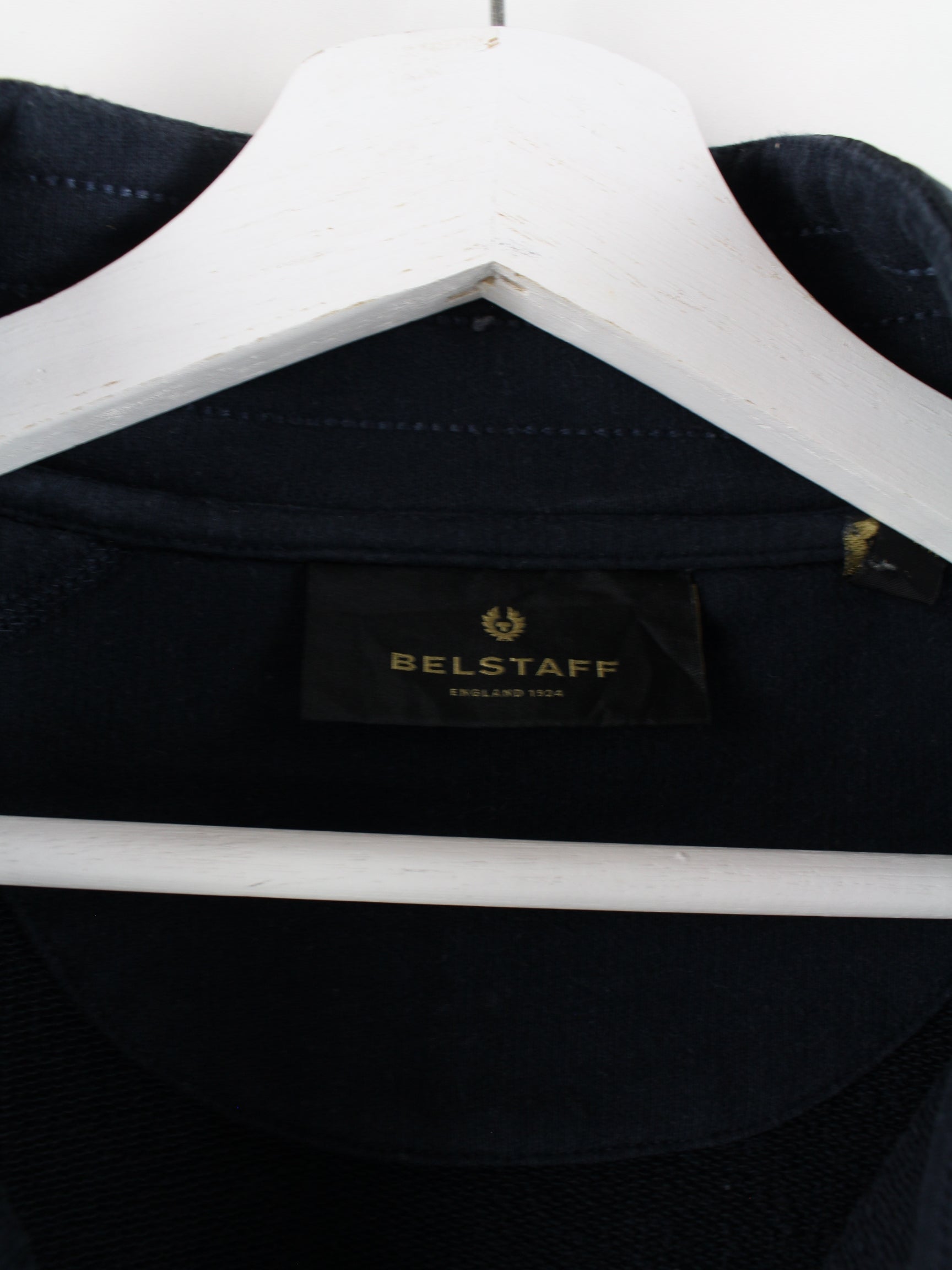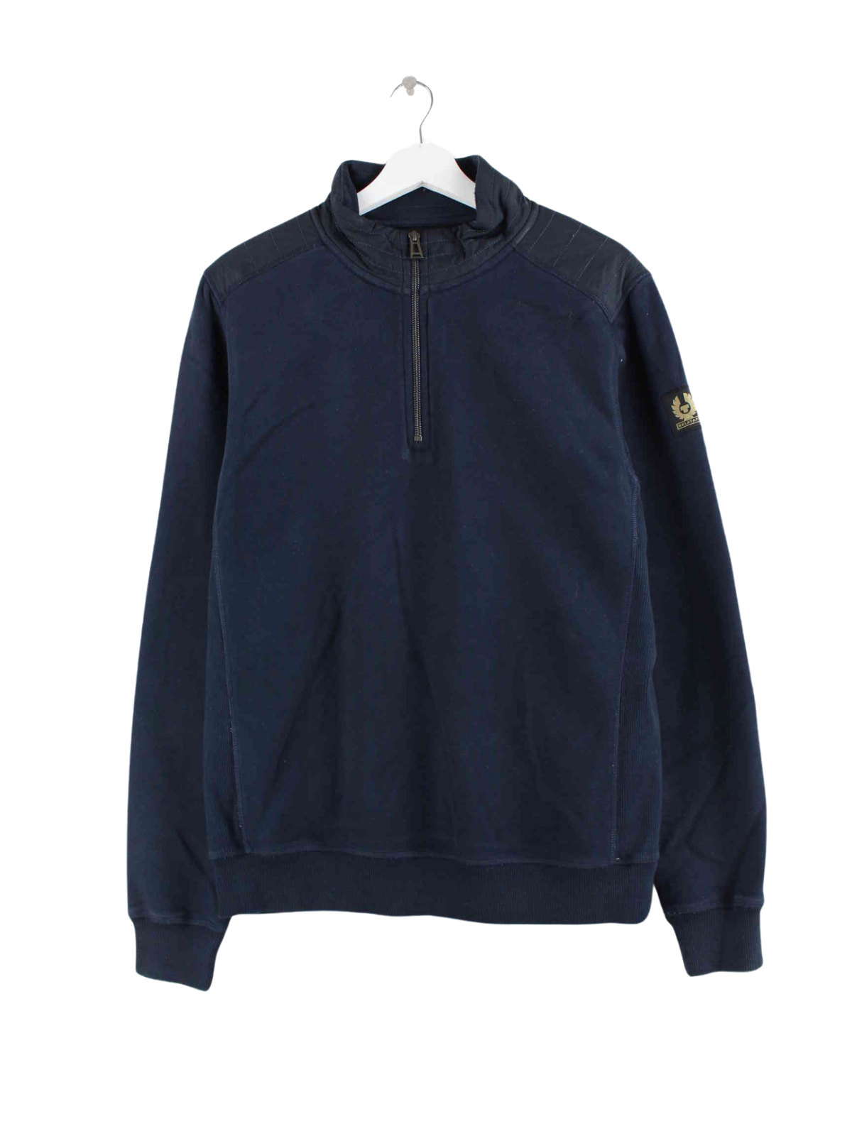 Special sweater from the brand Belstaff with a short zipper in size L. It is made from a cotton blend and is available in blue.
