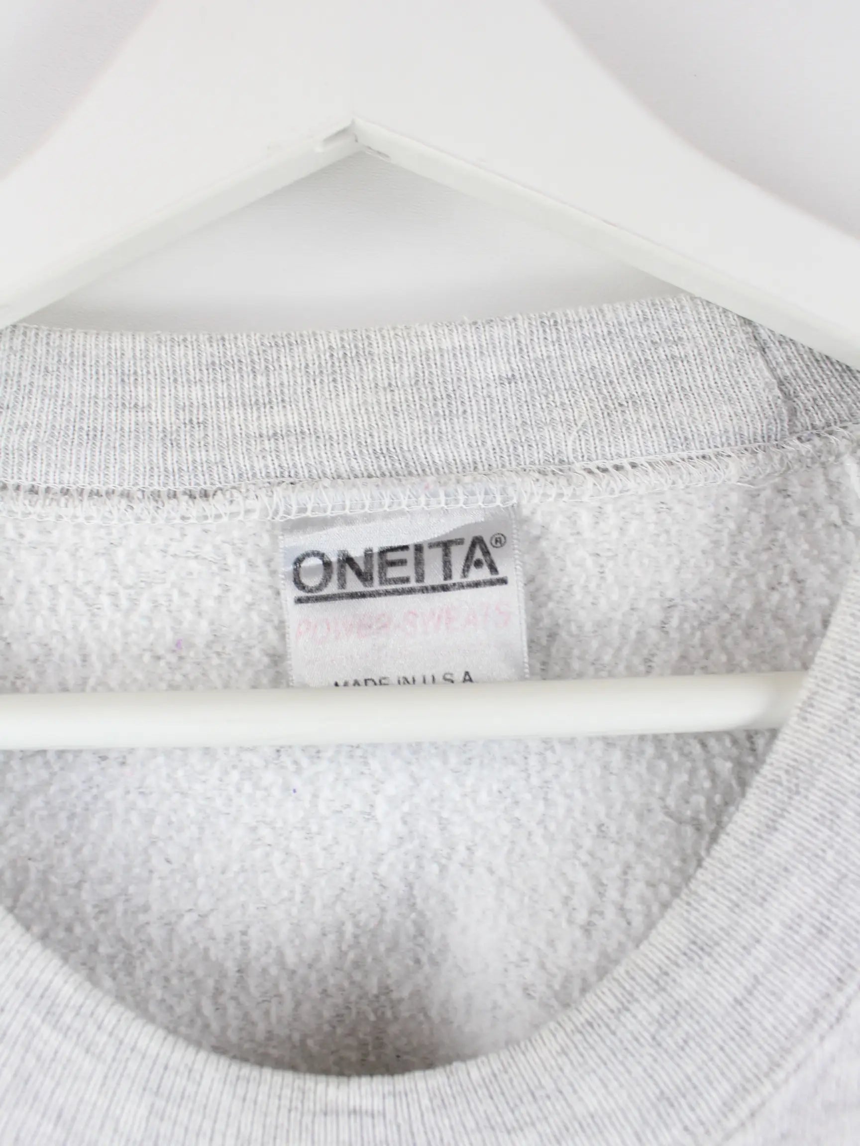Grauer Sweater der Marke Oneita in Größe XL. Er ist aus einer Baumwollmischung gefertigt und in sehr gutem Zustand vorrätig. Mit schönem Atlanta Print.