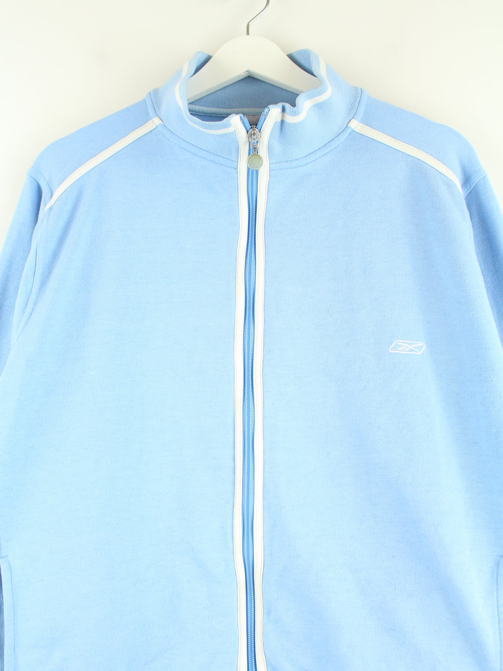 Sweat jacket from the label Reebok in size L from the early 2000s. It is made from a cotton blend and is in stock in blue.