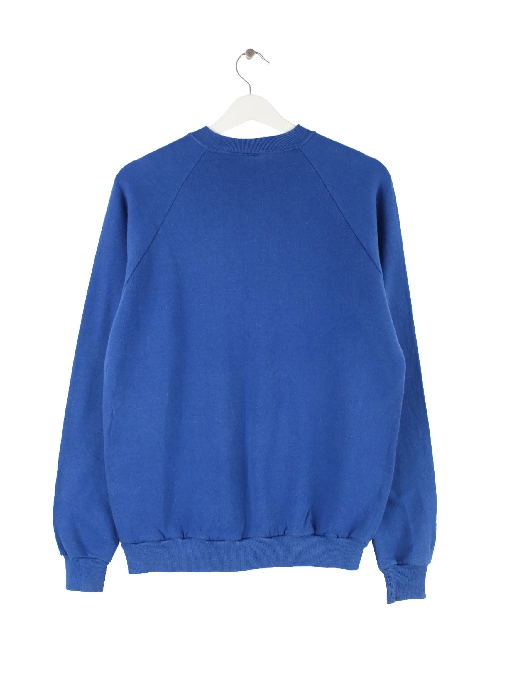 Blauer Vintage Sweater aus den 90'ern in Größe M. Er ist aus einer Baumwollmischung gemacht und in sehr gutem Zustand vorrätig. Mit schickem Car Print.