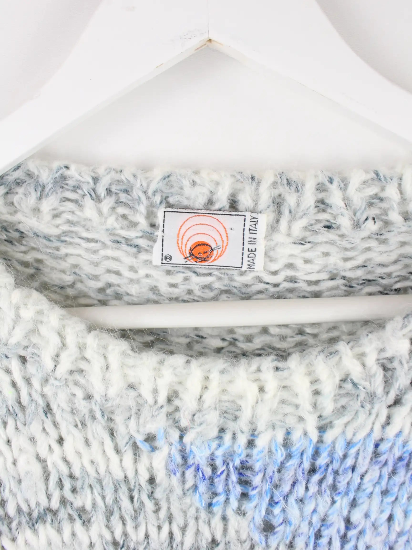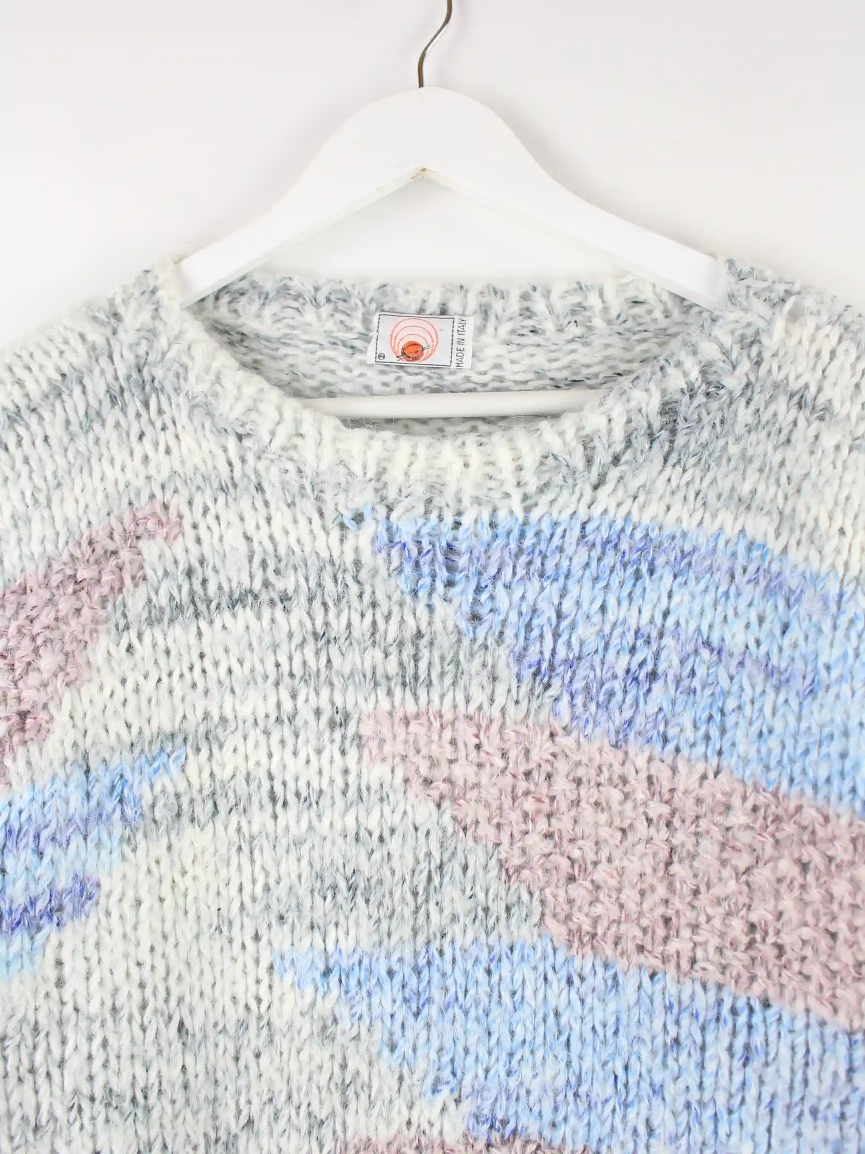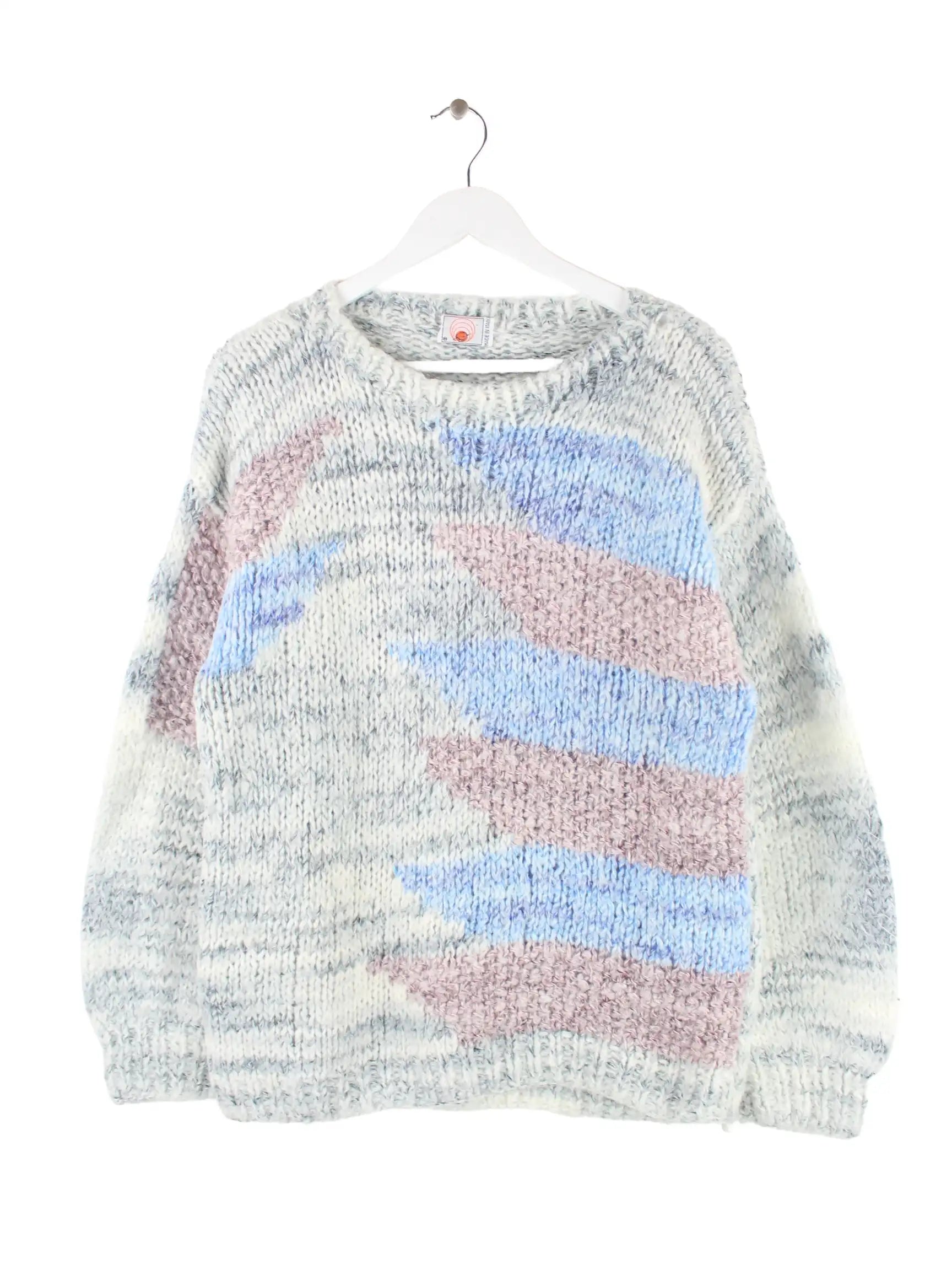 Vintage Damen Made in Italy Strickpullover in Größe L aus den 80'ern. Er ist aus einer Wollmischung gemacht und in bunten Farben auf Lager.