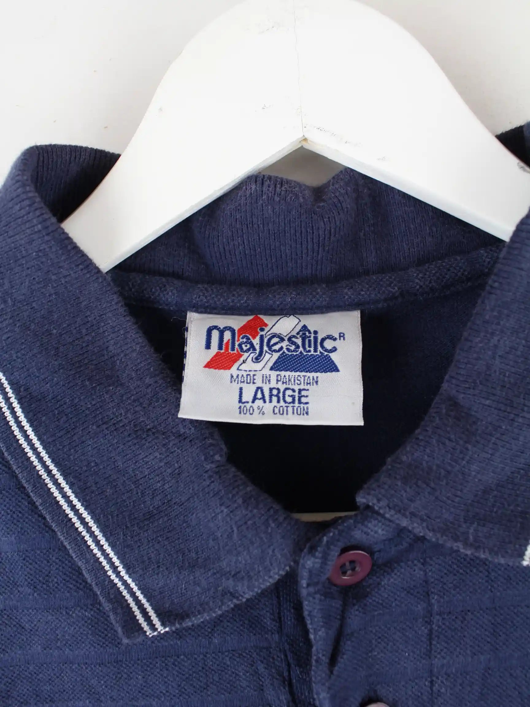 Poloshirt des Labels Majestic in Größe L aus den 90'ern. Es ist aus Baumwolle und in Blau im Bestand.