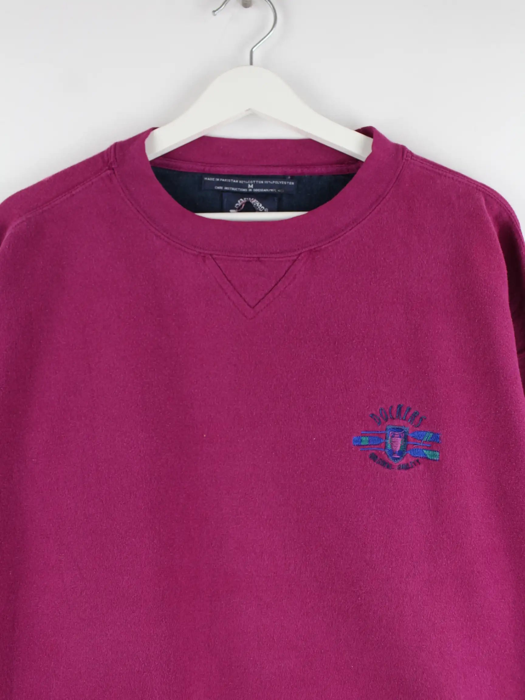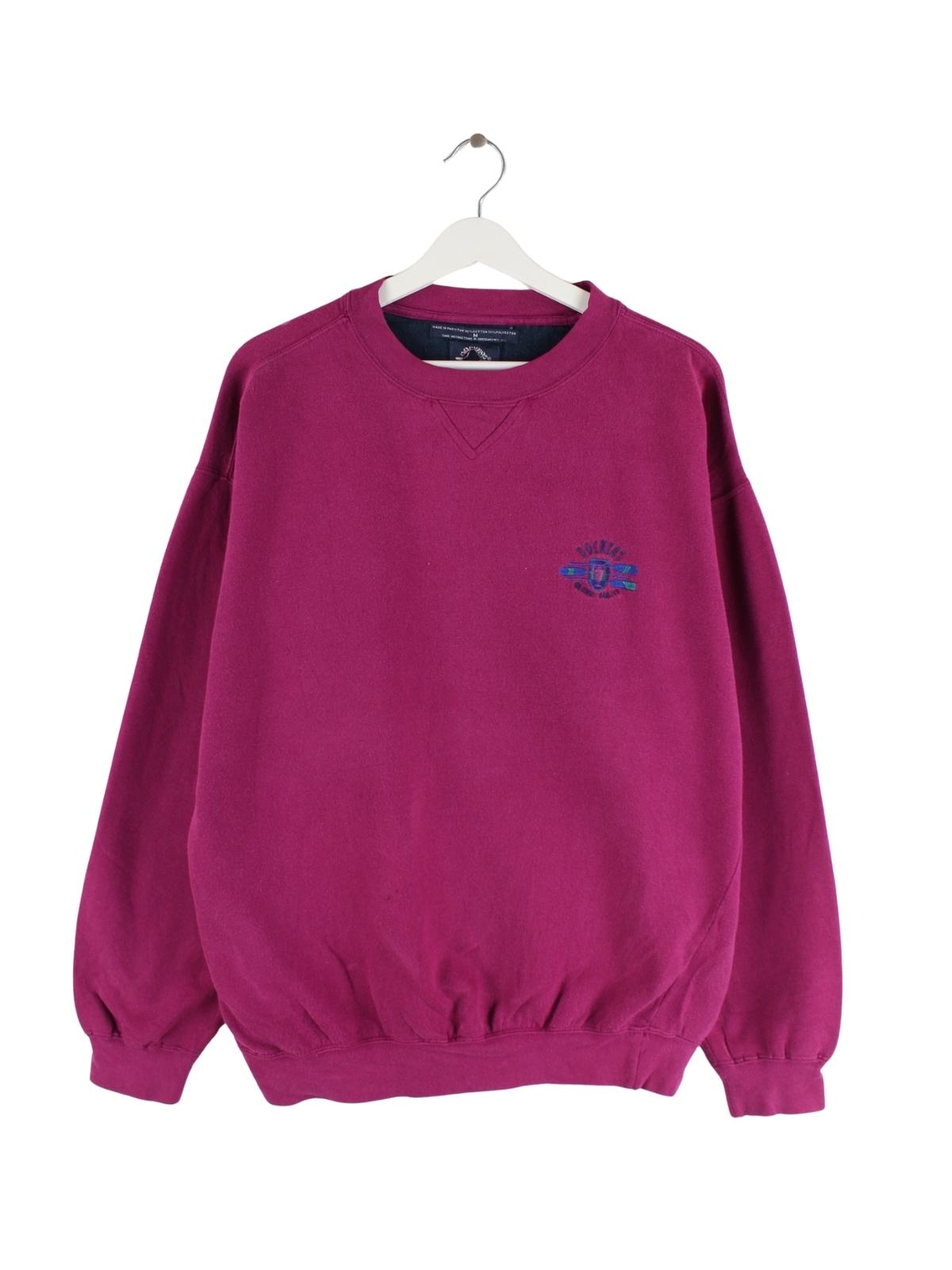 Lilafarbener Sweater vom Brand Dockers aus den 90'ern in Größe M. Er ist aus einer Baumwollmischung angefertigt. Den Zustand würden wir als 'In Ordnung' bezeichnen (vergl. Bilder).