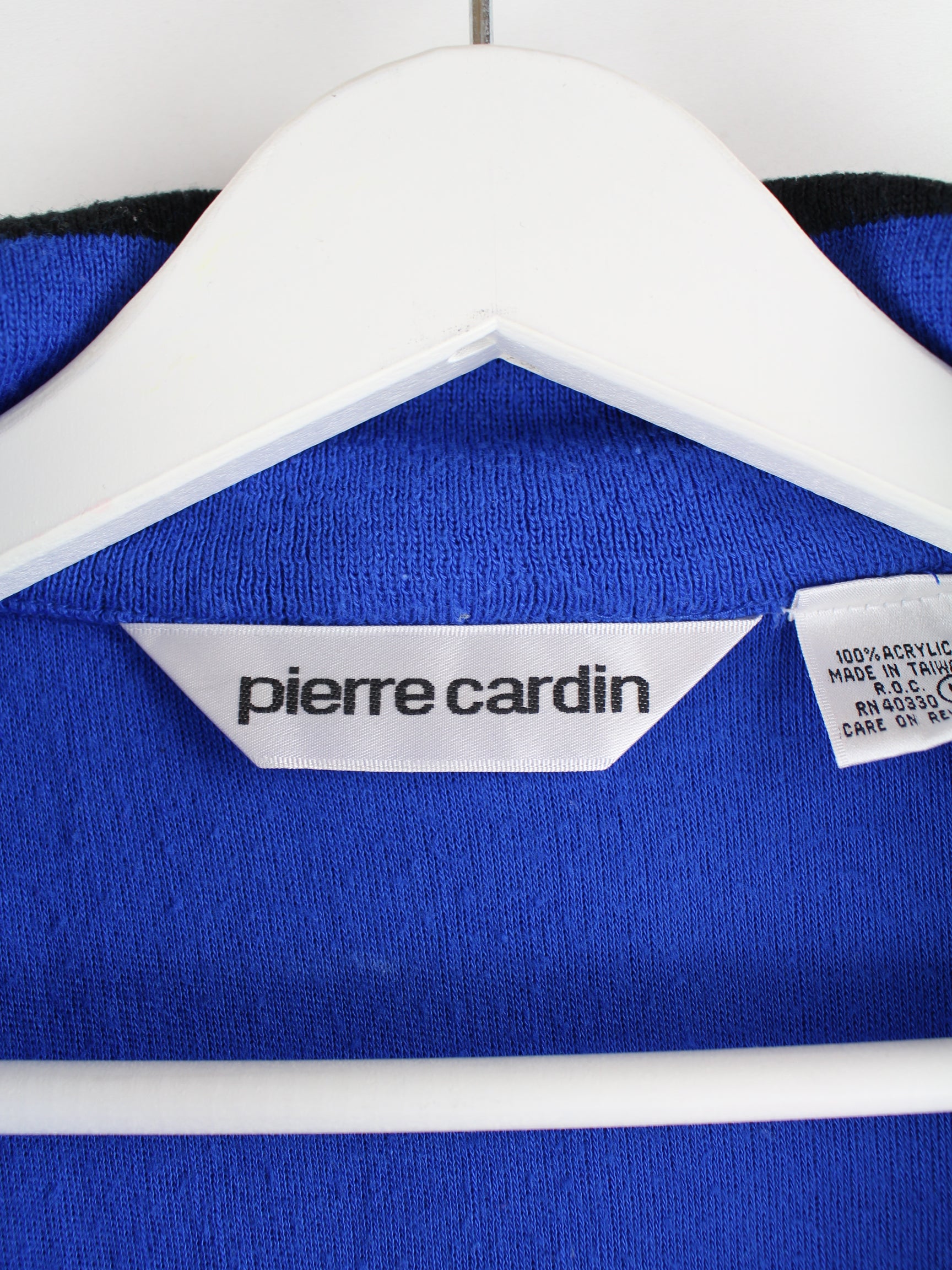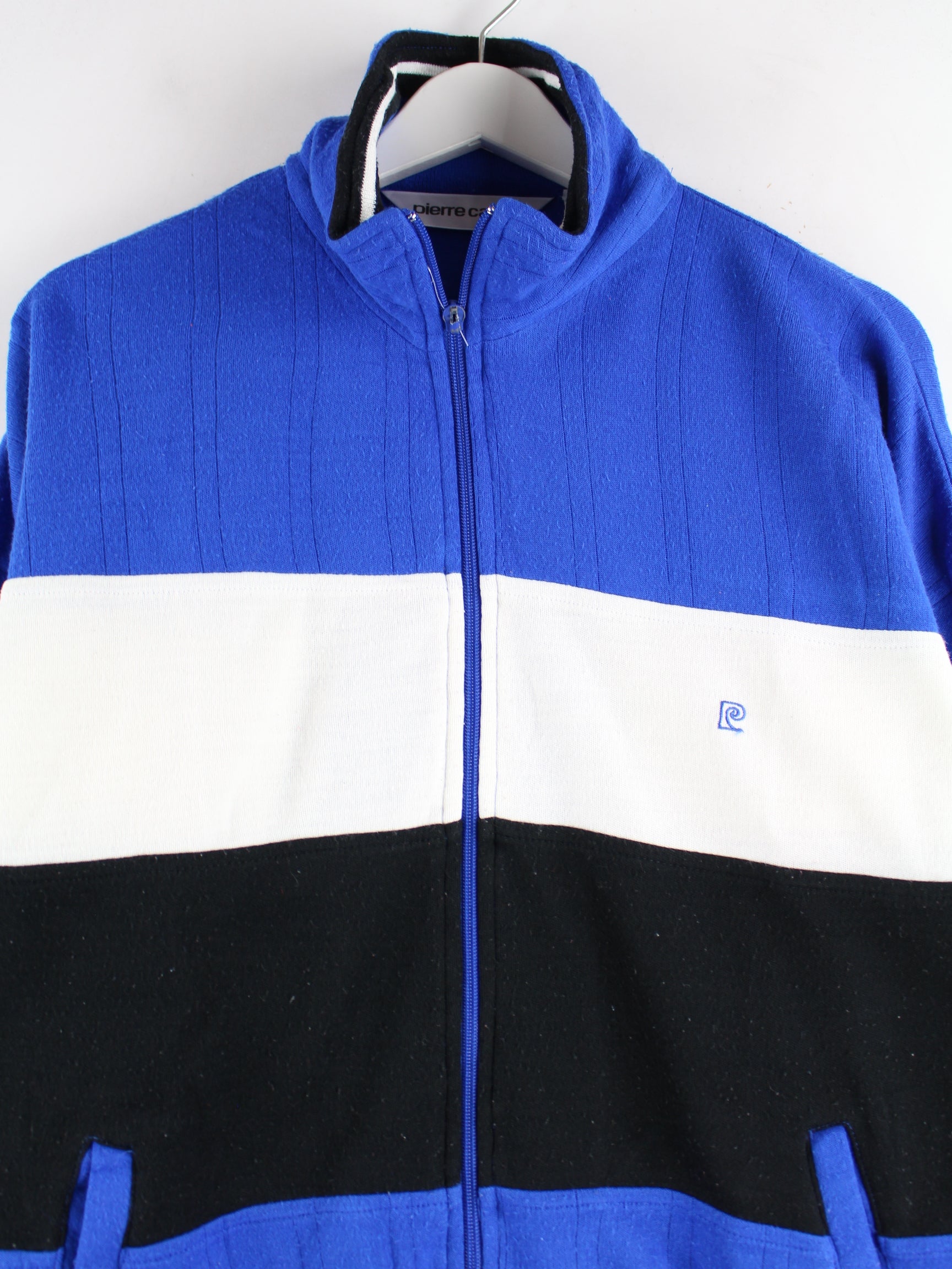 Blaue Sweatjacke des Labels Pierre Cardin aus den 90'ern in Größe M. Sie ist aus Acryl gefertigt und in gutem Zustand auf Lager.