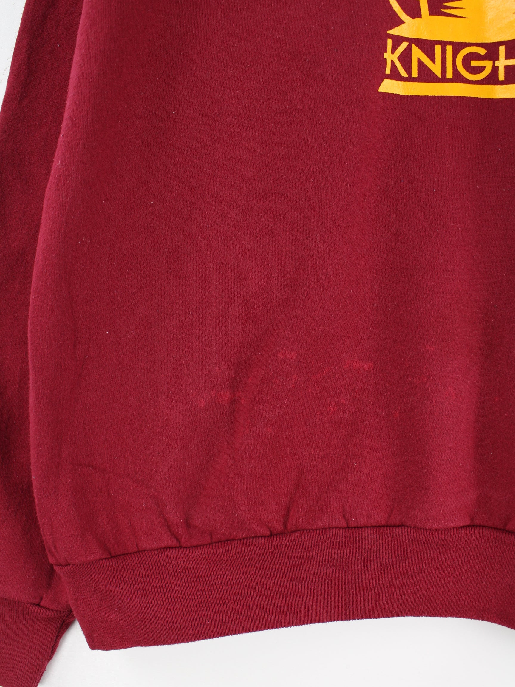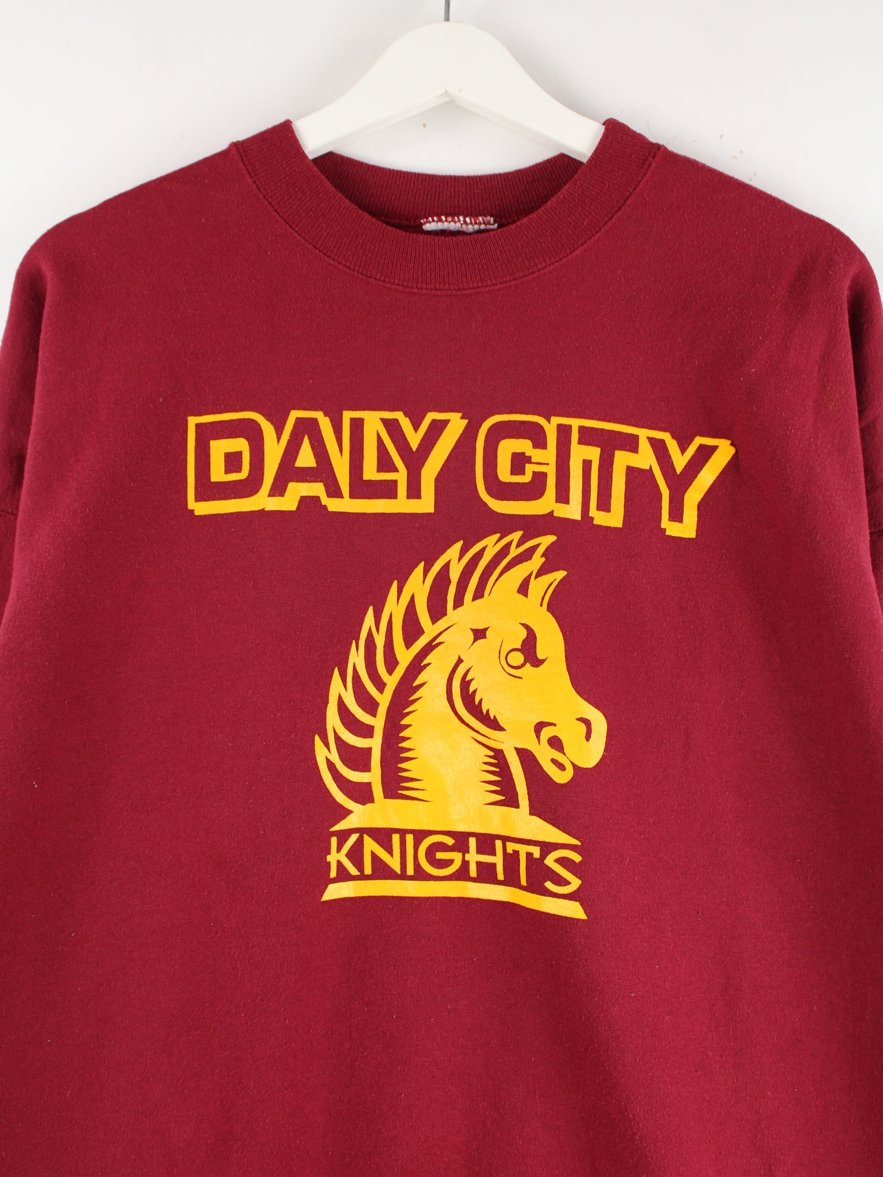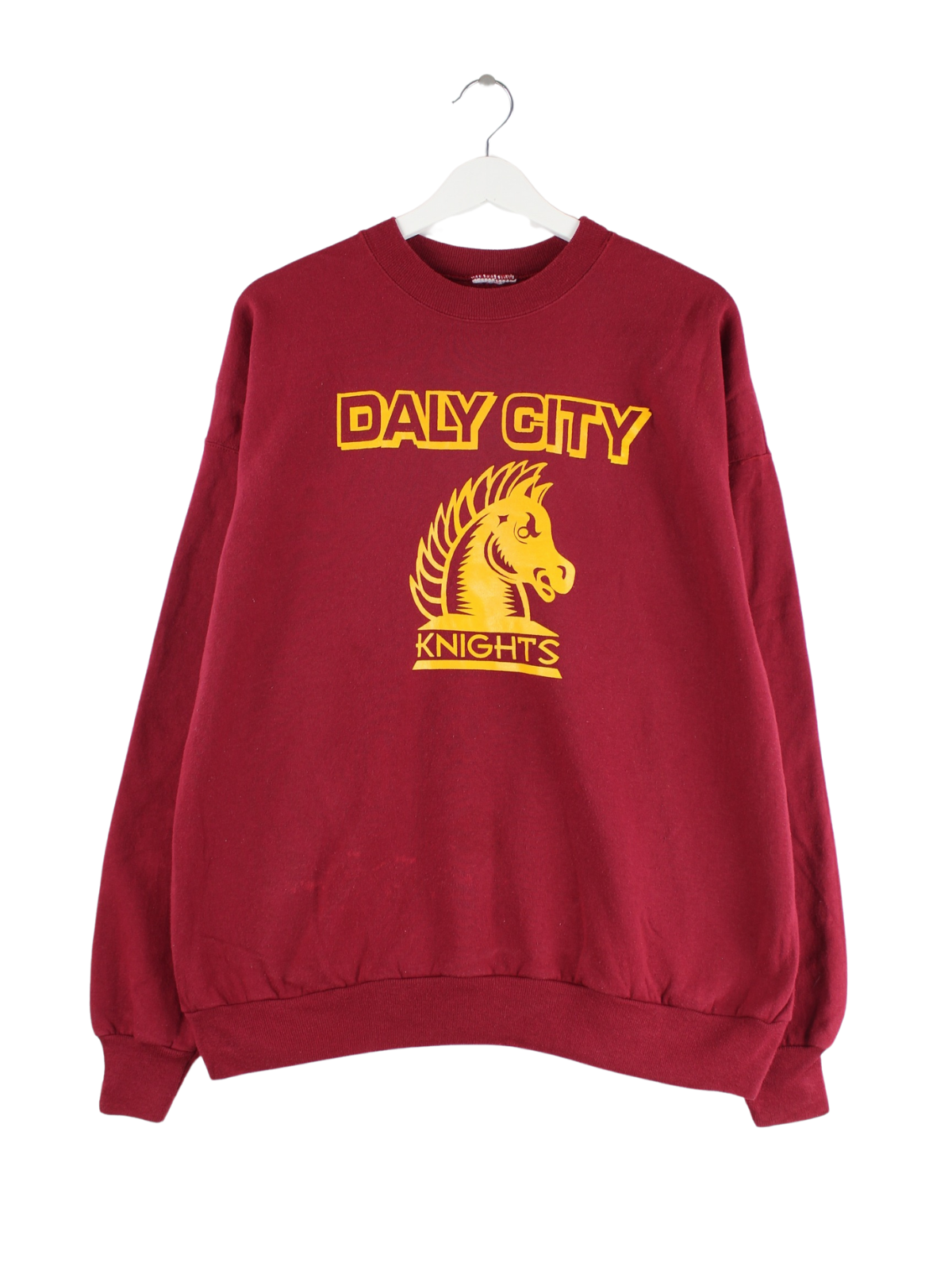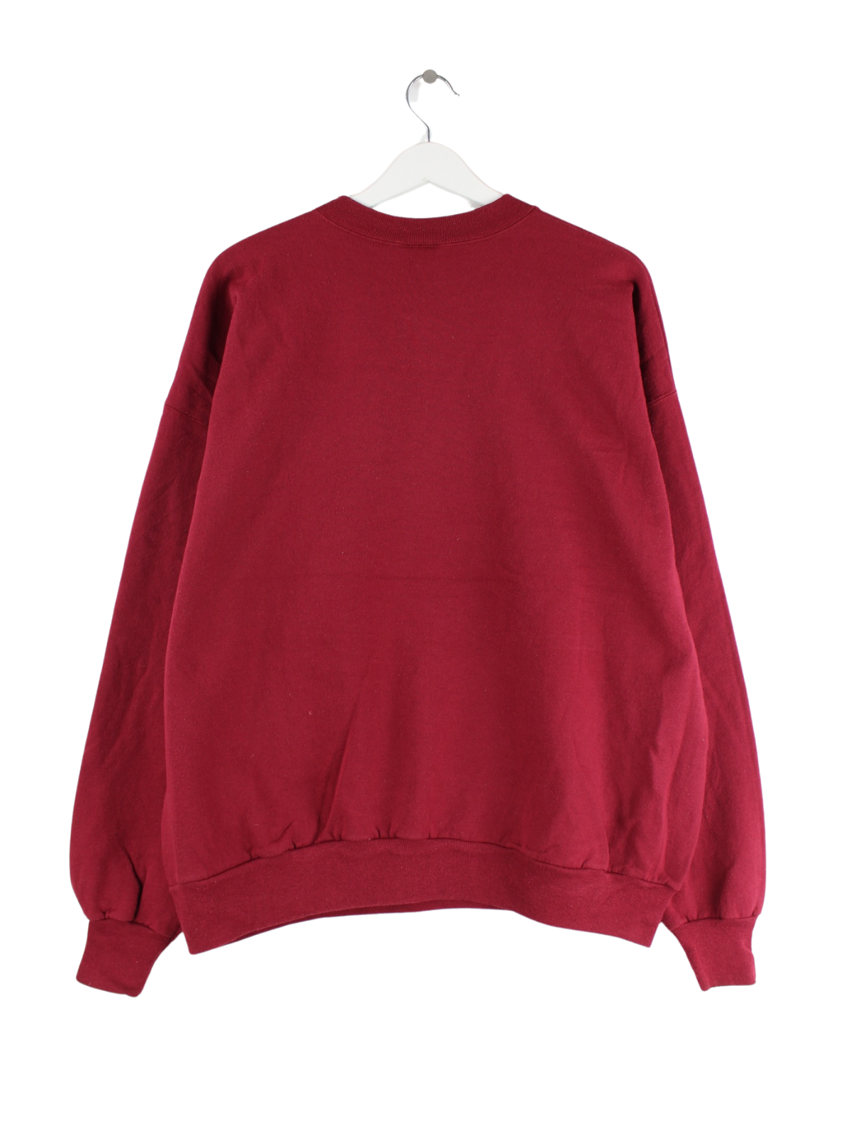 Roter Vintage Sweater aus den 90'ern in Größe L. Er ist aus einer Baumwollmischung gefertigt und in gutem Zustand im Bestand. Mit seltenem City Print.