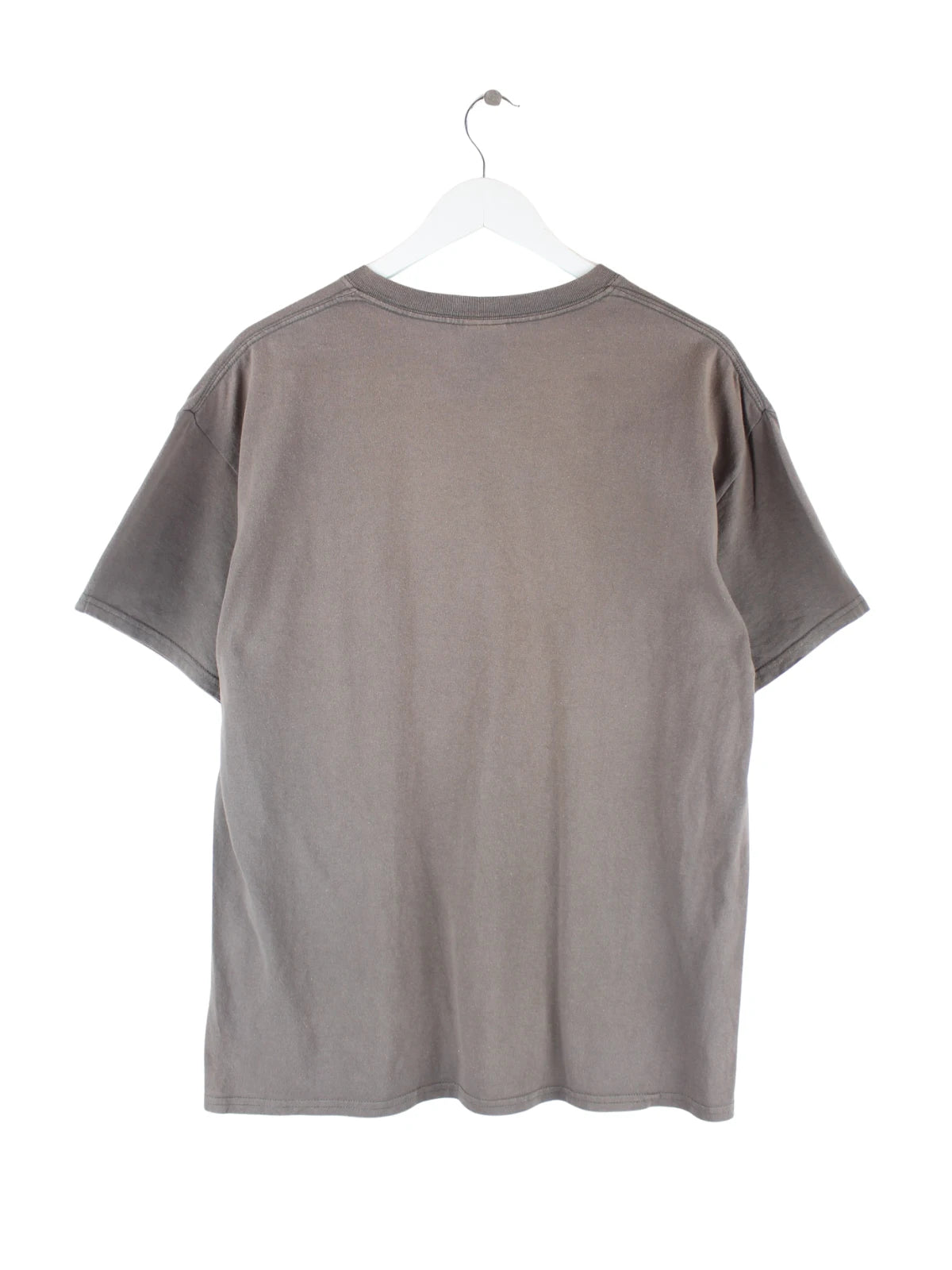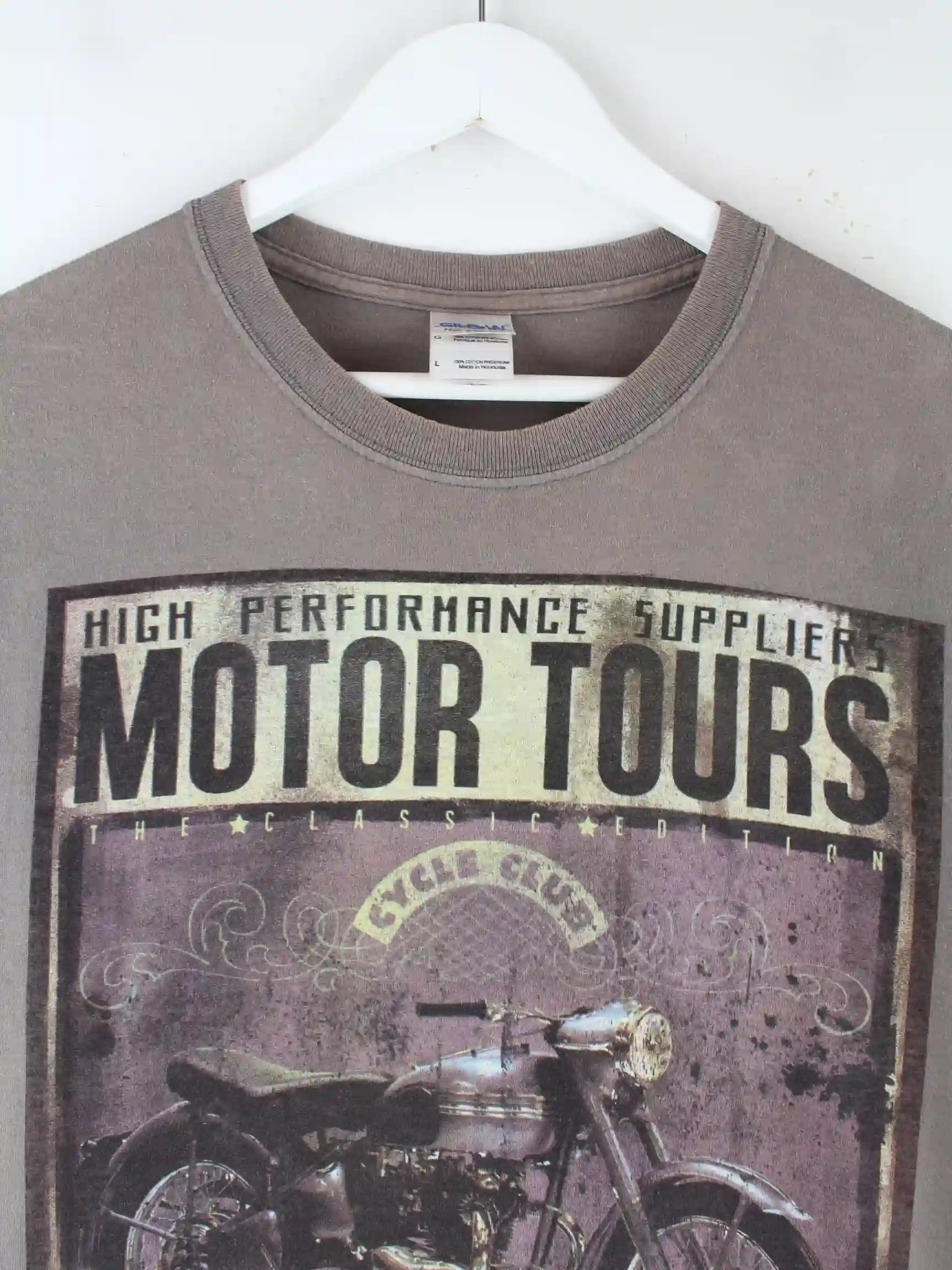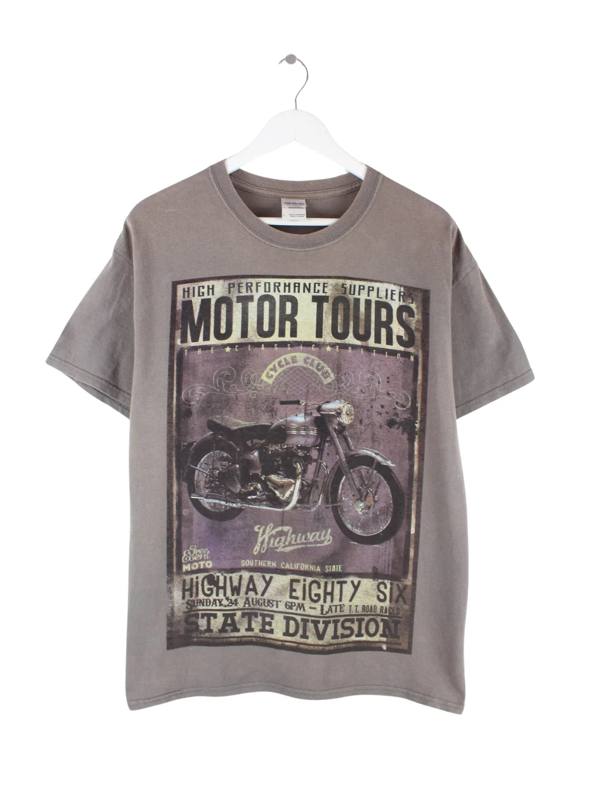 Braunes T-Shirt vom Brand Gildan in Größe L. Es ist aus Baumwolle hergestellt und in gutem Zustand im Angebot. Mit schönem Biker Print.