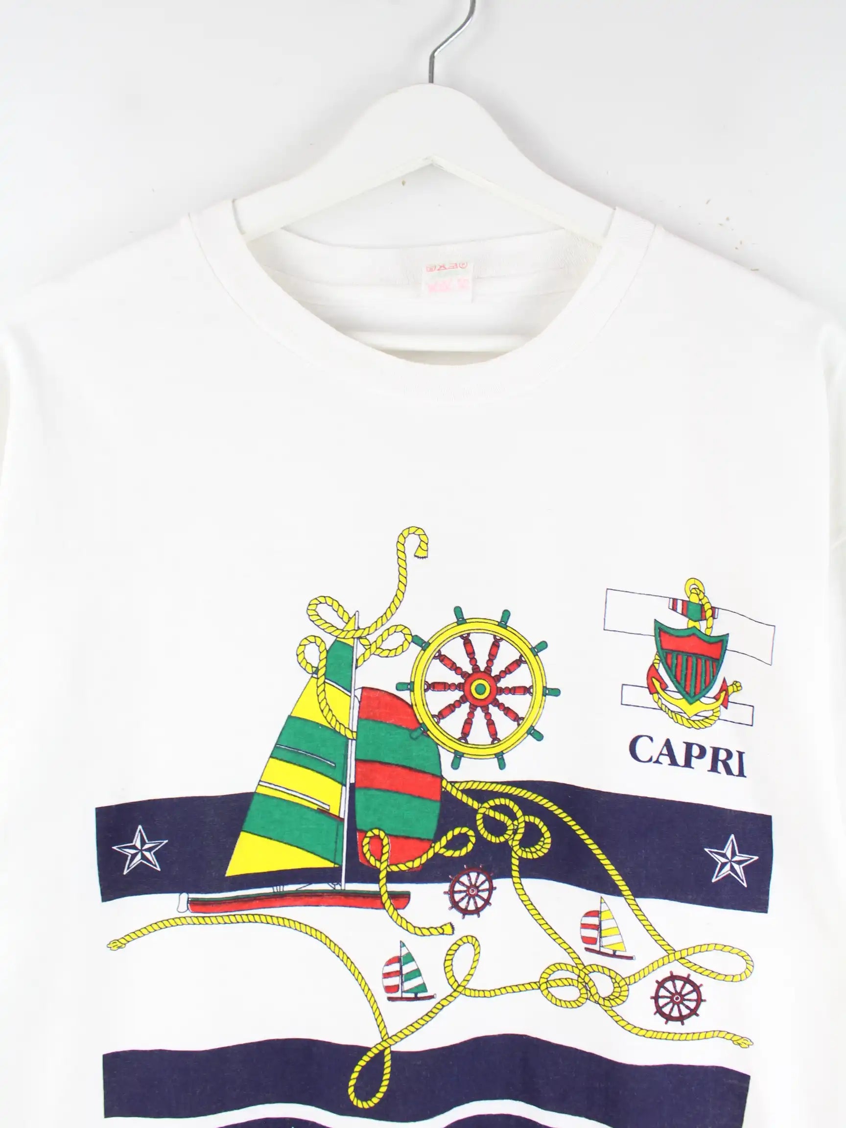 Weißes Vintage T-Shirt aus den 90'ern in Größe XL. Es ist aus Baumwolle angefertigt und in sehr gutem Zustand zu bekommen. Mit schönem Sailing Print.