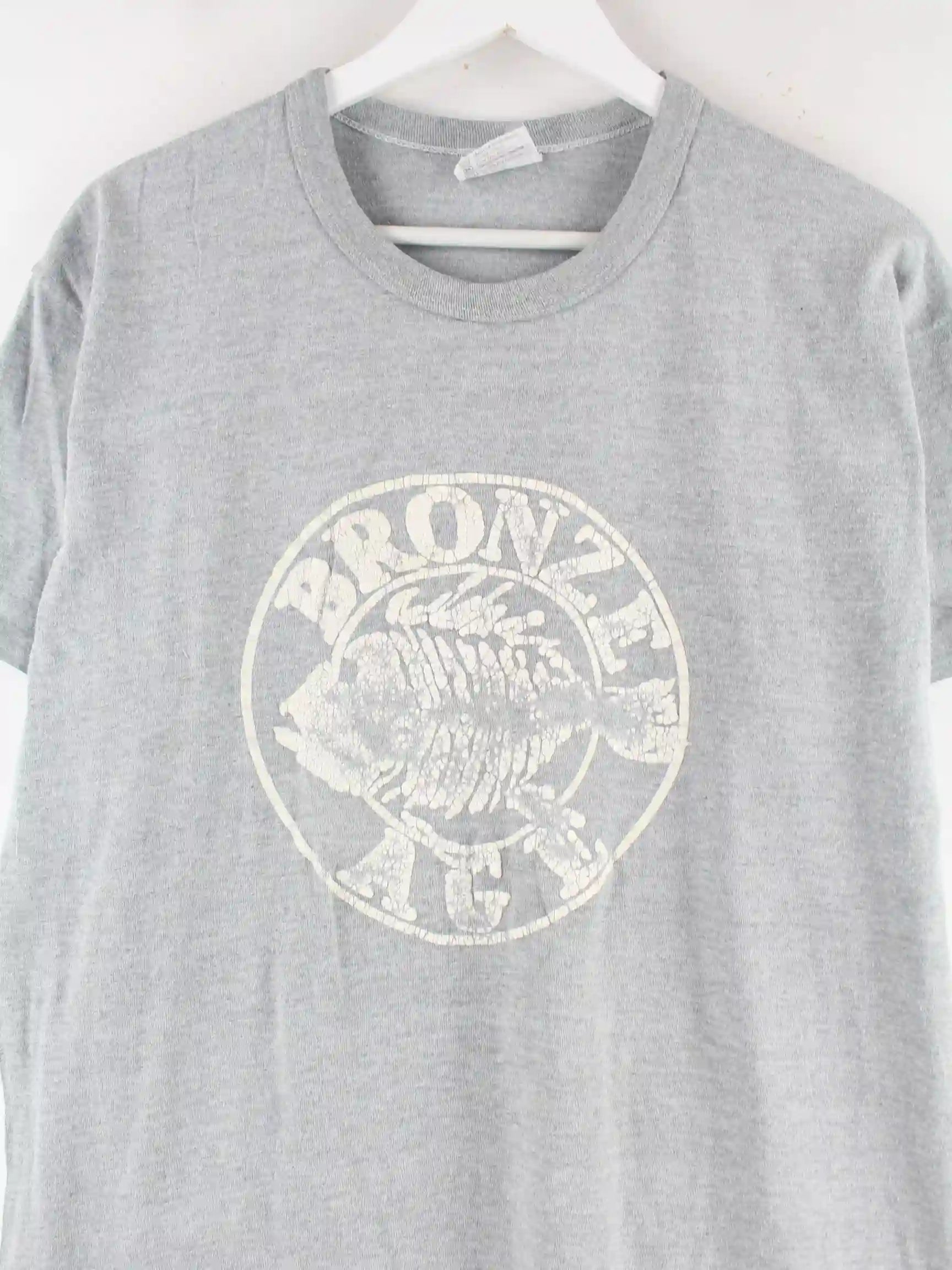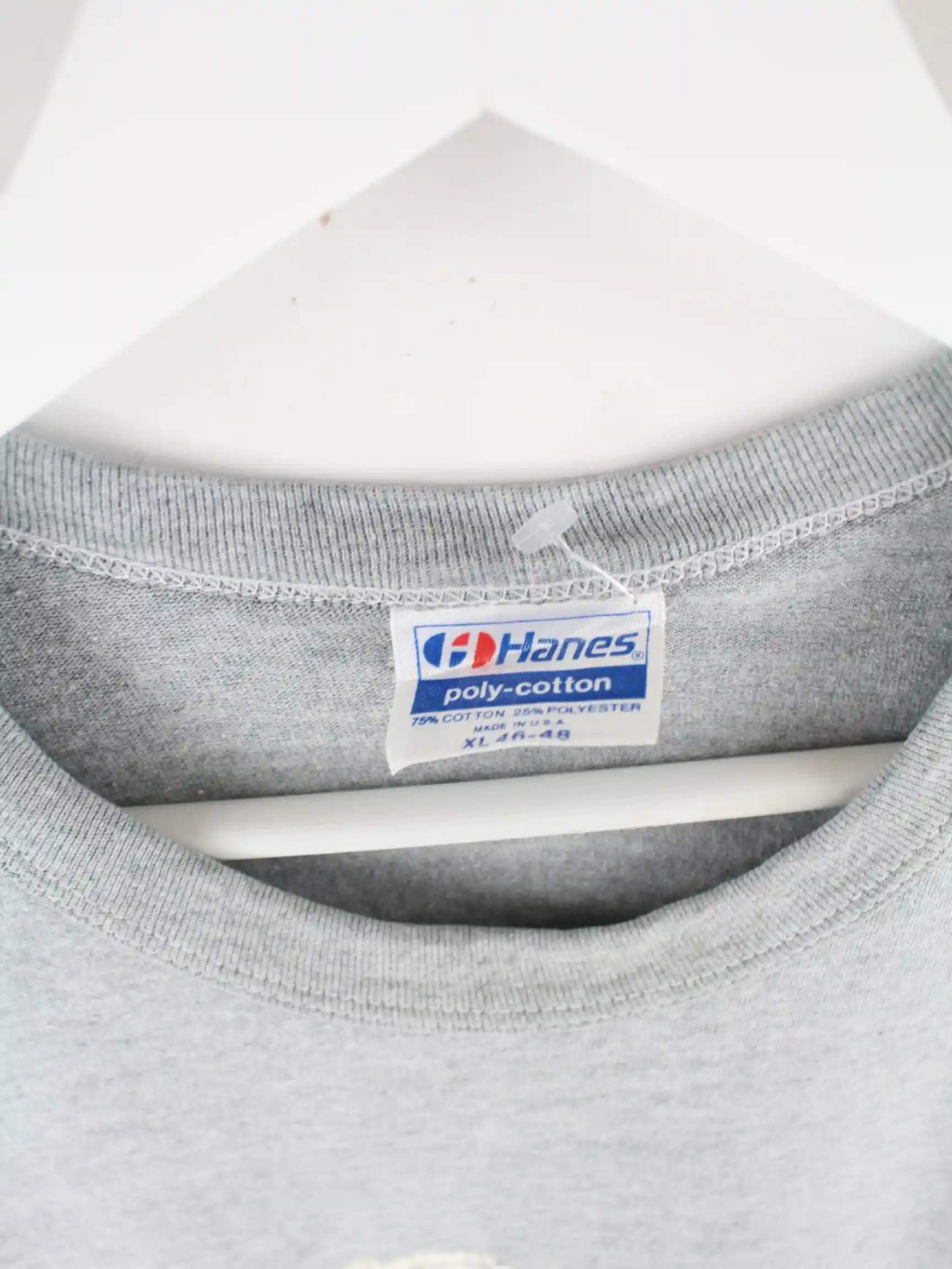 T-Shirt der Brand Hanes in Größe XL aus den 90'ern. Es ist aus Baumwolle gemacht und in Grau bei uns zu bekommen. Mit chiquem Vintage Print.