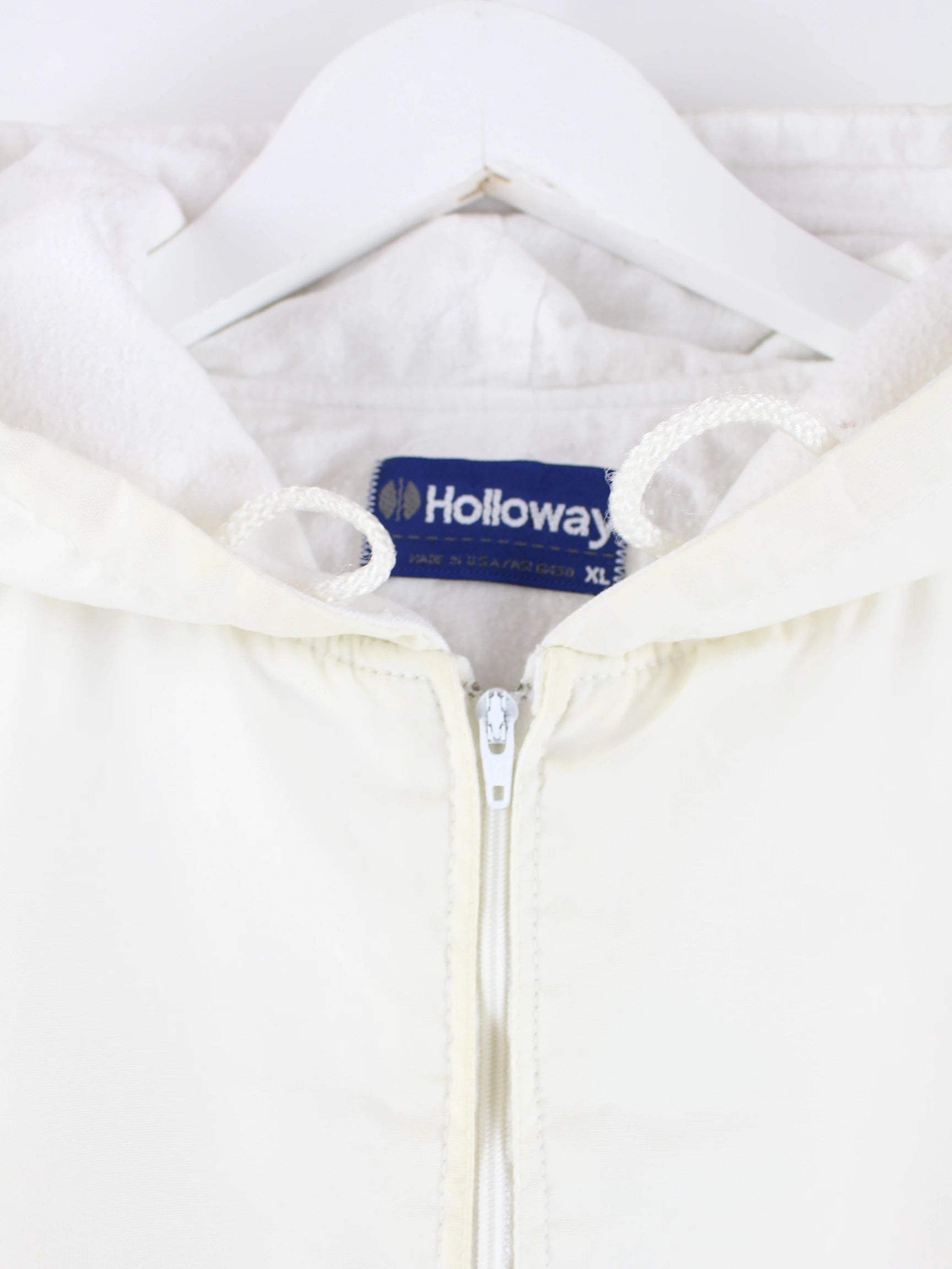 Weißer Windbreaker vom Label Holloway aus den 80'ern in Größe XL. Er ist aus Synthetik produziert. Den Zustand würden wir als 'In Ordnung' bezeichnen (vergl. Bilder).