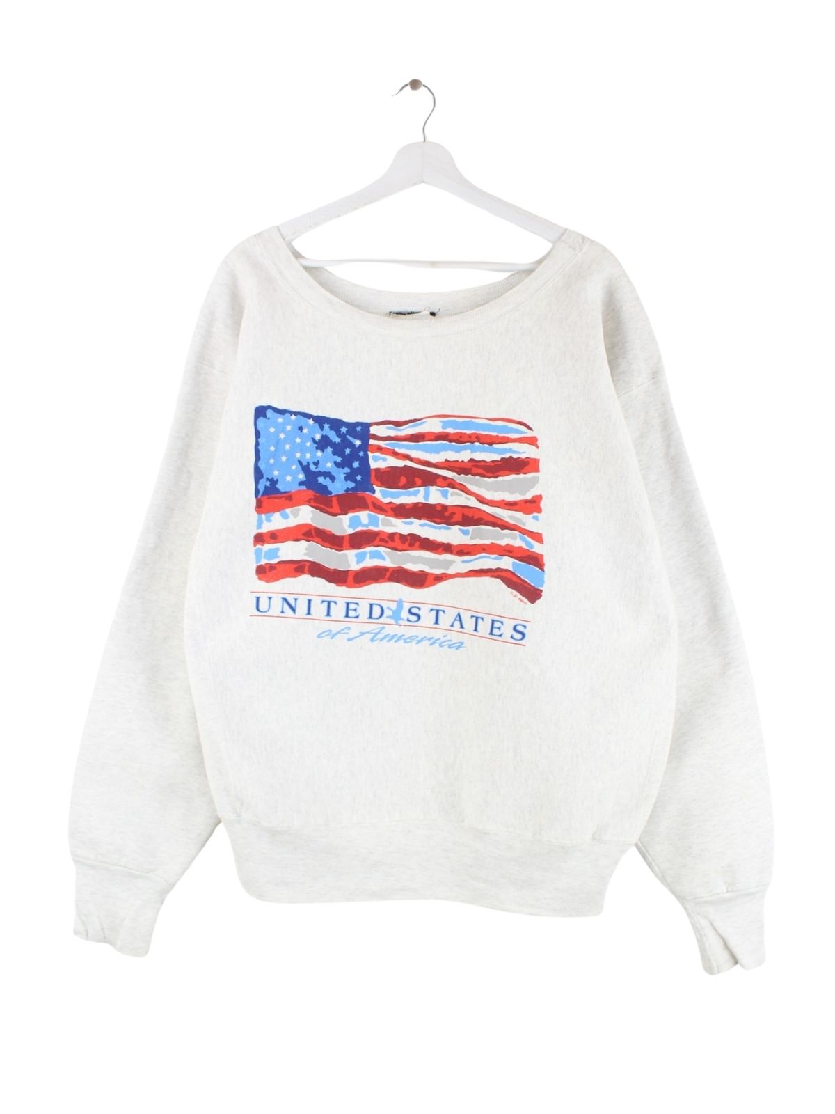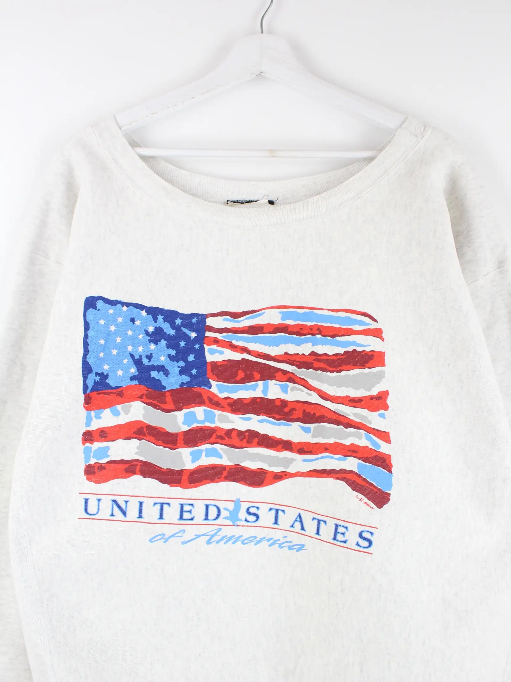 Grauer Vintage Sweater aus den 90'ern in Größe XXL. Er ist aus einer Baumwollmischung gefertigt. Den Zustand würden wir als 'In Ordnung' bezeichnen (vergl. Bilder).Mit schickem USA Print.