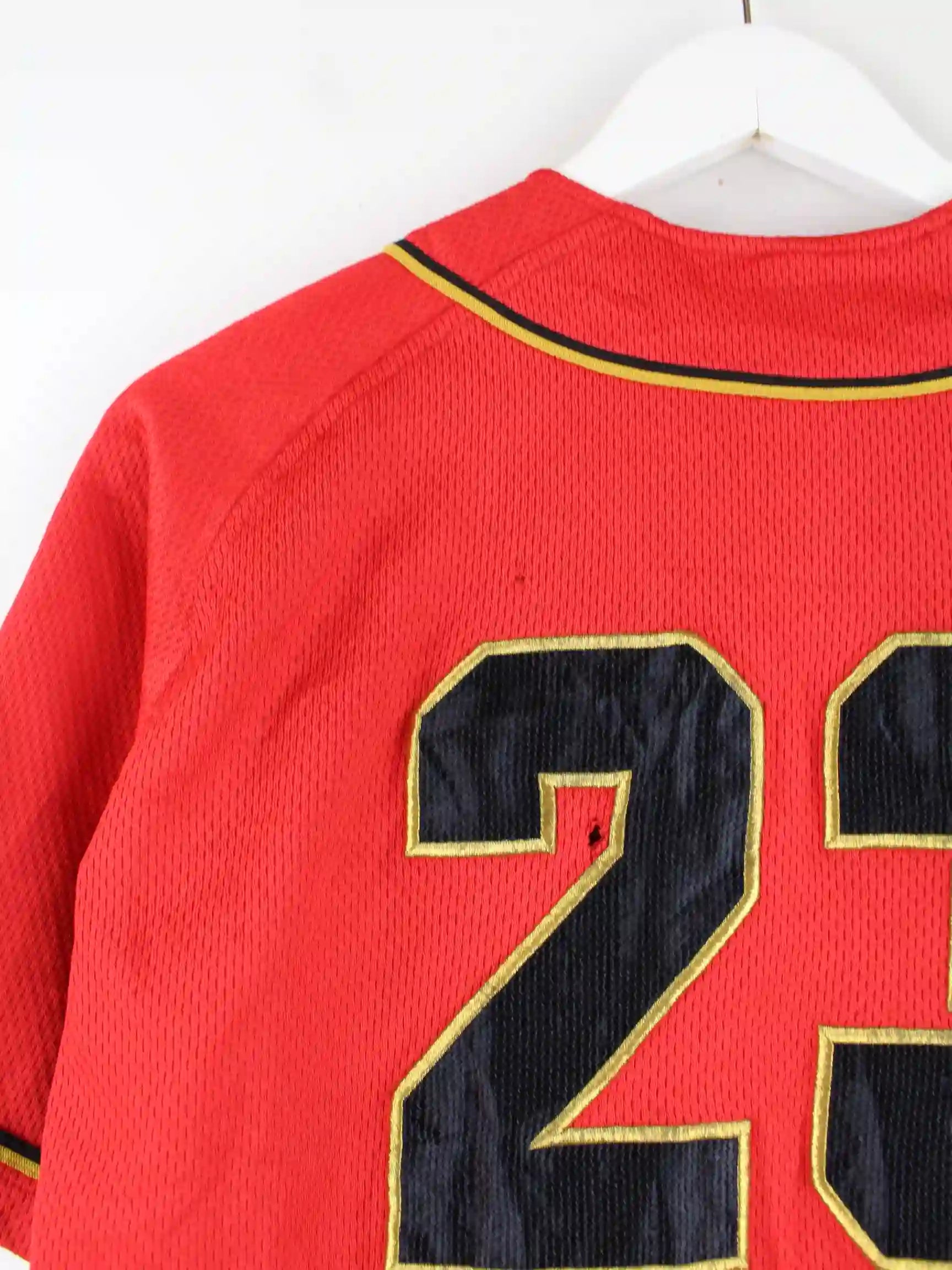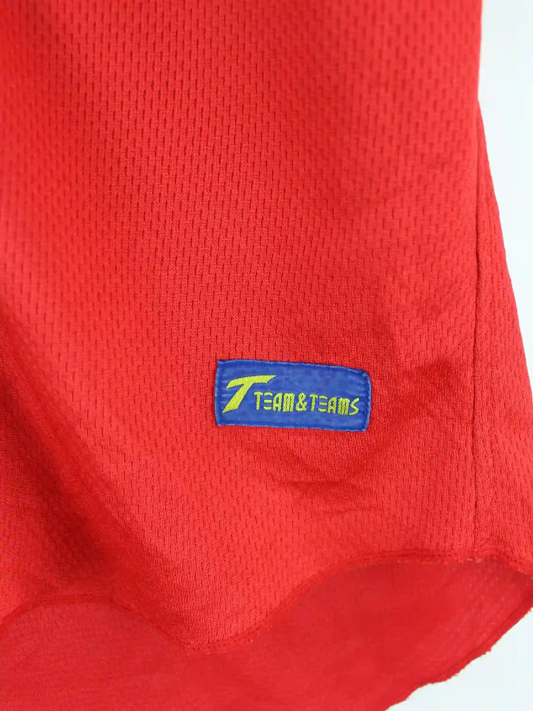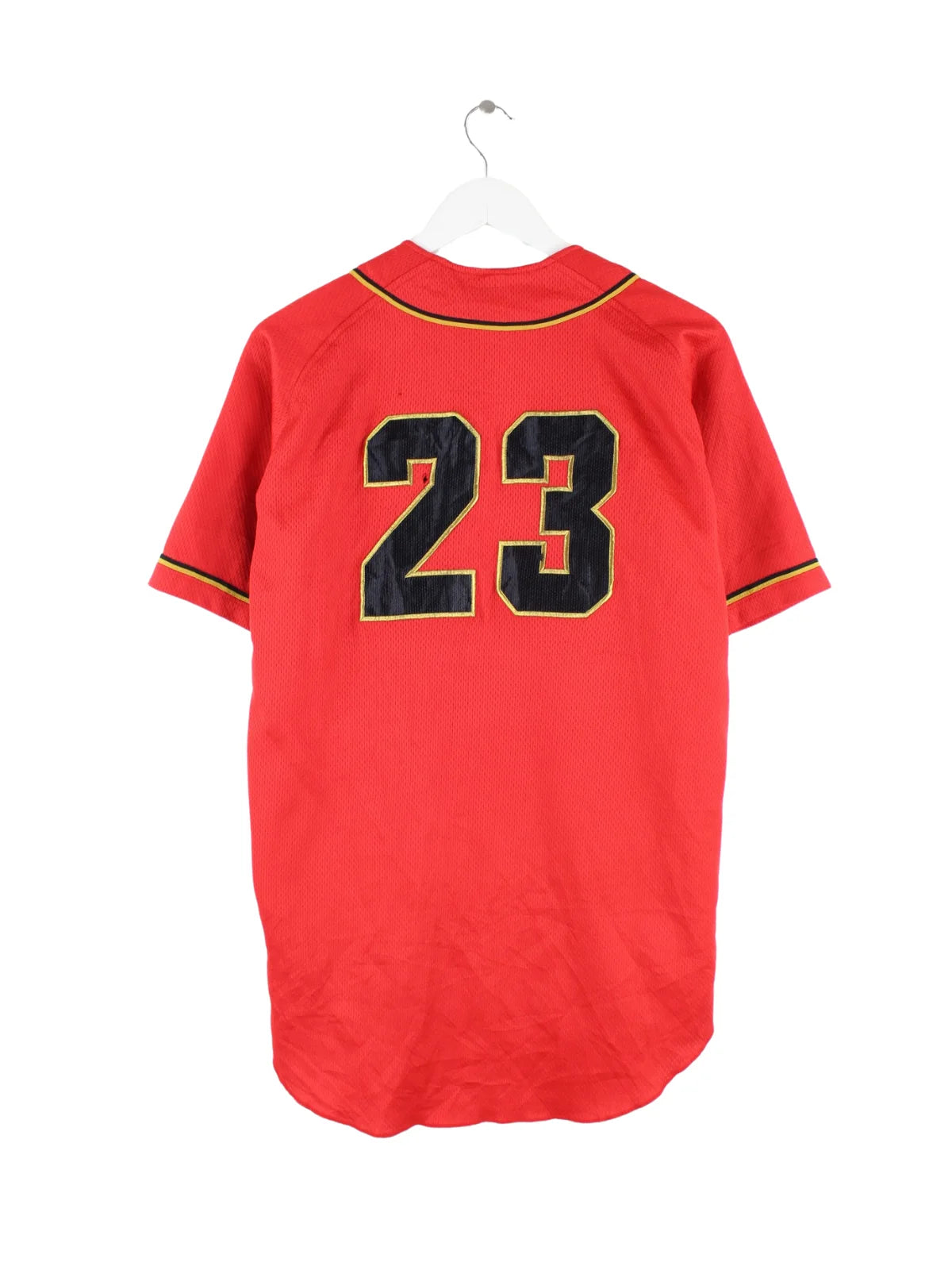 Roter Vintage Jersey aus den 90'ern in Größe M. Es ist aus Synthetik produziert. Den Zustand würden wir als 'In Ordnung' bezeichnen (vergl. Bilder).