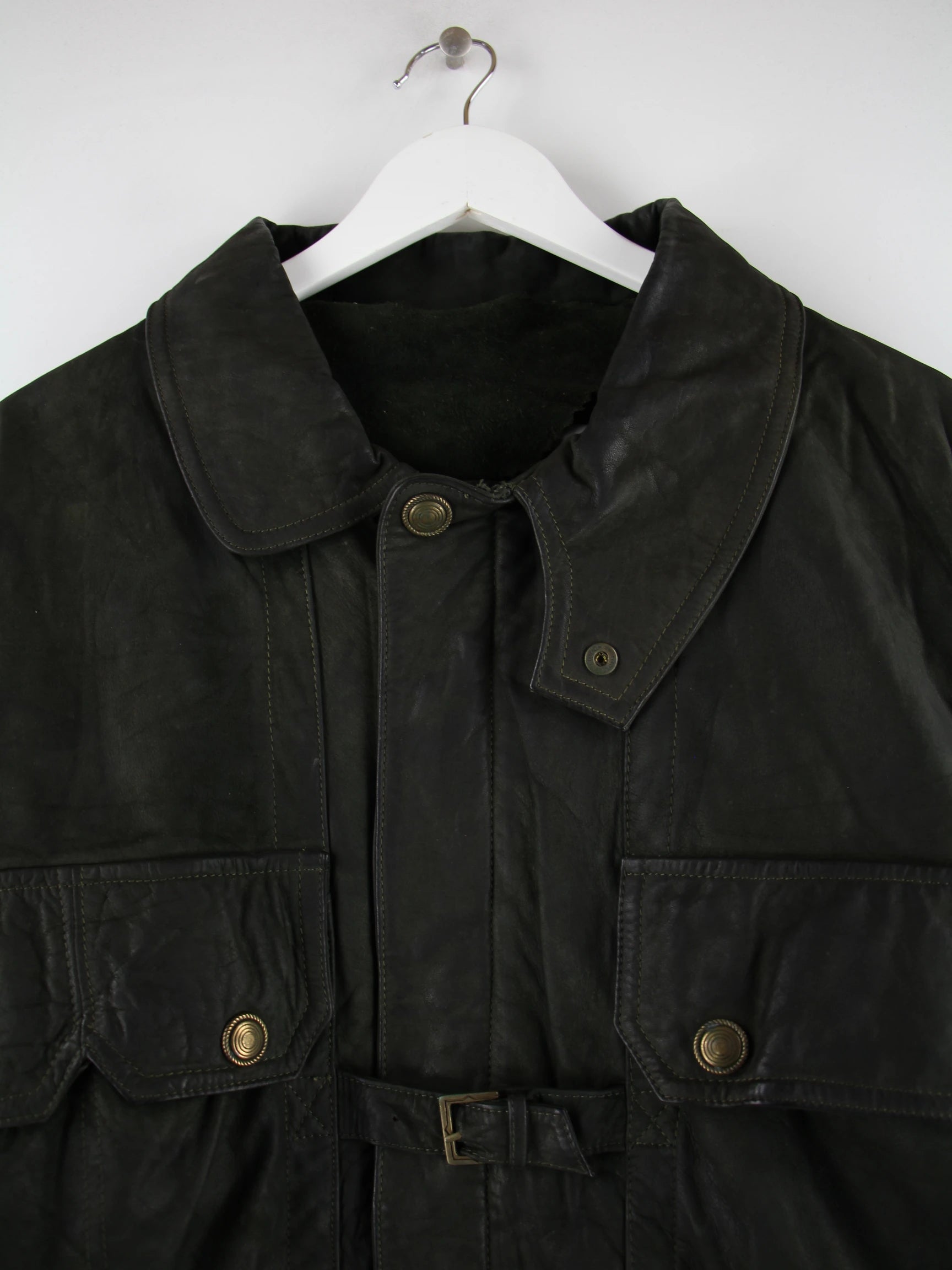 Grüne Vintage Jacke aus den 90'ern in Größe L. Sie ist aus Leder produziert. Den Zustand würden wir als 'In Ordnung' bezeichnen (vergl. Bilder).