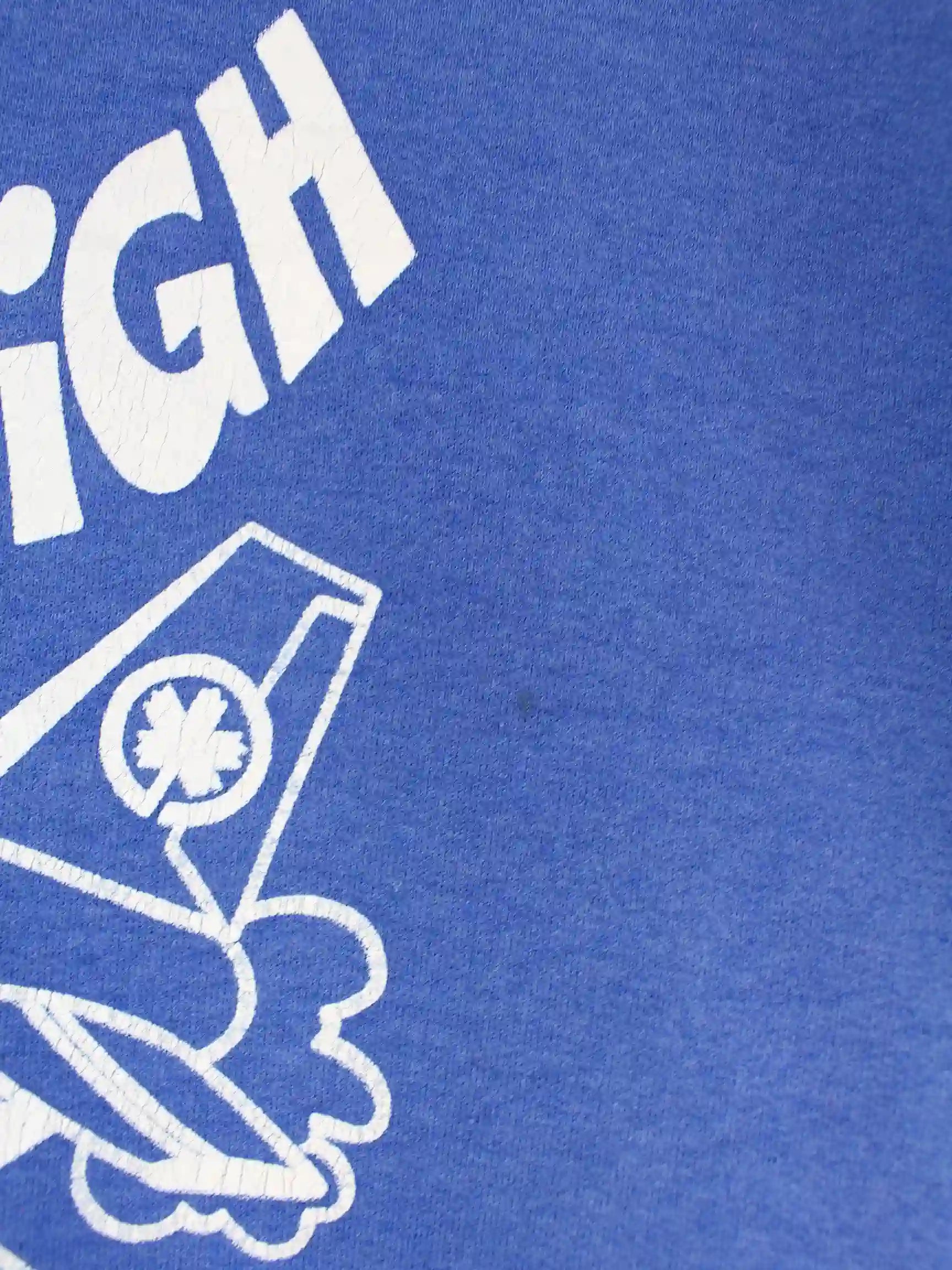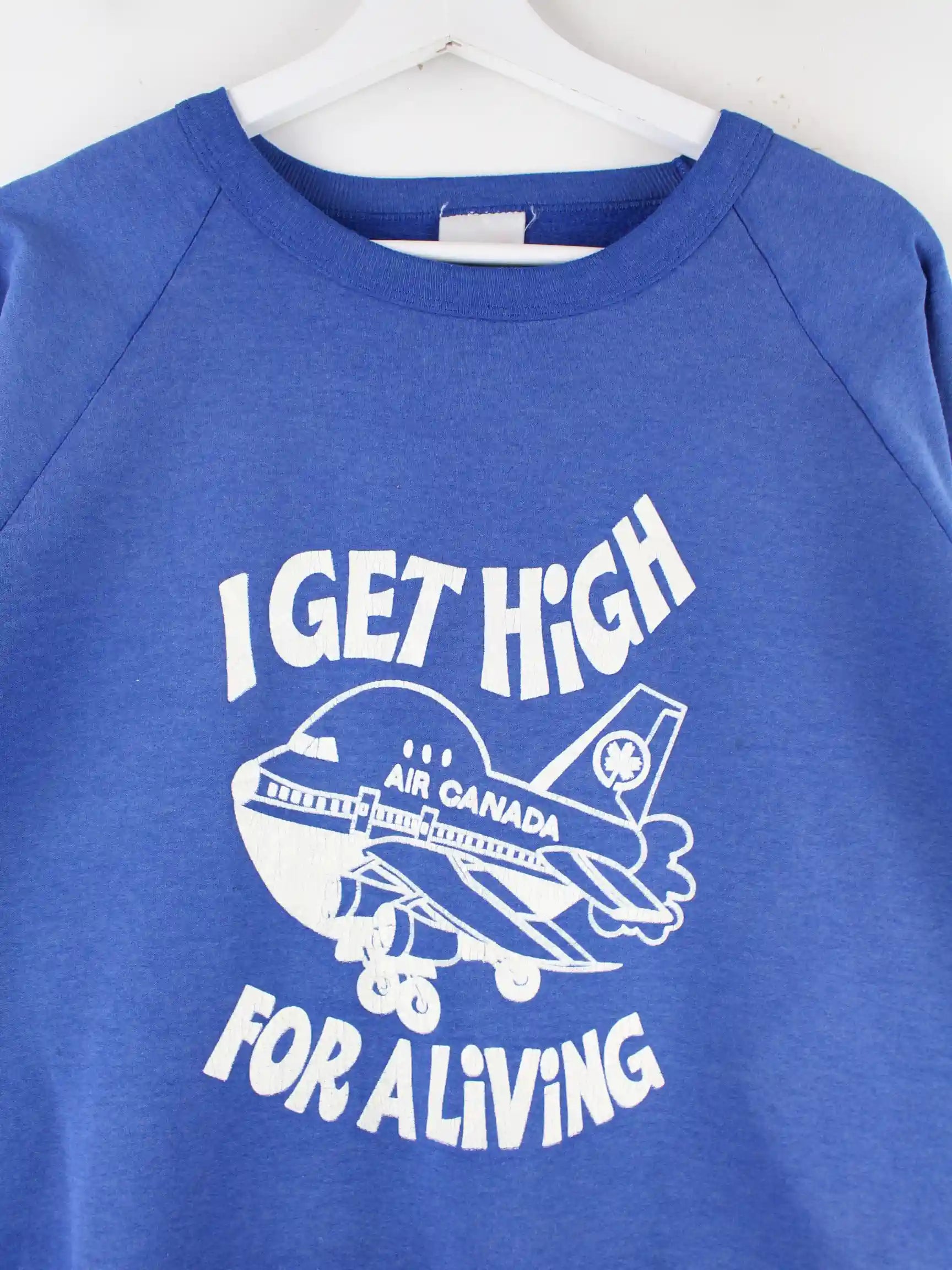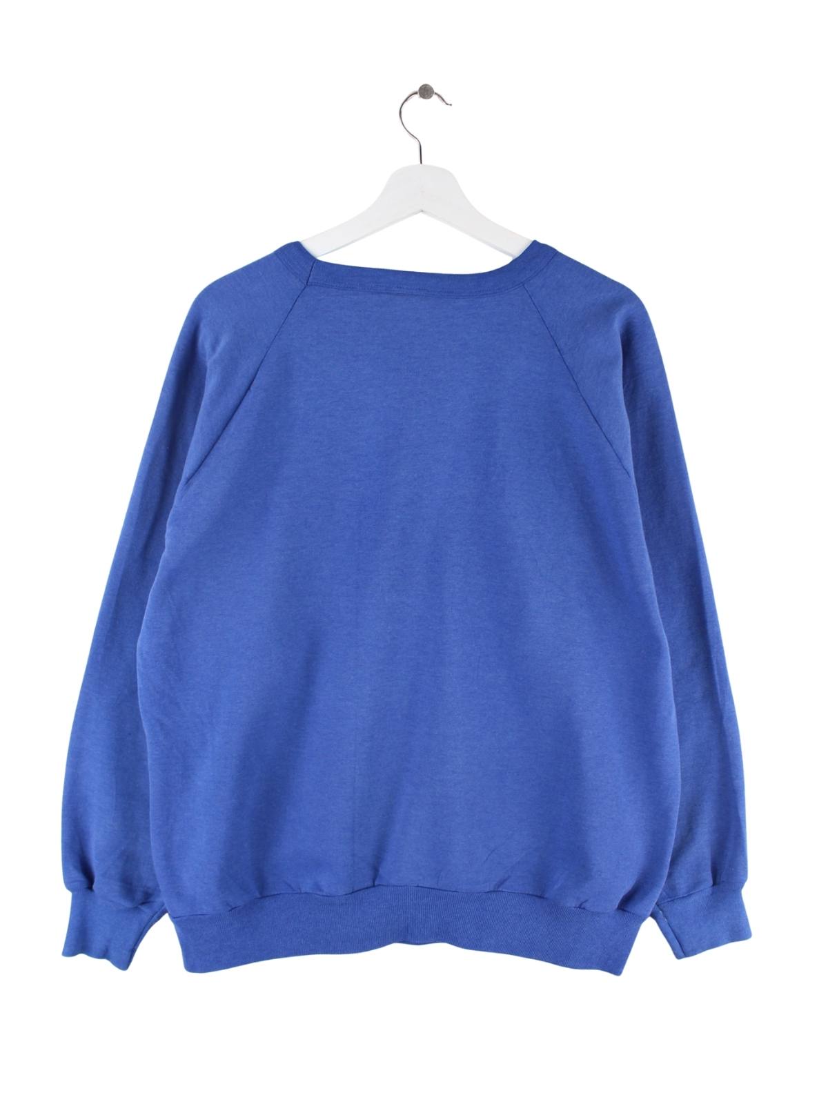 Blauer Vintage Sweater aus den 80'ern in Größe M. Er ist aus einer Baumwollmischung gemacht und in gutem Zustand bei uns vorrätig. Mit schickem Canada Print.