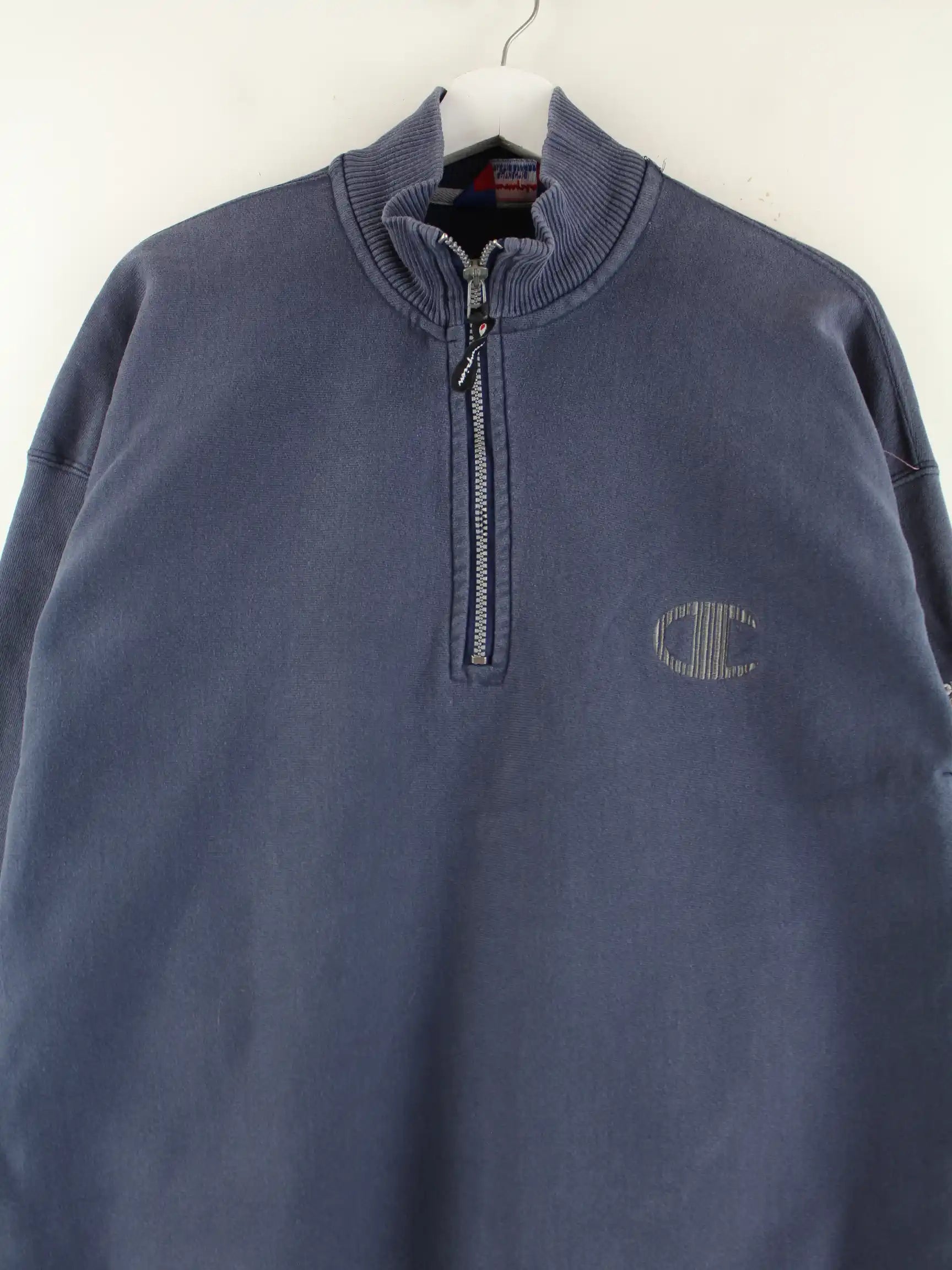 Sweater der Brand Champion mit kurzem Reißverschluß in Größe 3XL. Er ist aus einer Baumwollmischung produziert und in Blau in Stock.