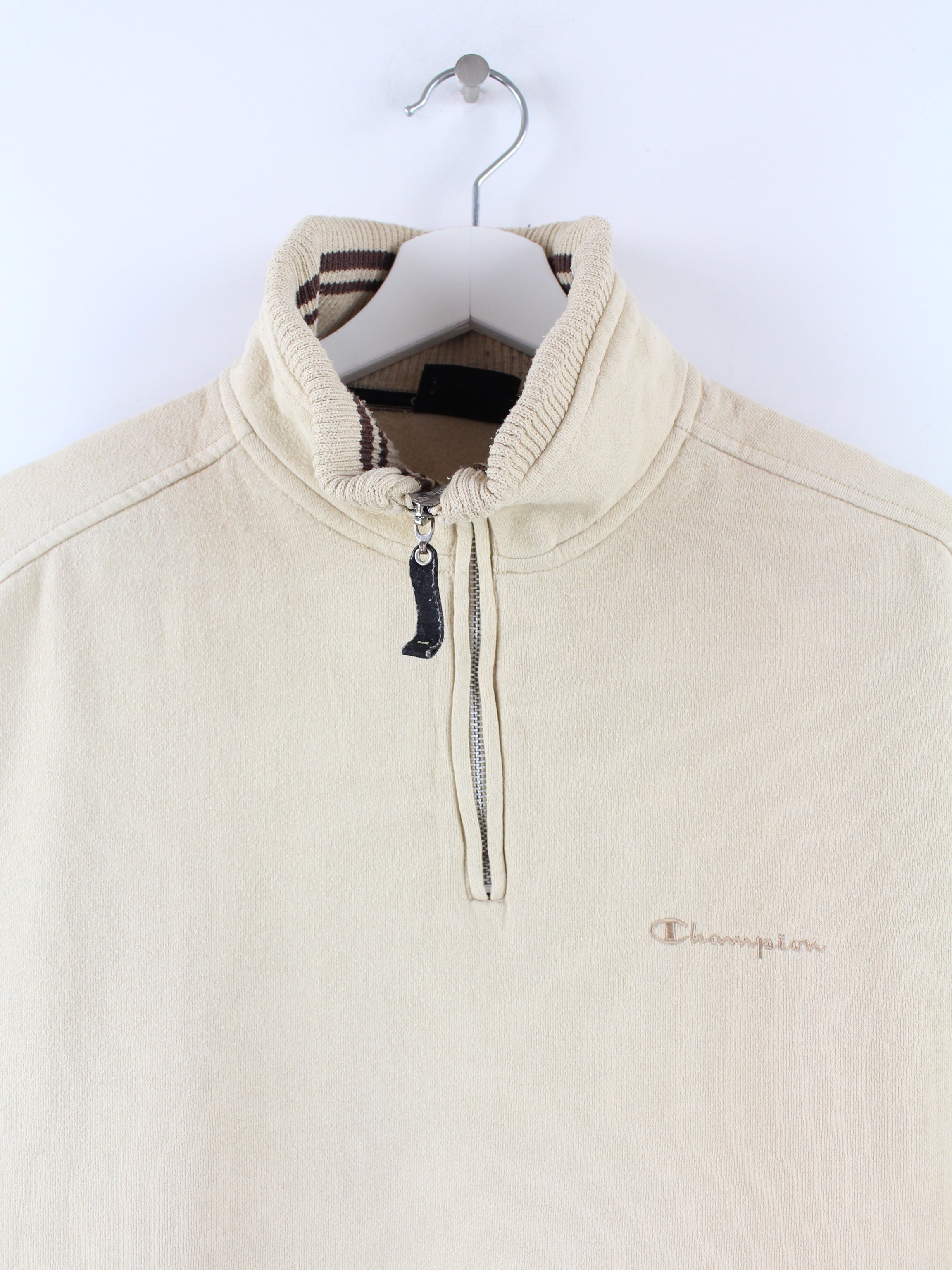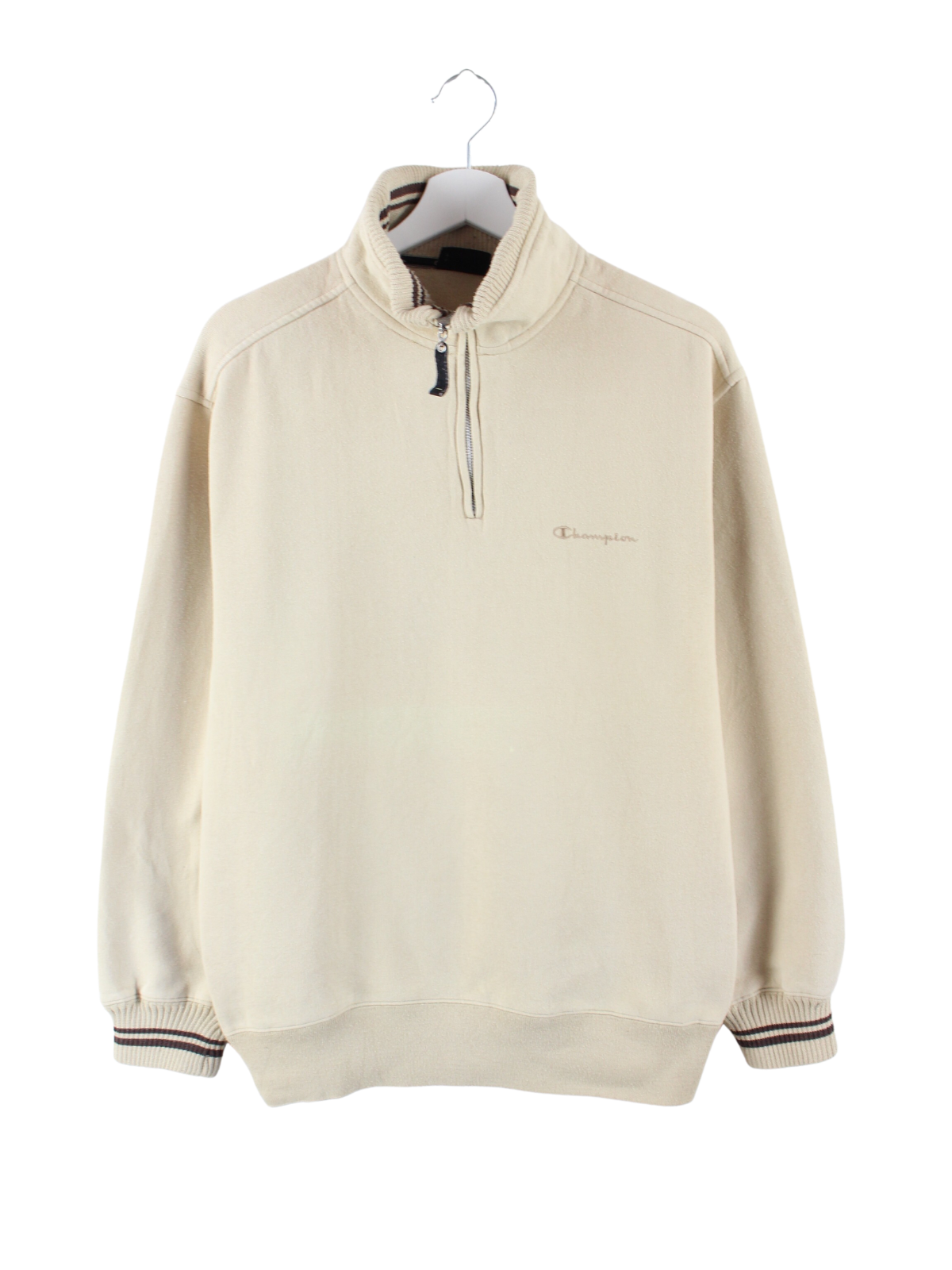 Beiger Champion Half Zip Sweater mit kleinem aufgesticktem Logo.