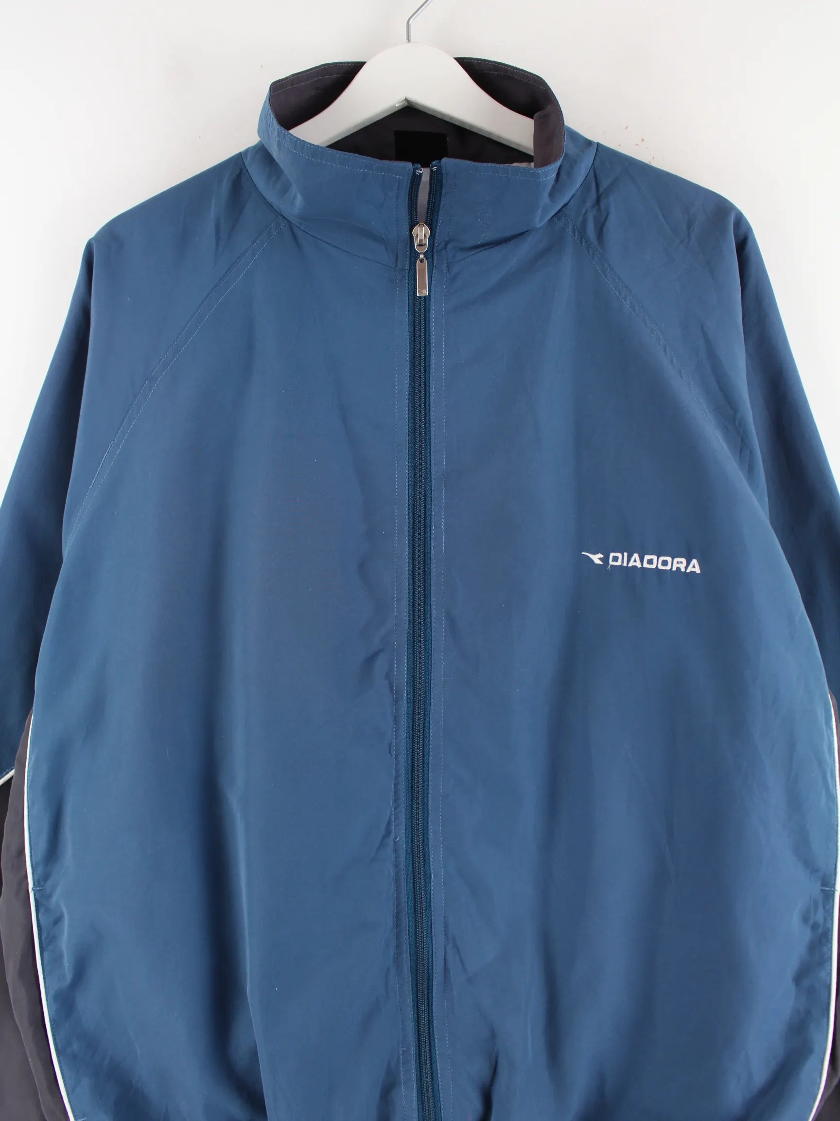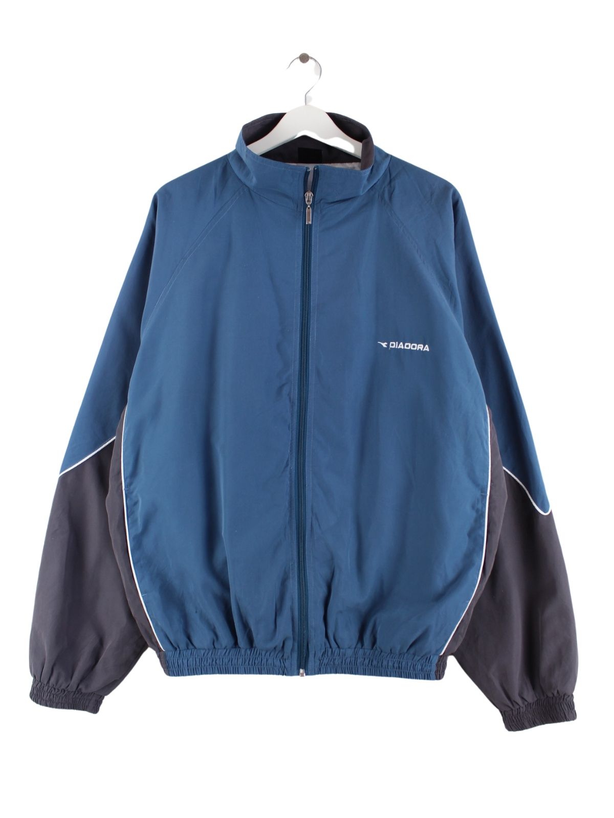 Blaue Trainingsjacke der Marke Diadora in Größe L. Sie ist aus Synthetik hergestellt und in gutem Zustand bei uns zu bekommen.