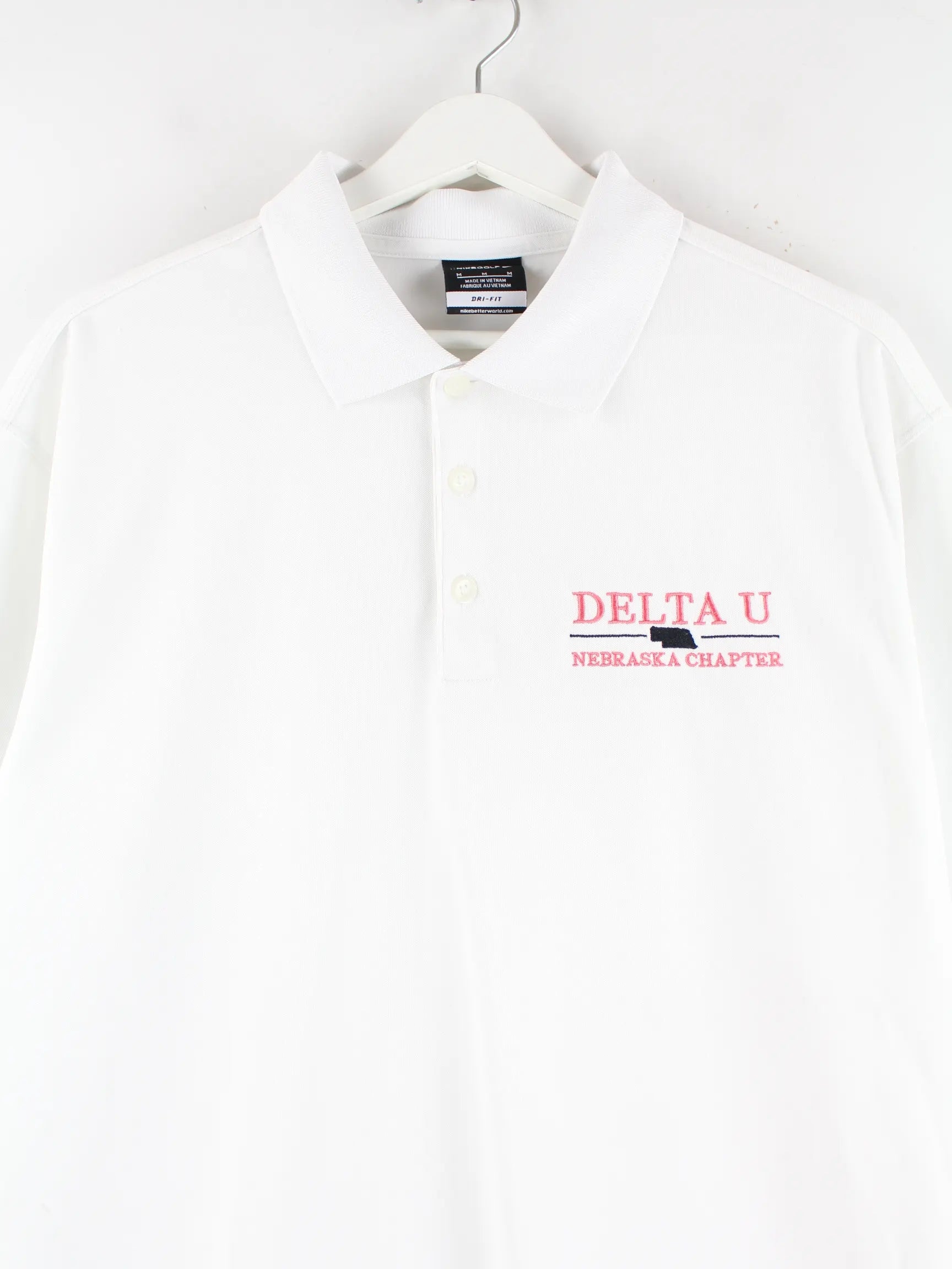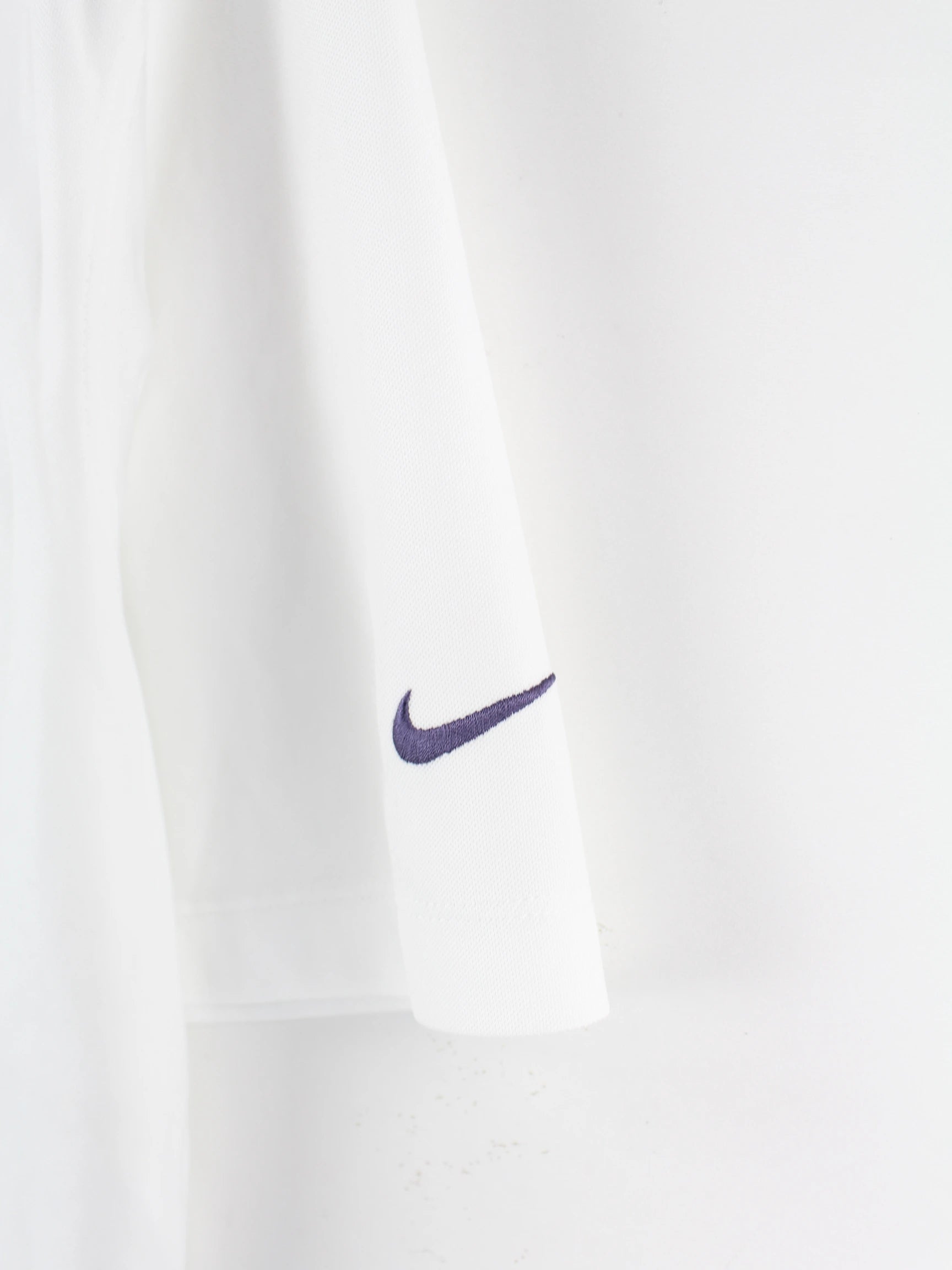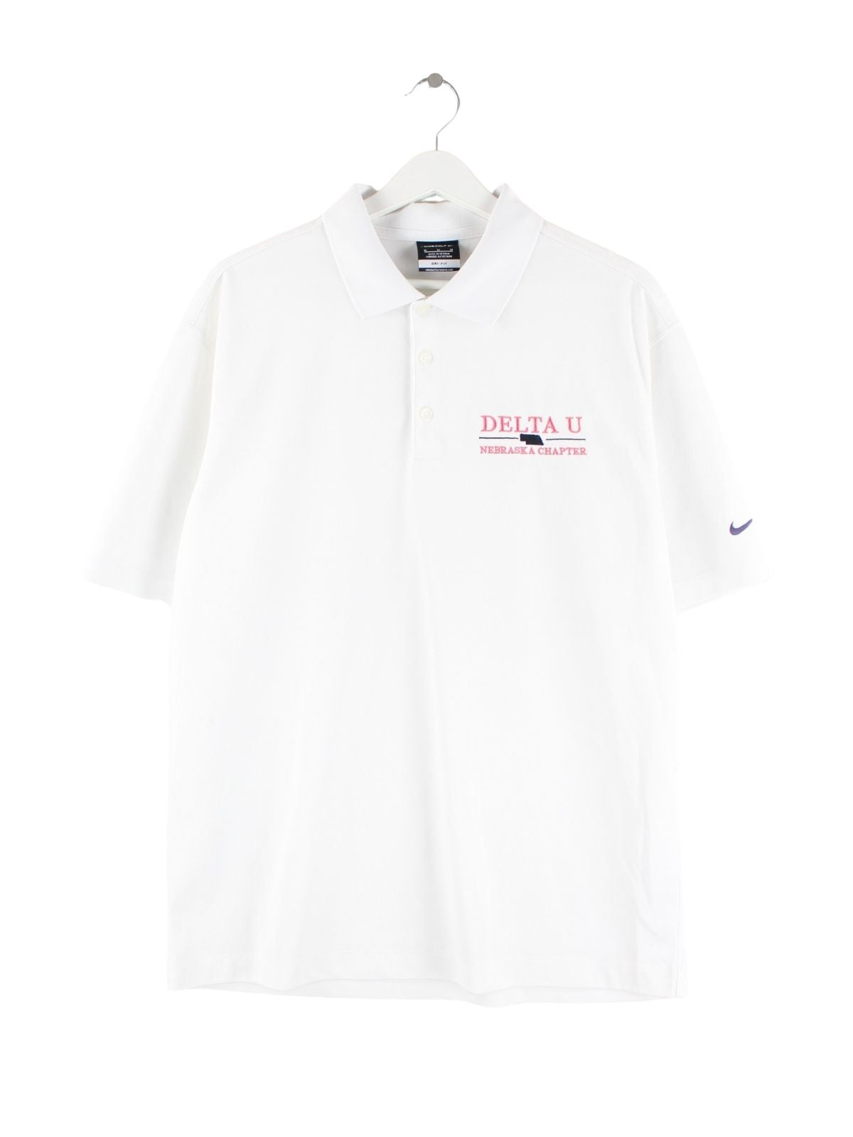 Weißes Poloshirt vom Label Nike in Größe M. Es ist aus Synthetik angefertigt und in gutem Zustand auf Lager.